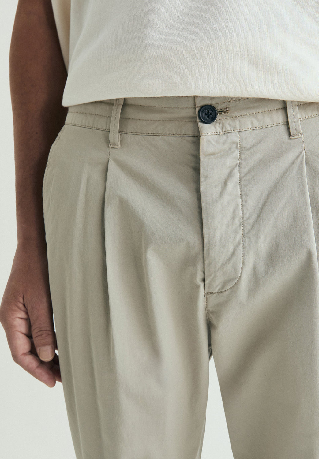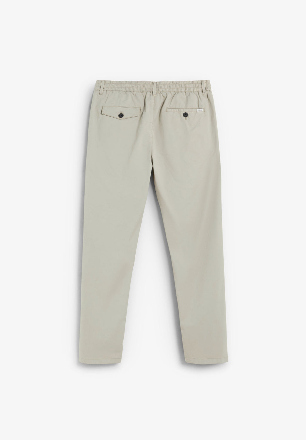 Trousers made of slightly stretchy cotton. Drawstring waist with belt loops. Slanted pockets and front darts.