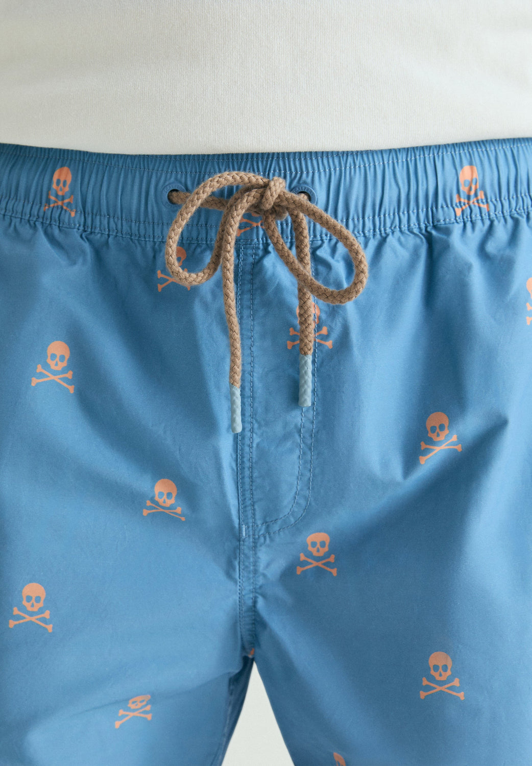 Swimming trunks with elasticated waistband and drawstring. Side pockets. Contrast skull print. Back pocket.