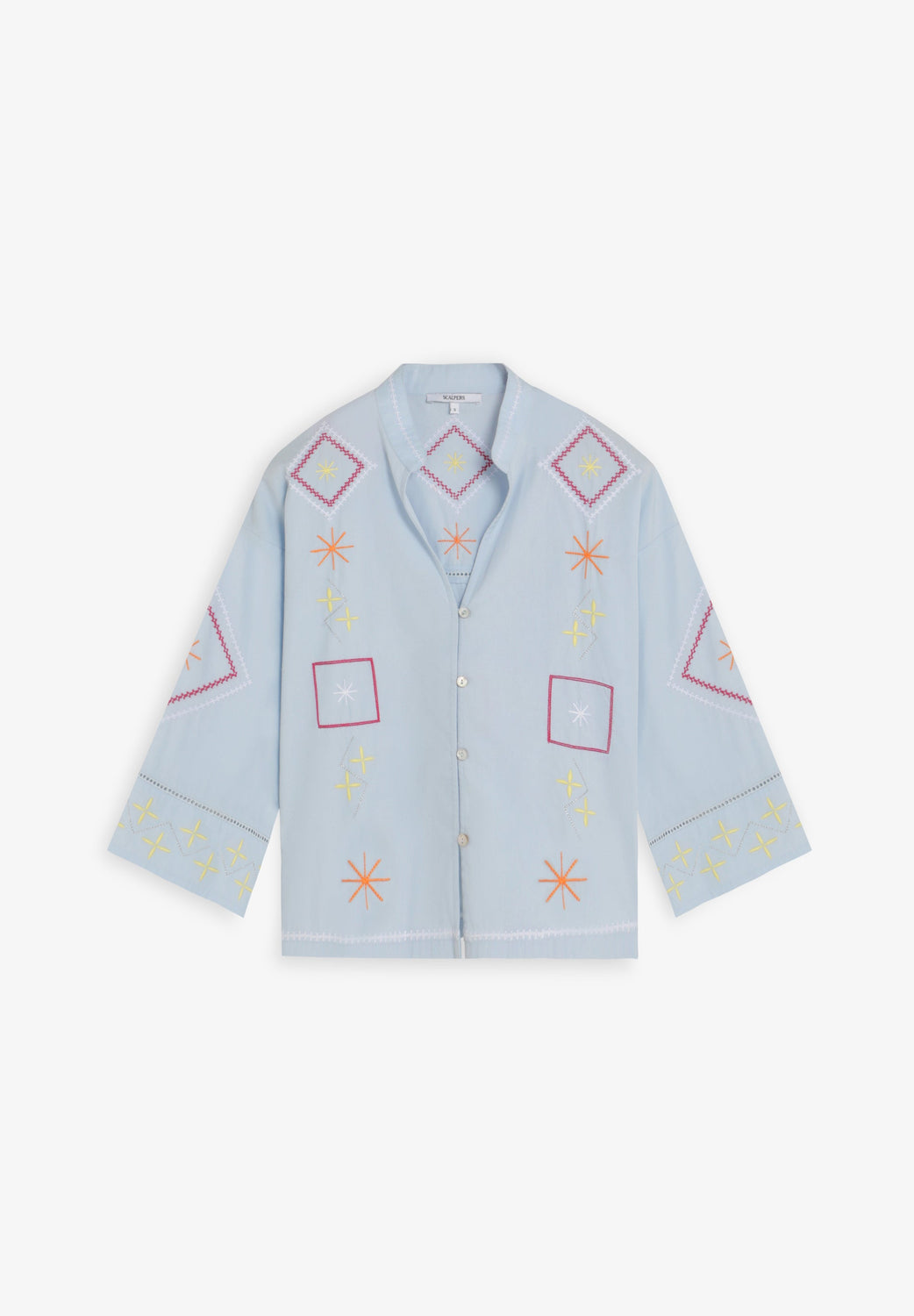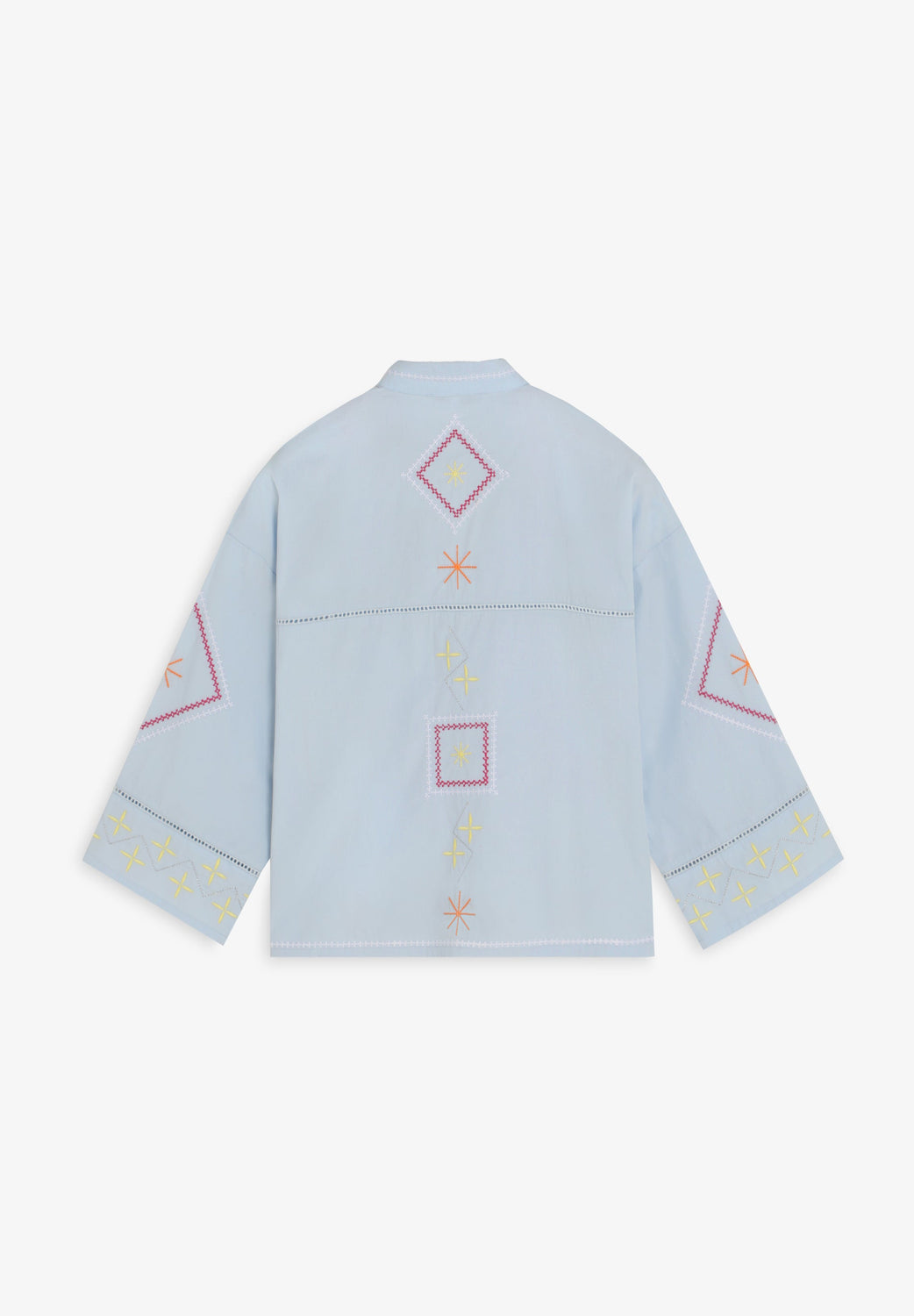 Shirt made of 100% cotton. Stand-up collar and long, wide sleeves. Multicoloured embroidery and openwork details on sleeves and back. Front button fastening.