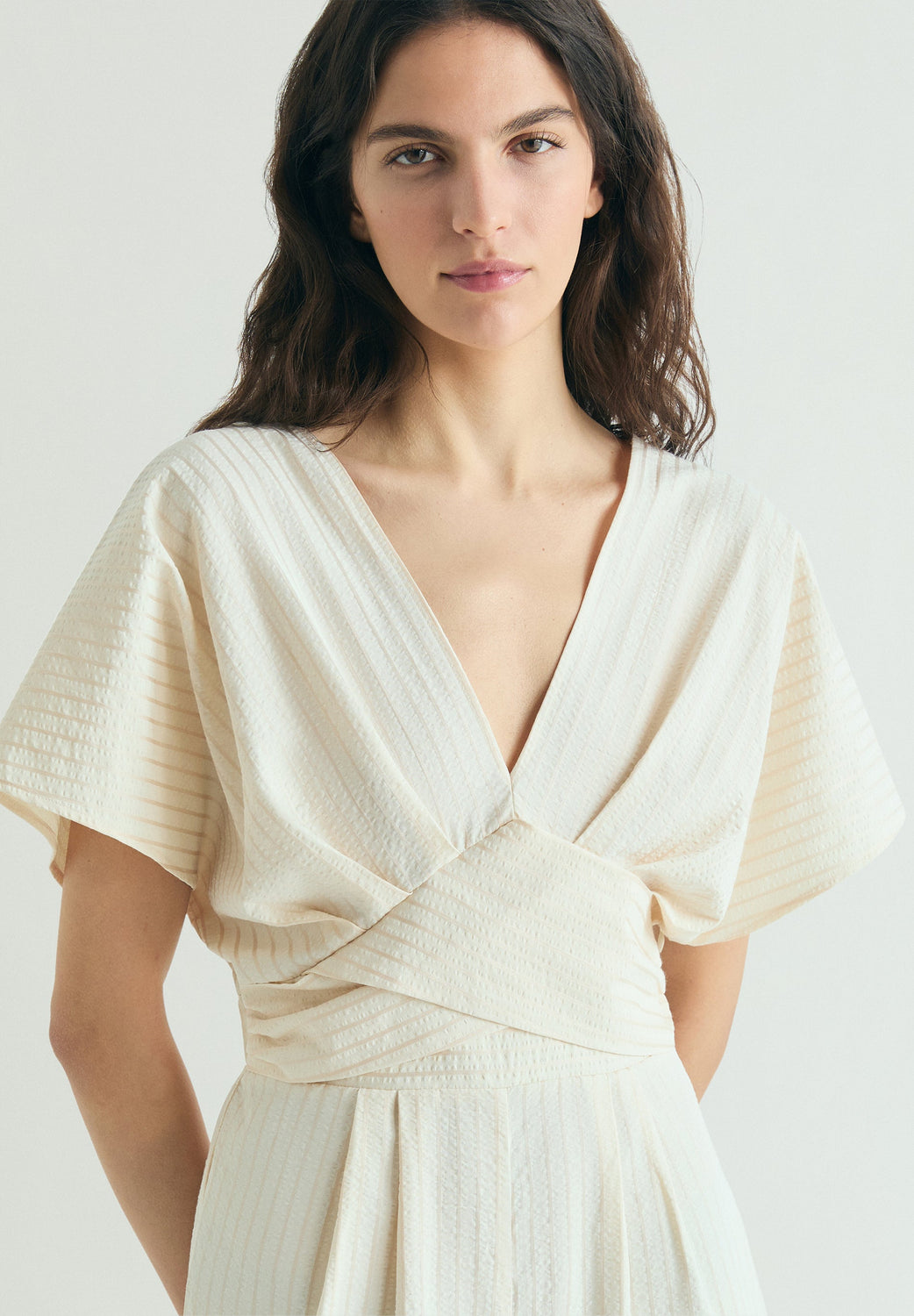 Jumpsuit made of flowing fabric. Regular fit, maxi length. V-neck and short flared sleeves. Crossover waist detail with elasticated adjuster and front darts. Stripe print.