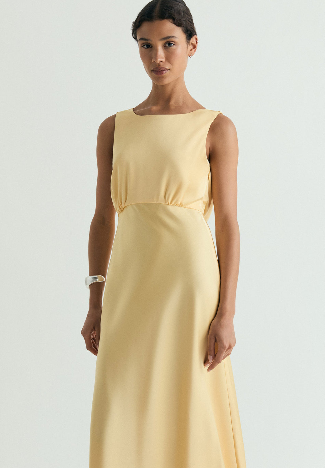 Midi dress in satin fabric. Sleeveless design with wide neckline. Waist seam and flowing skirt. Open back with draped detail and fine tie at the back of the neck. Side fastening with invisible zip.