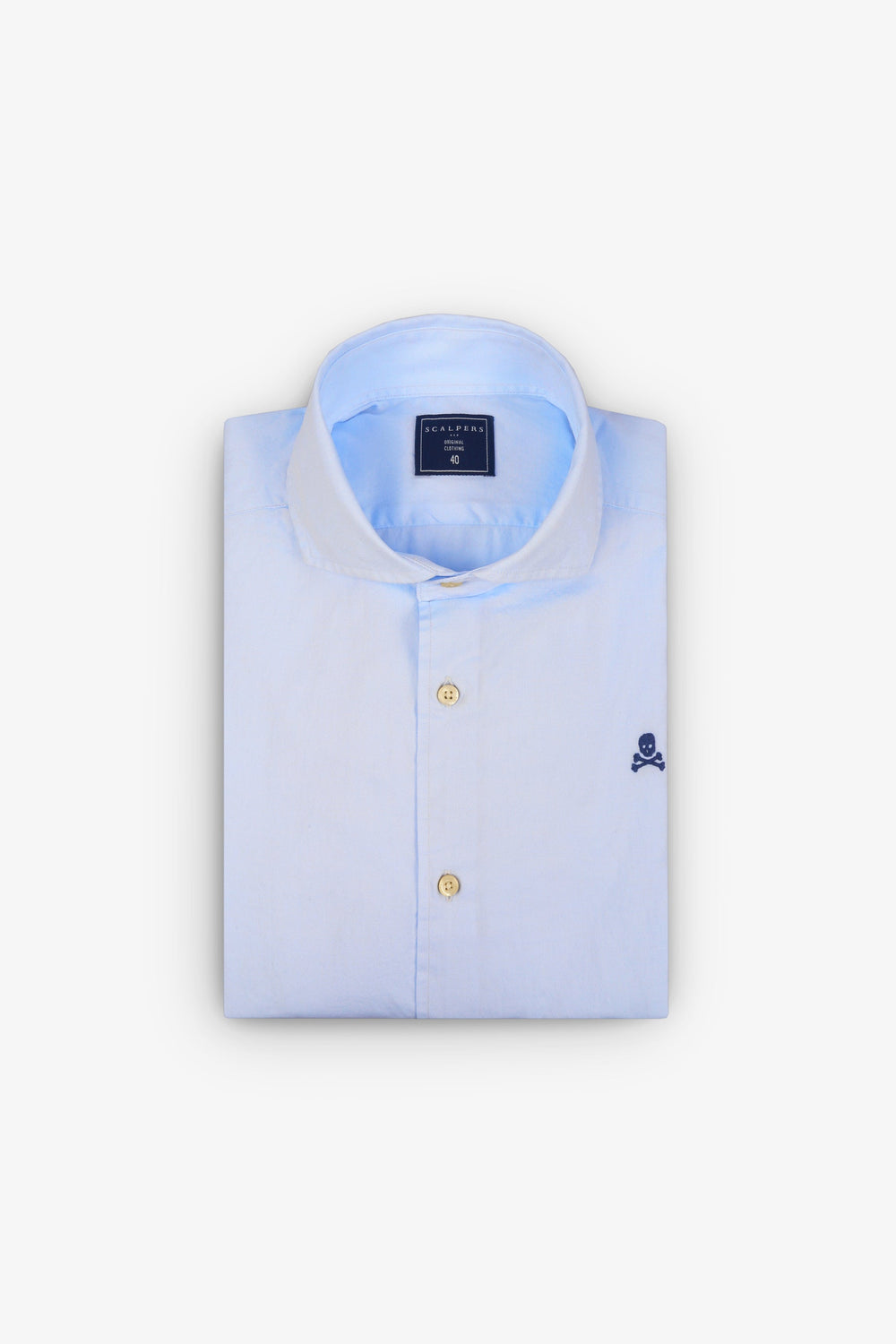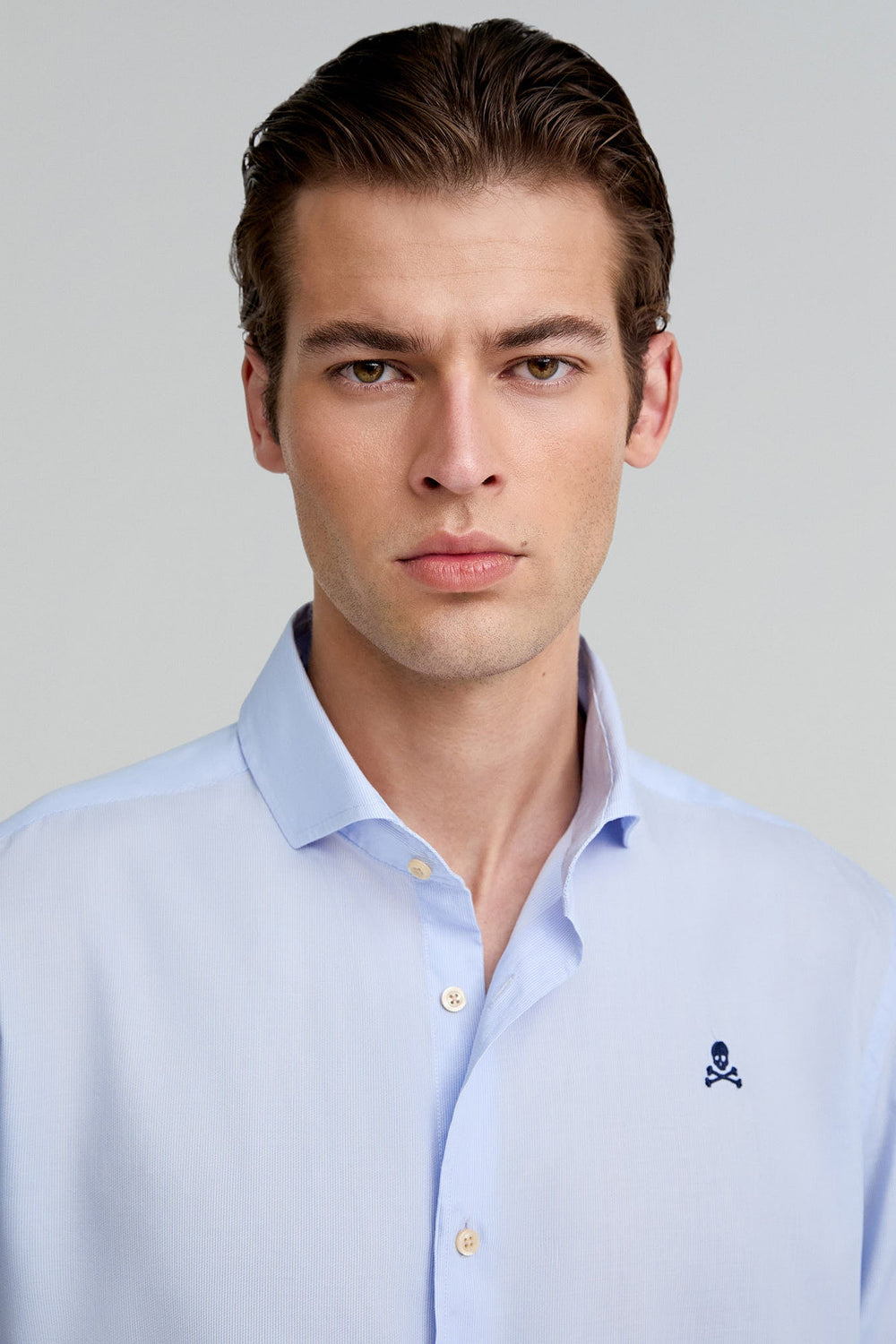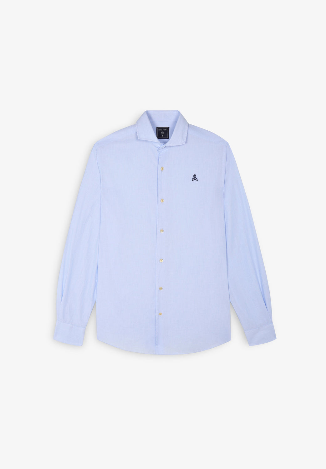 Chemise en tissu 100 % coton. Coupe droite, col italien et fermeture boutonnée. Manches longues, poignets simples et skull brodé sur la poitrine.