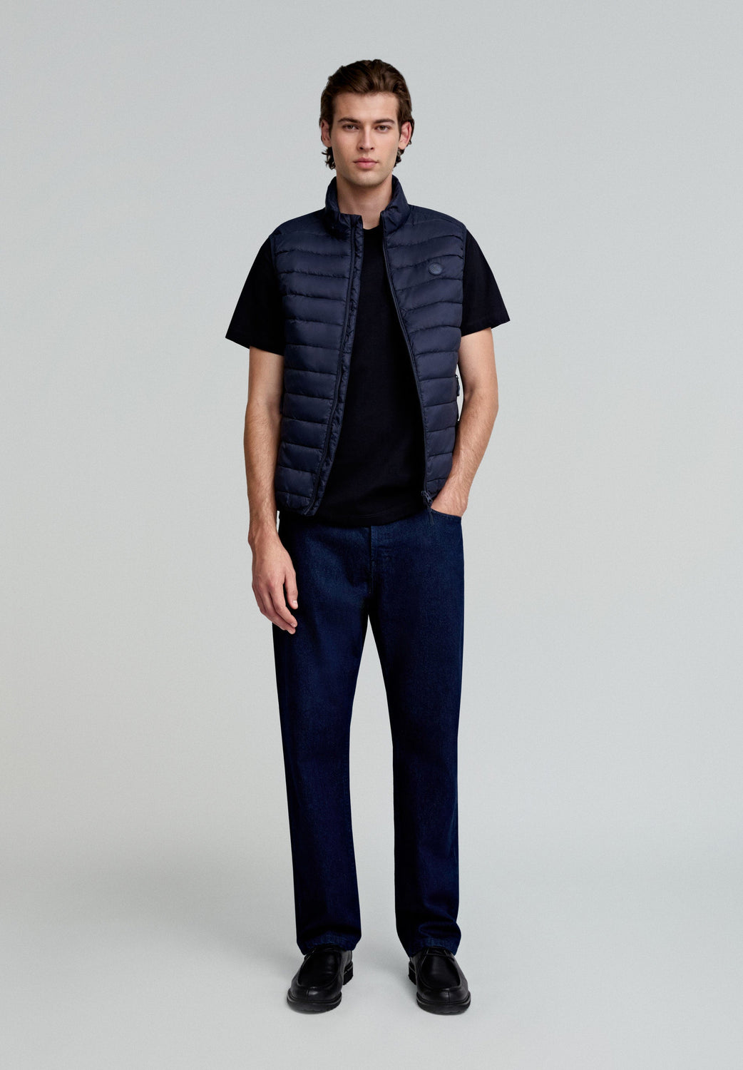 - Coupe slim, col montant et fermeture éclair à double curseur.
