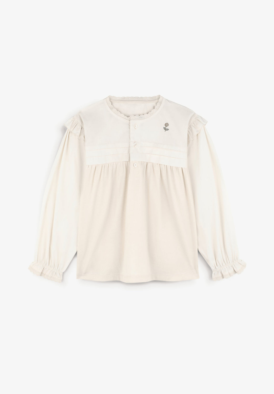 - T-shirt : col rond avec fermeture avant à boutons Manches longues et poignets volantés. Détail de volant sur l’épaule. Finitions sur la lanière brodée. Détail de fleur brodée sur la poitrine.