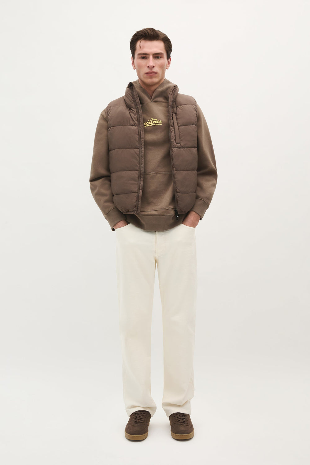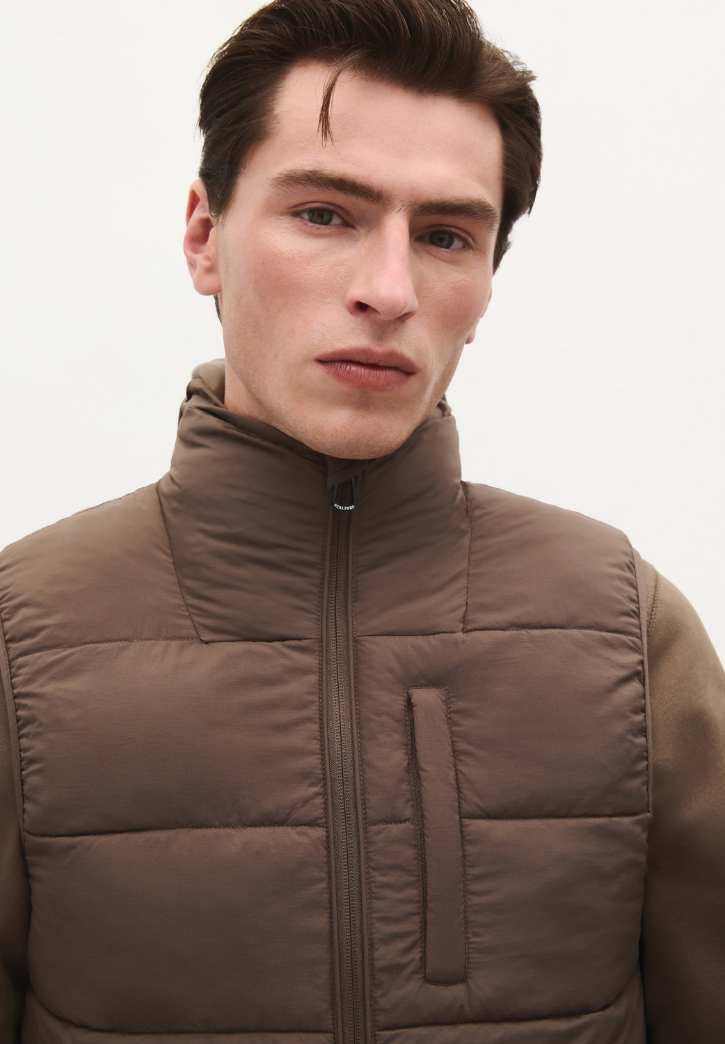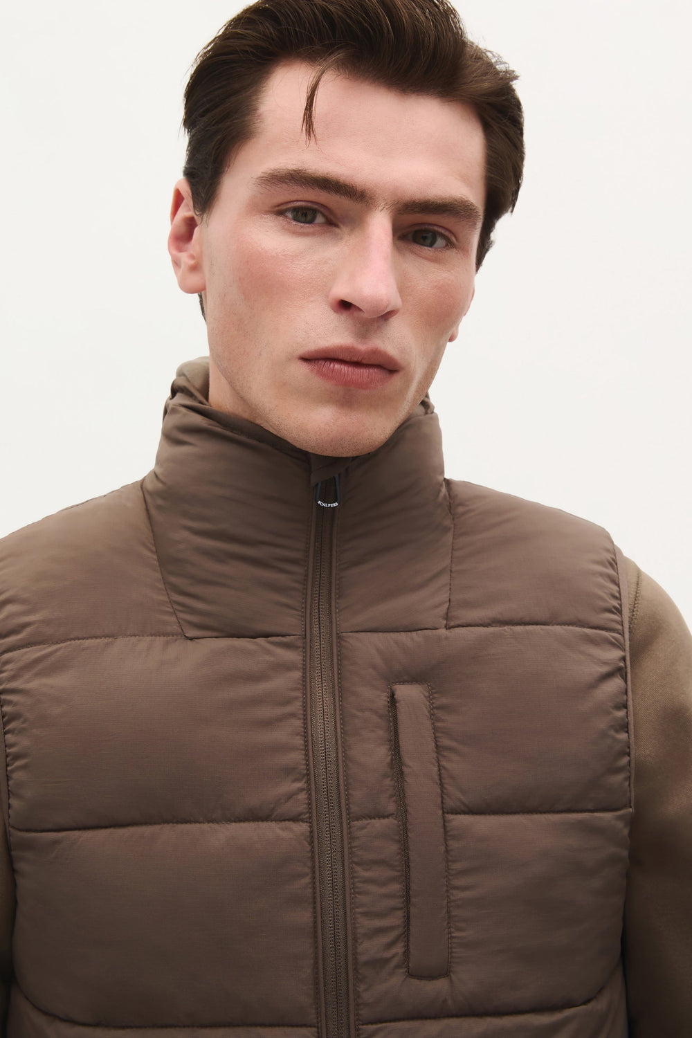 Doudoune sans manches confectionnée dans un tissu recyclé. Coupe droite, col montant et fermeture Éclair à double curseur. Emmanchures américaines et poches à fermeture éclair sur les côtés et sur la poitrine.
