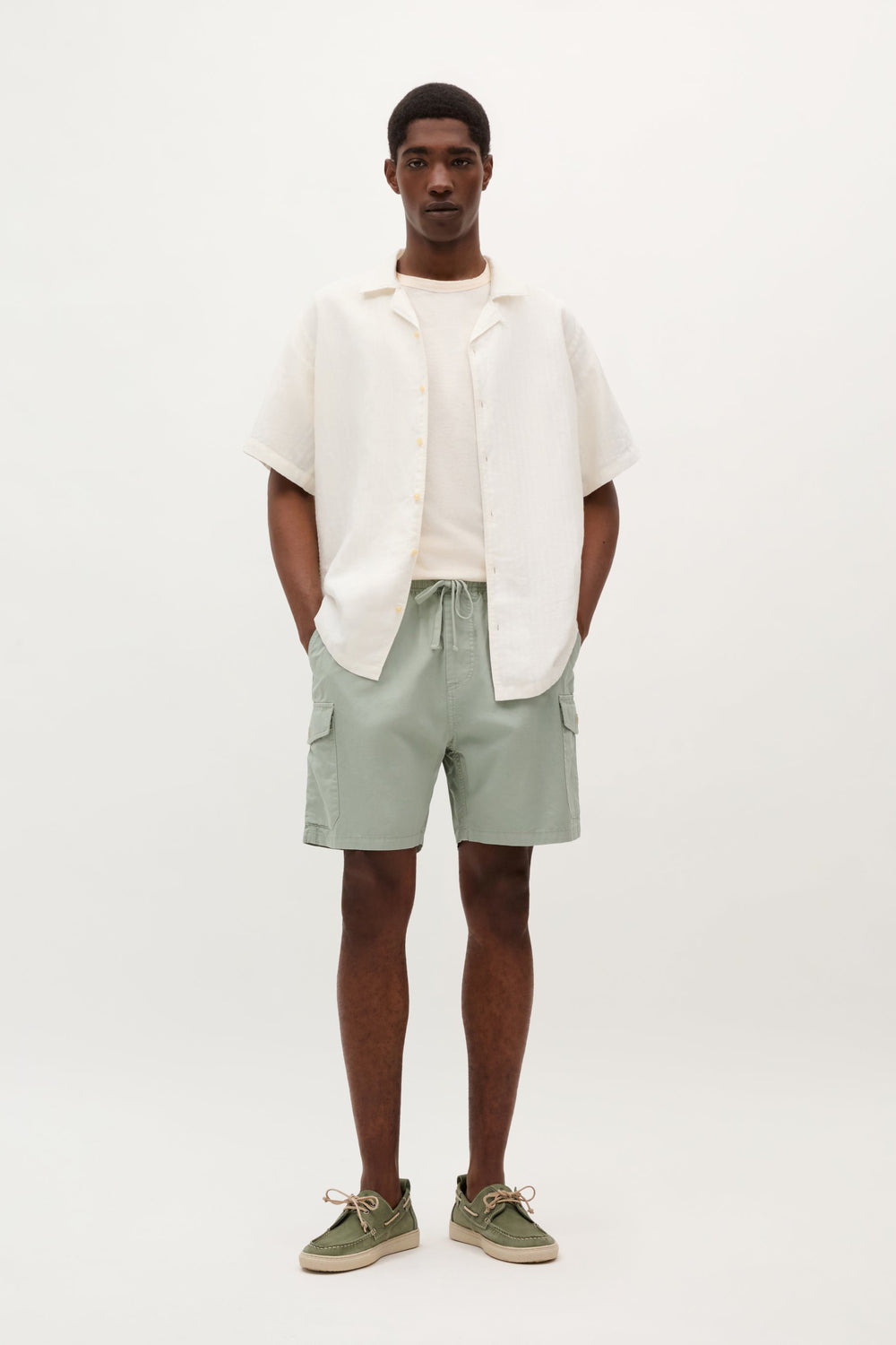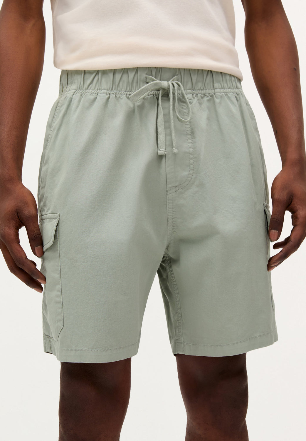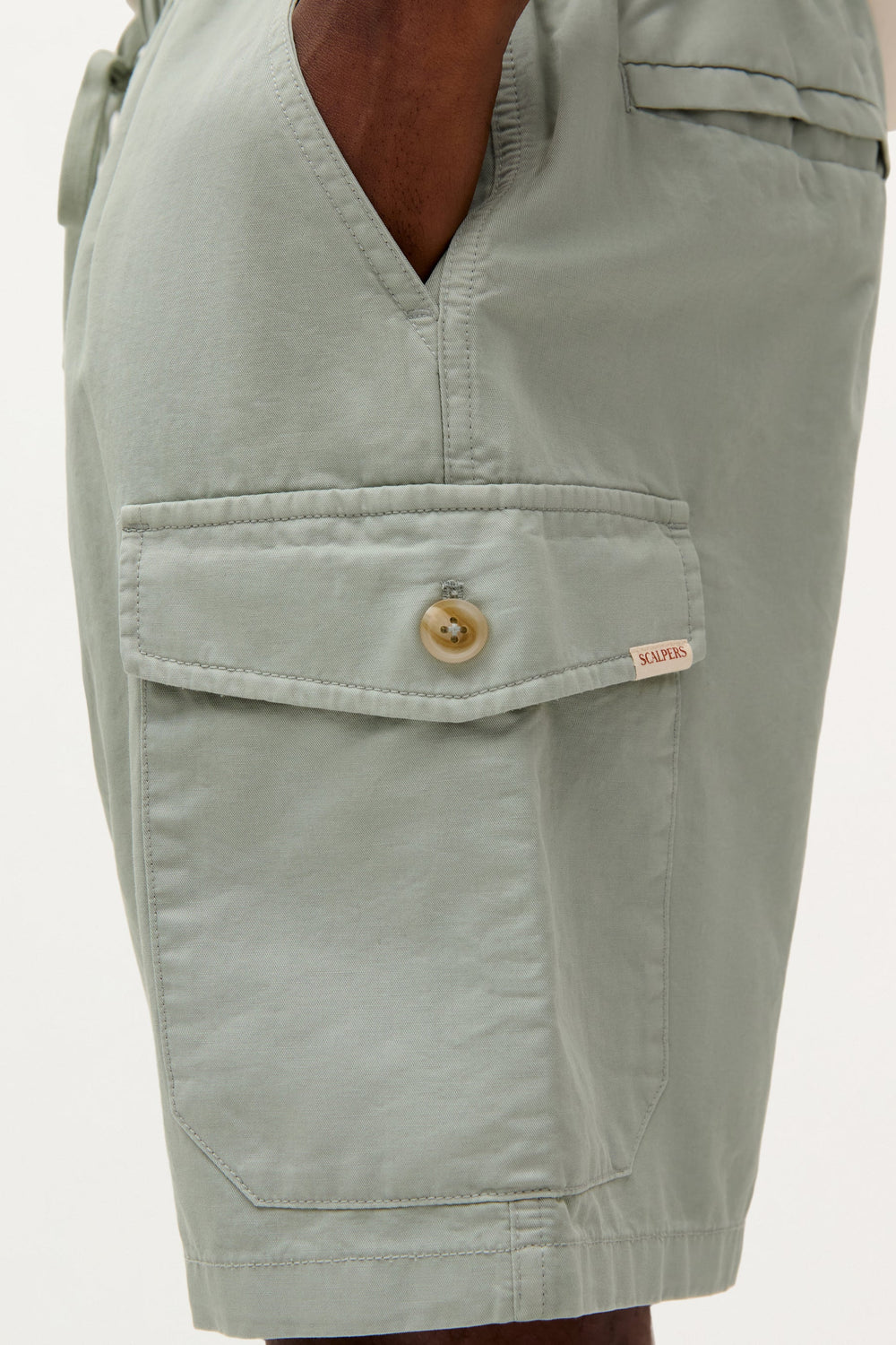 Bermuda shorts made of linen. Cargo. Side pockets with button fastenings. Back pockets. Adjustable elasticated waistband with a front knot.