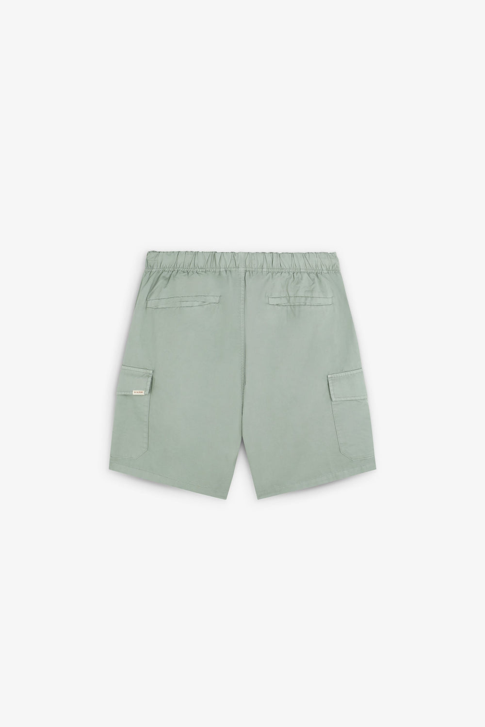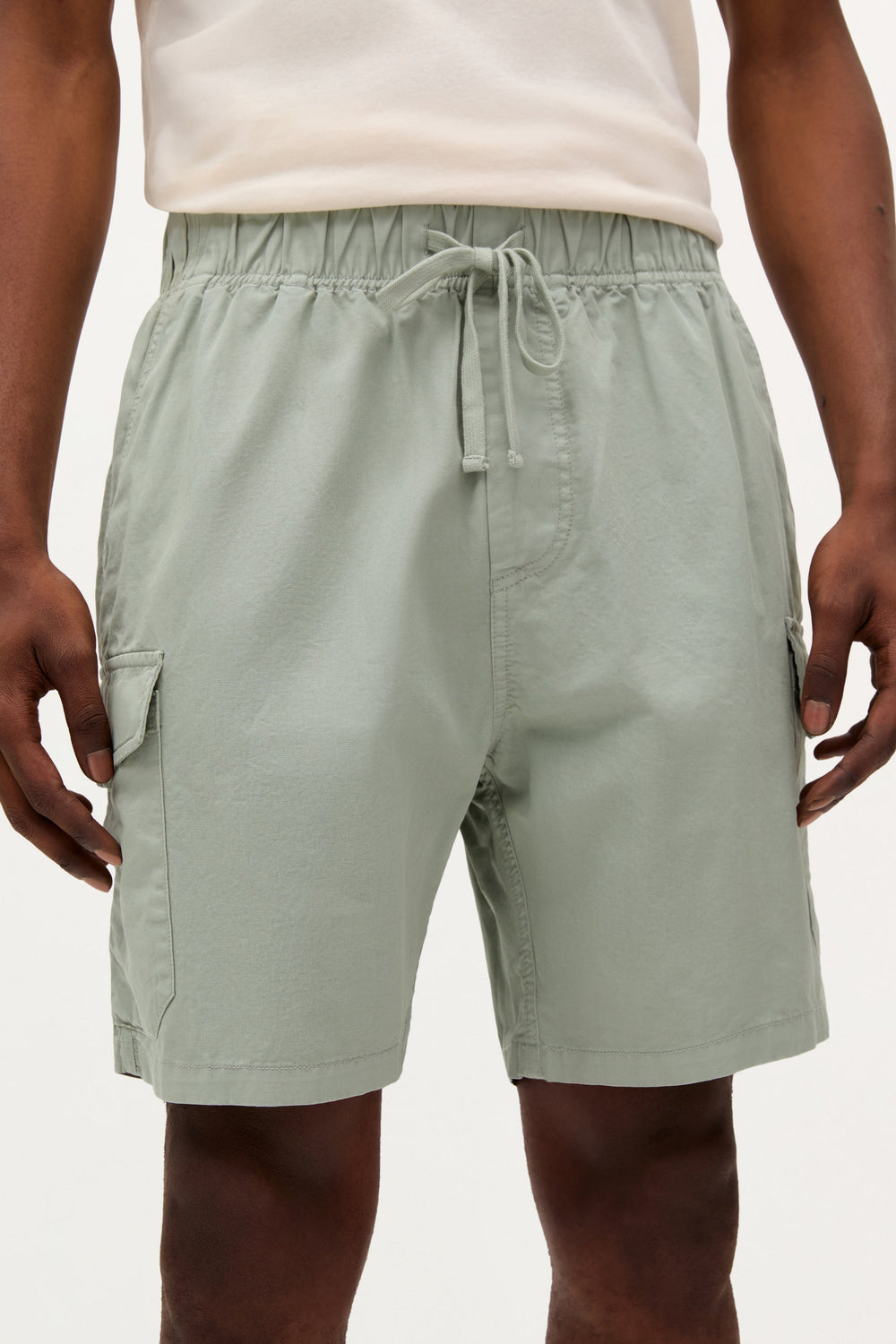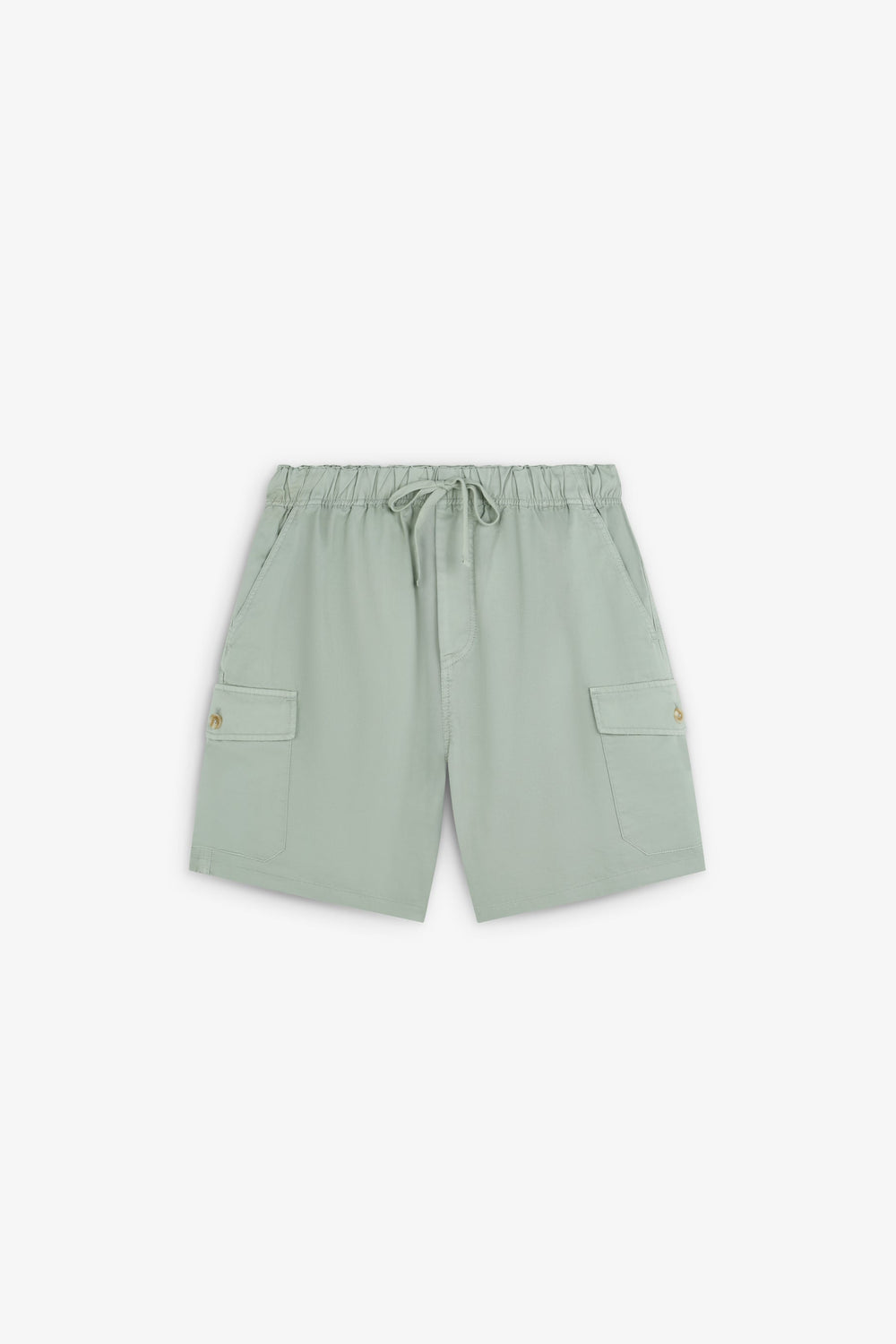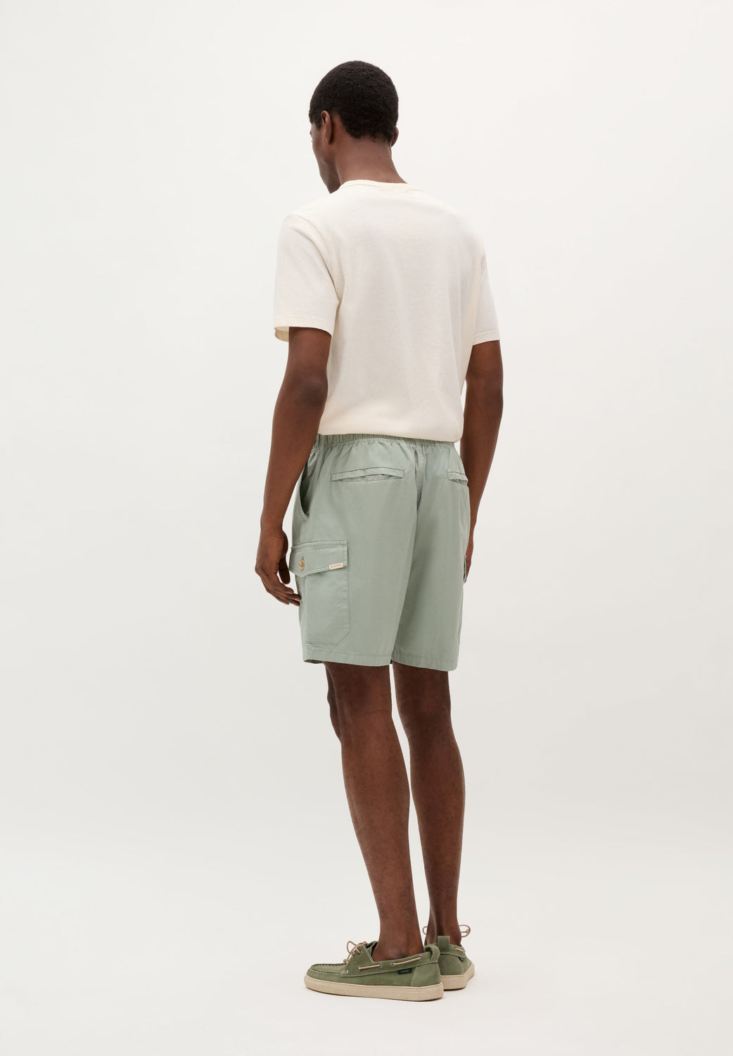 Bermuda shorts made of linen. Cargo. Side pockets with button fastenings. Back pockets. Adjustable elasticated waistband with a front knot.