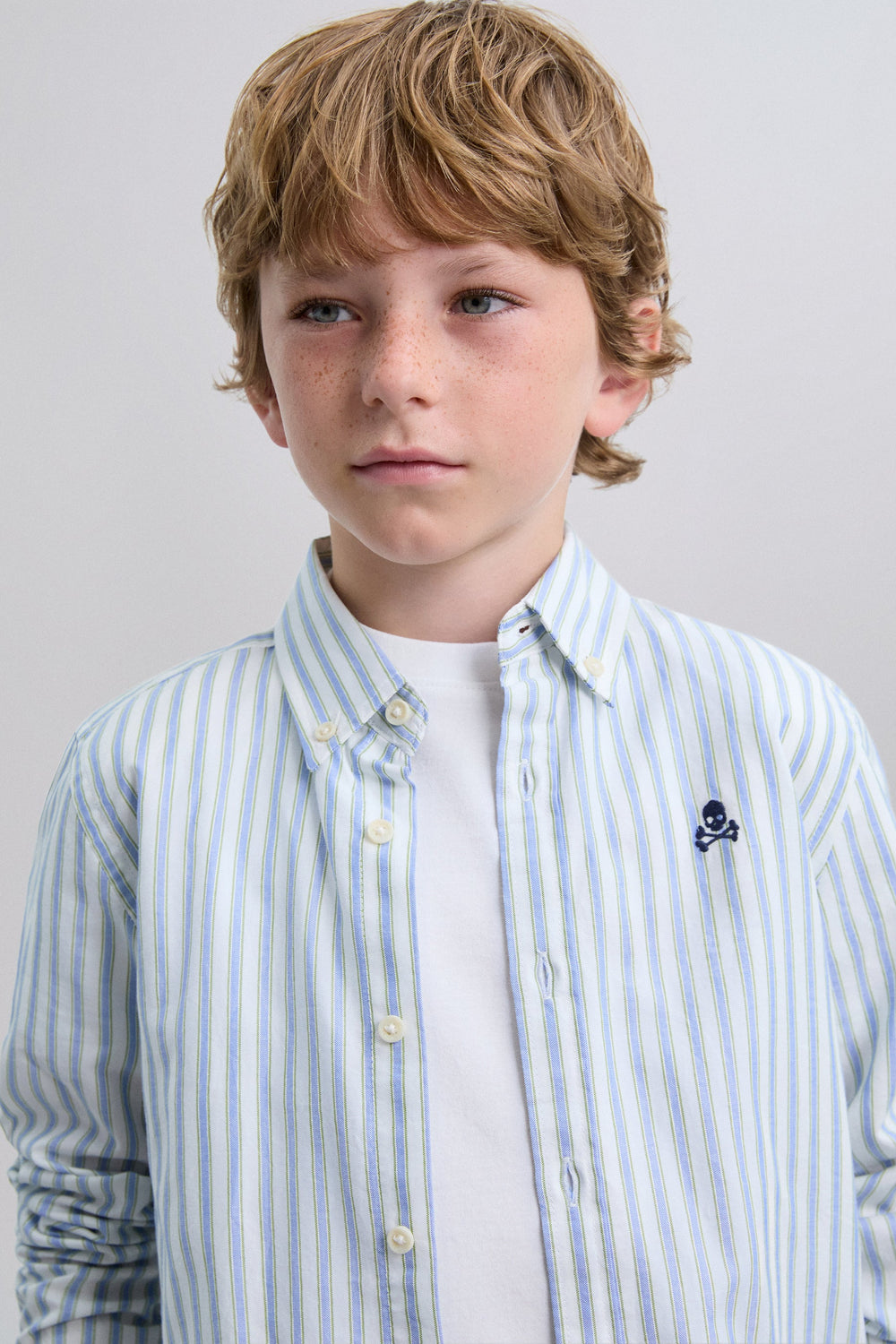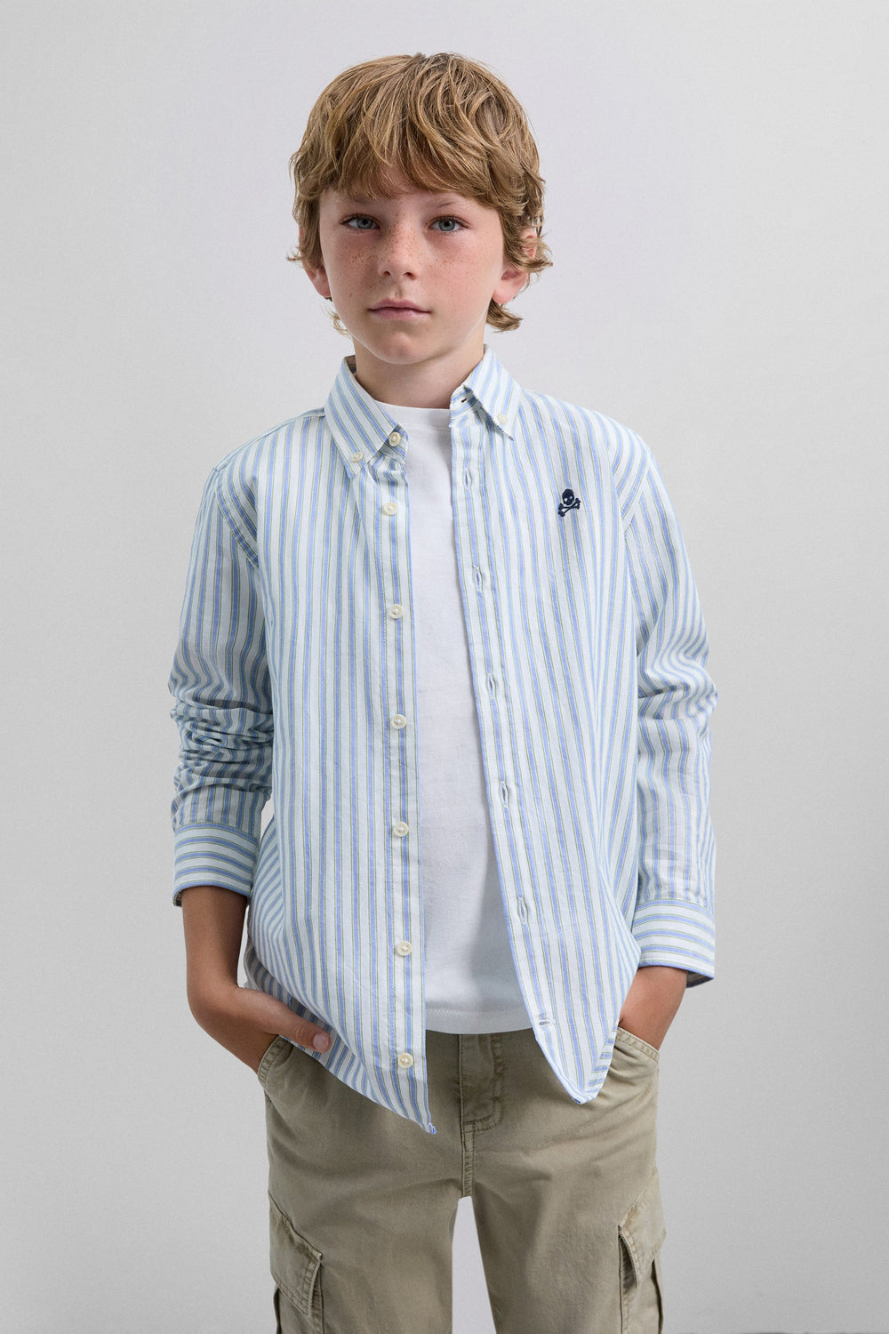 Oxford shirt made of 100% BCI cotton. Regular fit. Stripe print. Contrast embroidered skull detail on the chest.