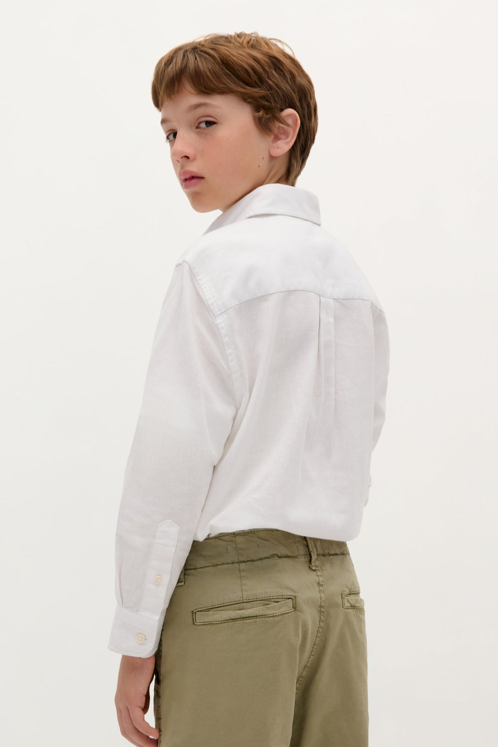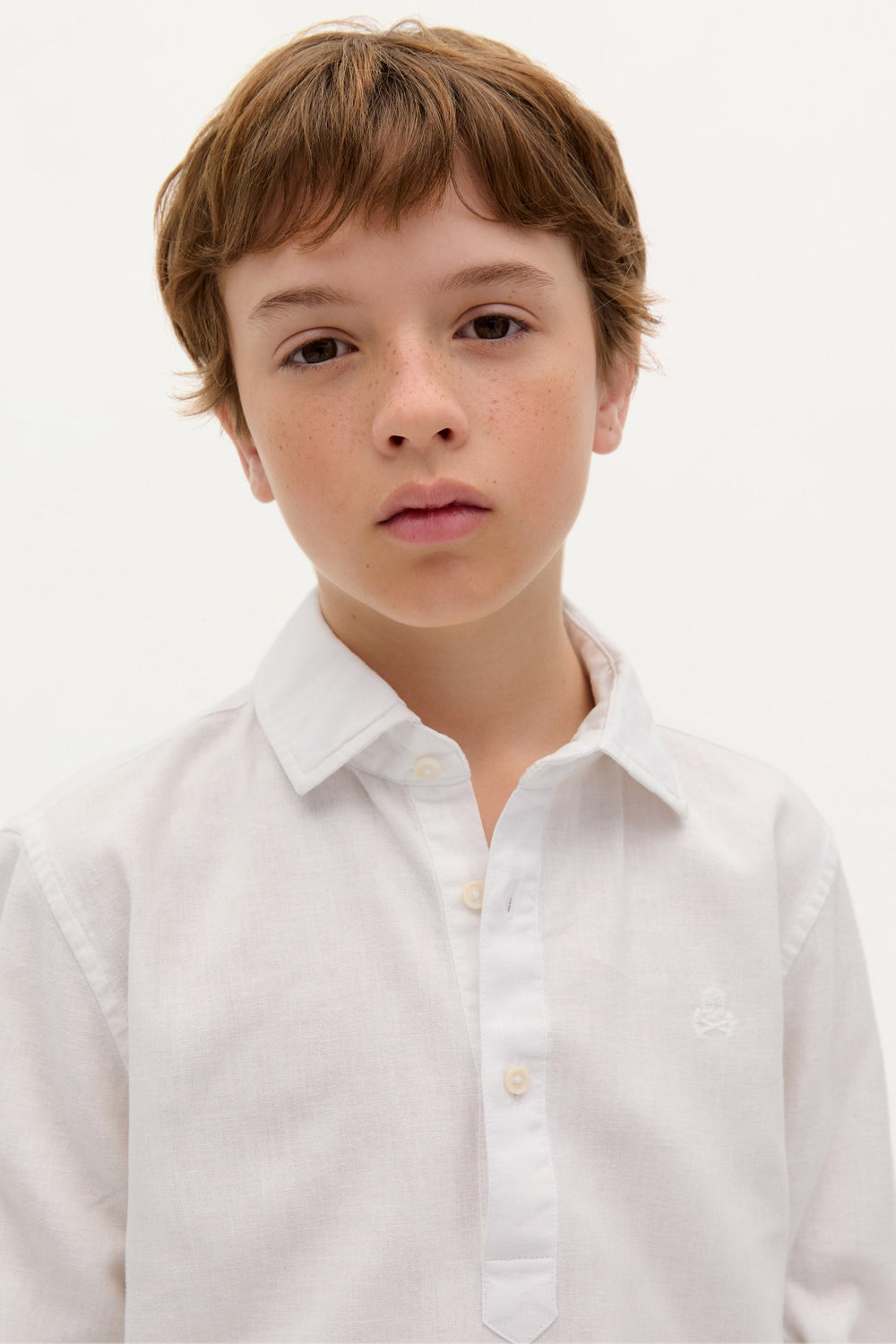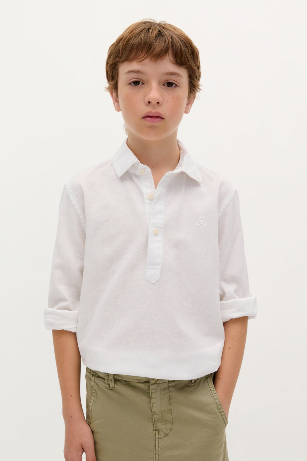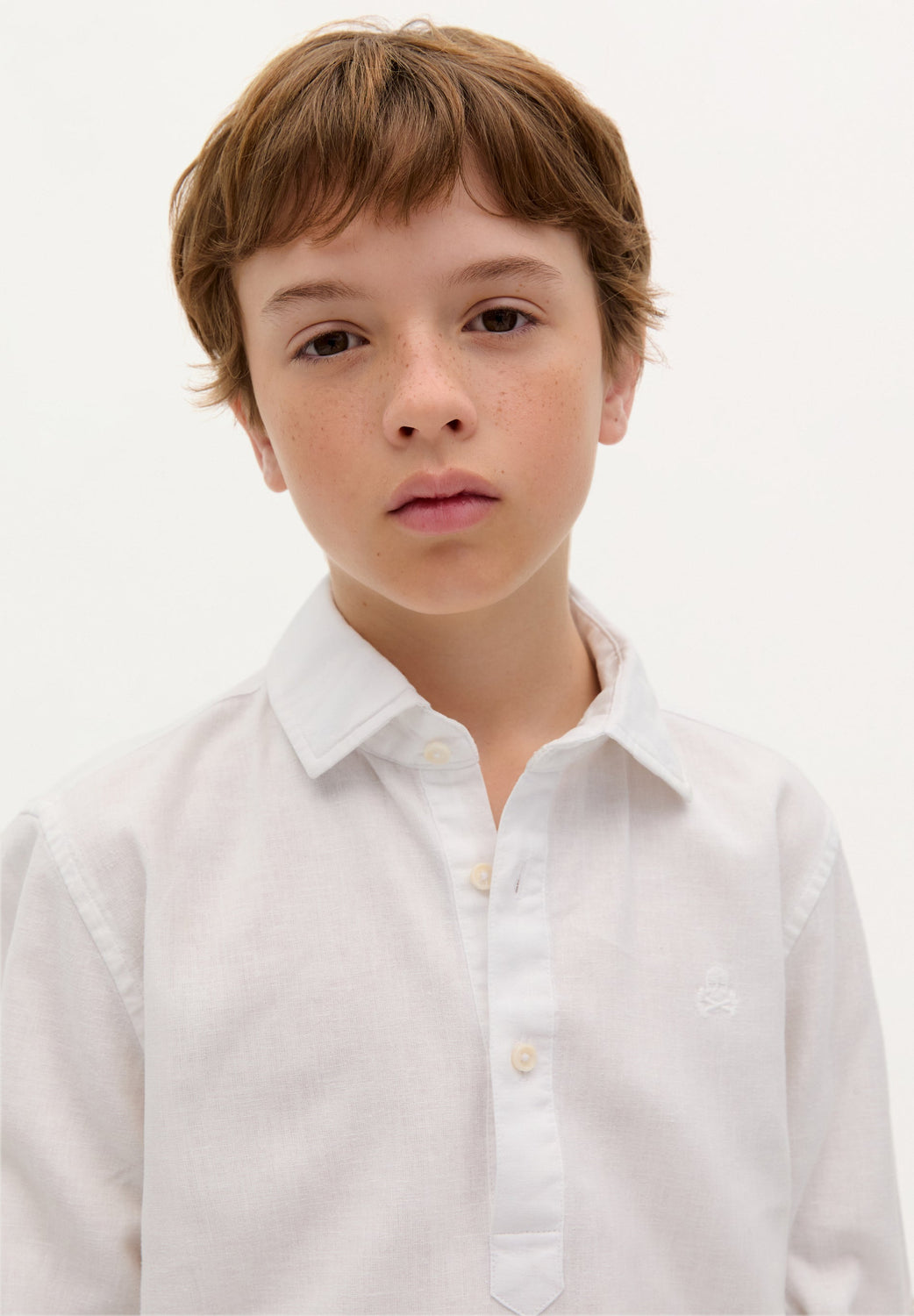 Polo chemise avec skull brodé ton sur ton sur la poitrine. Confectionné dans un mélange de lin et coton. Coupe droite. Col polo. Fermeture boutonnée. Manches longues et poignets boutonnés.