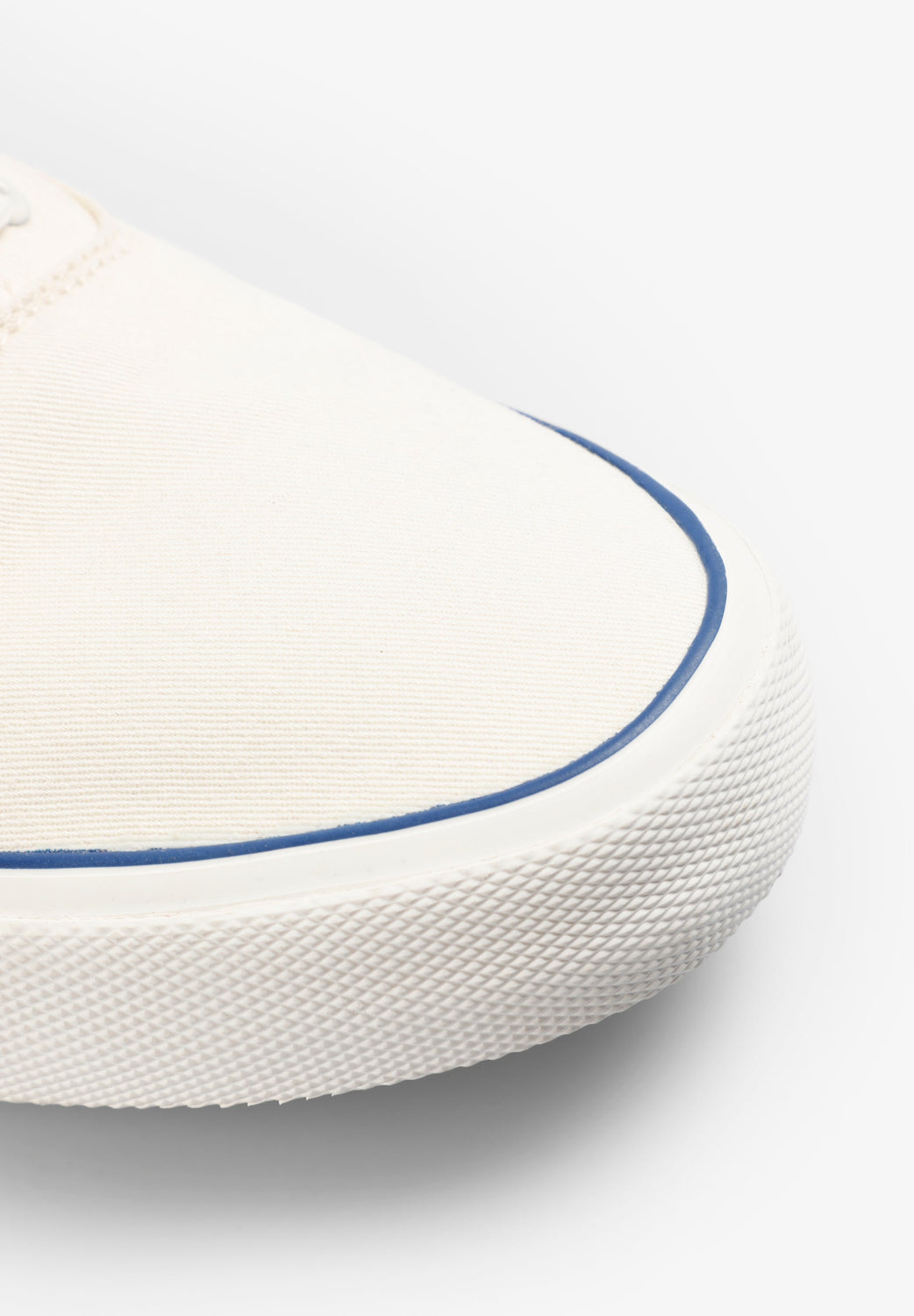 Tennis en toile. Lacets et semelle vulcanisée. Étiquette avec logo à l’arrière.