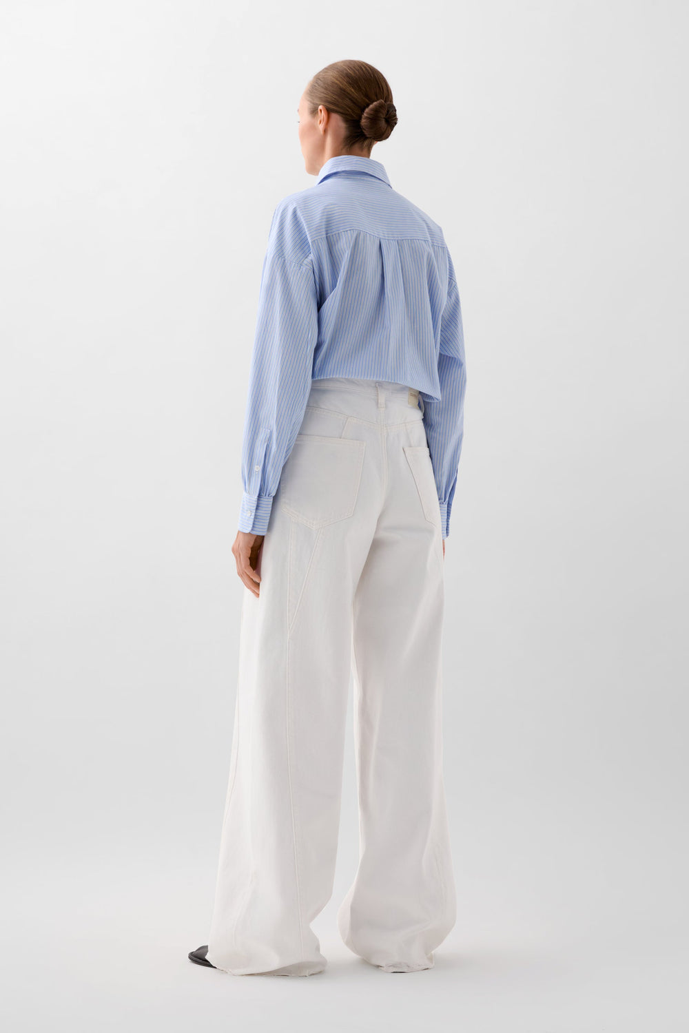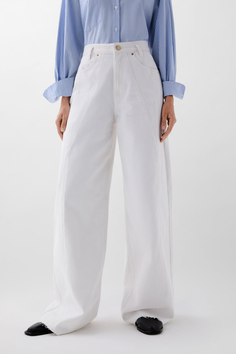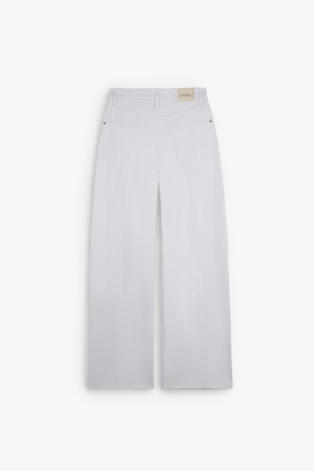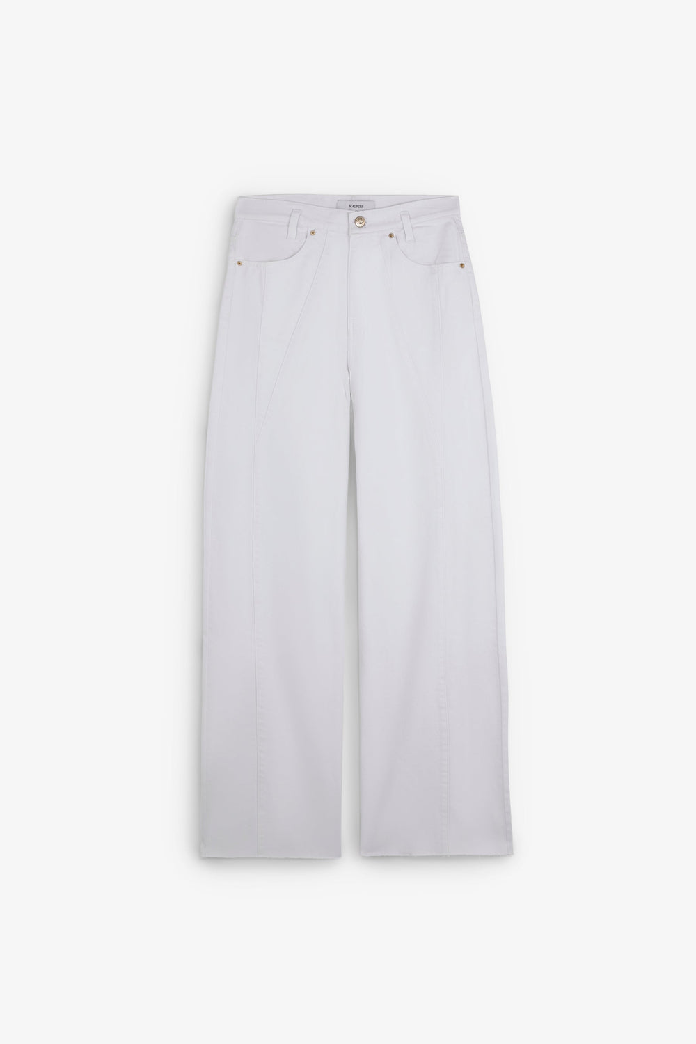 Jean 100 % coton. Taille haute. Quatre poches. Jambe large. Coutures. Fermeture éclair devant et bouton.