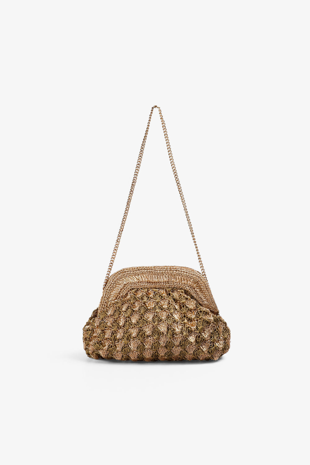 Handbag made of 100% metallic thread with 100% cotton lining. Contrast logo detail on the lining. Inner pocket and magnetic button closure.