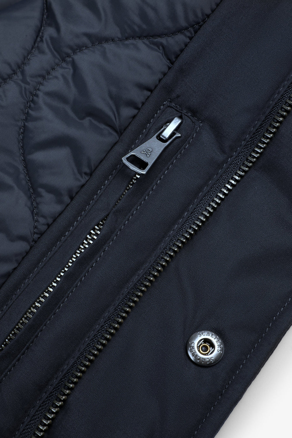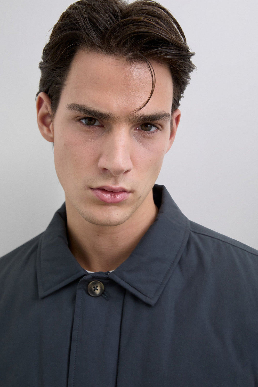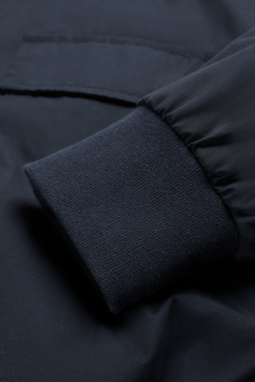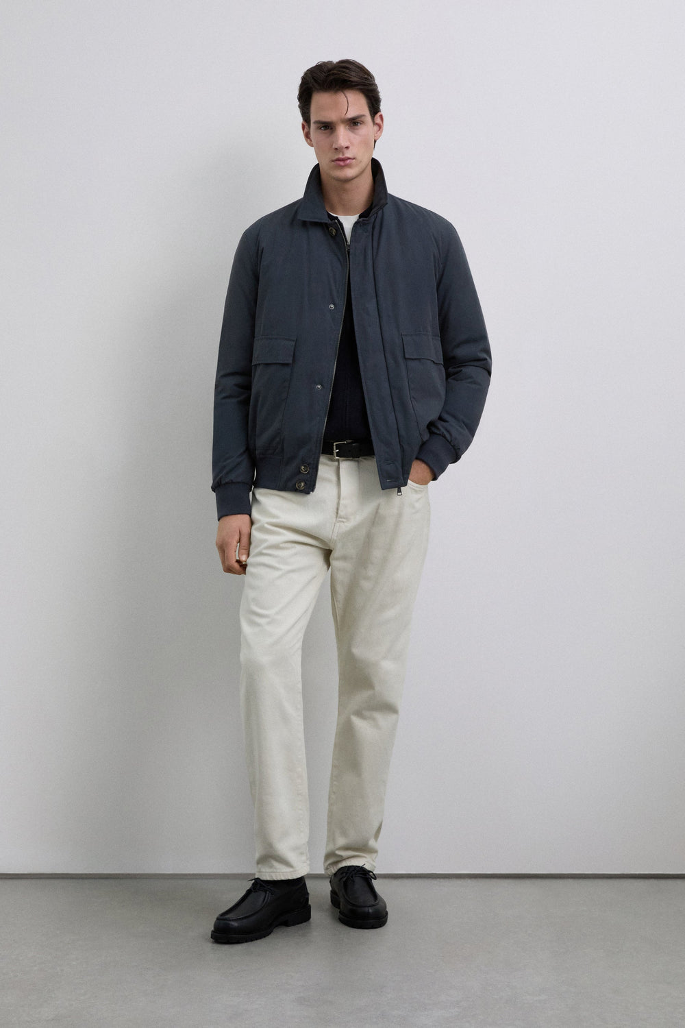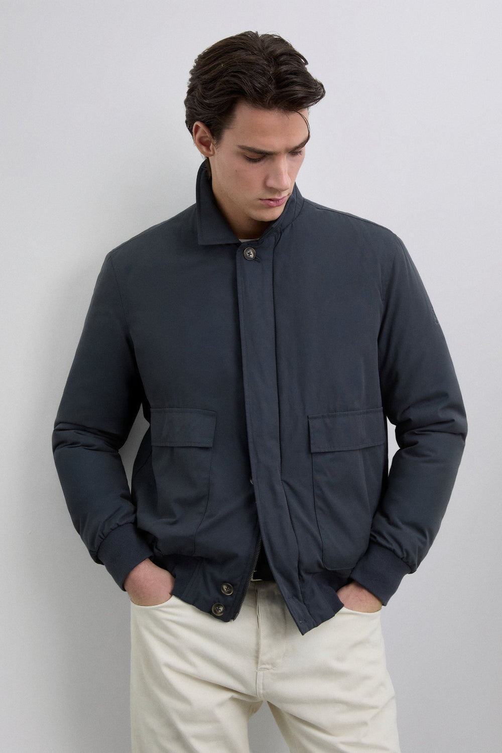 Bomber jacket made of a cotton blend. Button and concealed zip fastening. Front flap pockets. Side pockets. Padded lining. Inner zipped jetted pocket. Ribbed cuffs and hem. Logo detail on the sleeve.