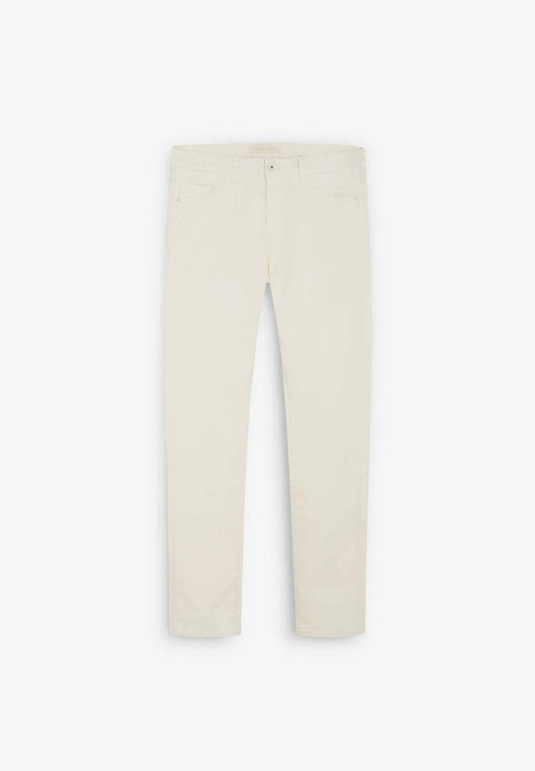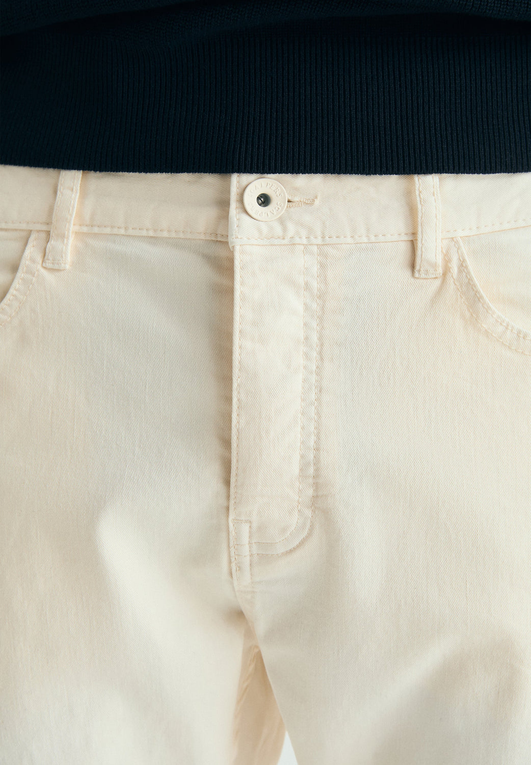 Trousers made of a cotton blend. Slightly stretchy. Button fastening. Regular fit. Back and side pockets. Belt loops.