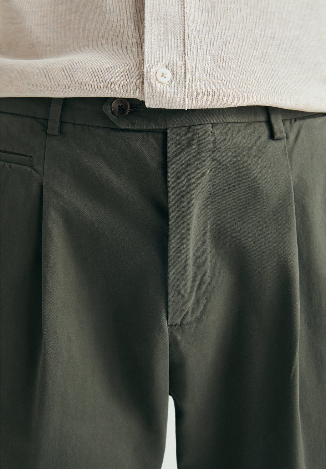 Trousers made of a cotton blend. Front darts. Front button fastening with extended button at the waist. Belt loops. Double piped back pockets with button.