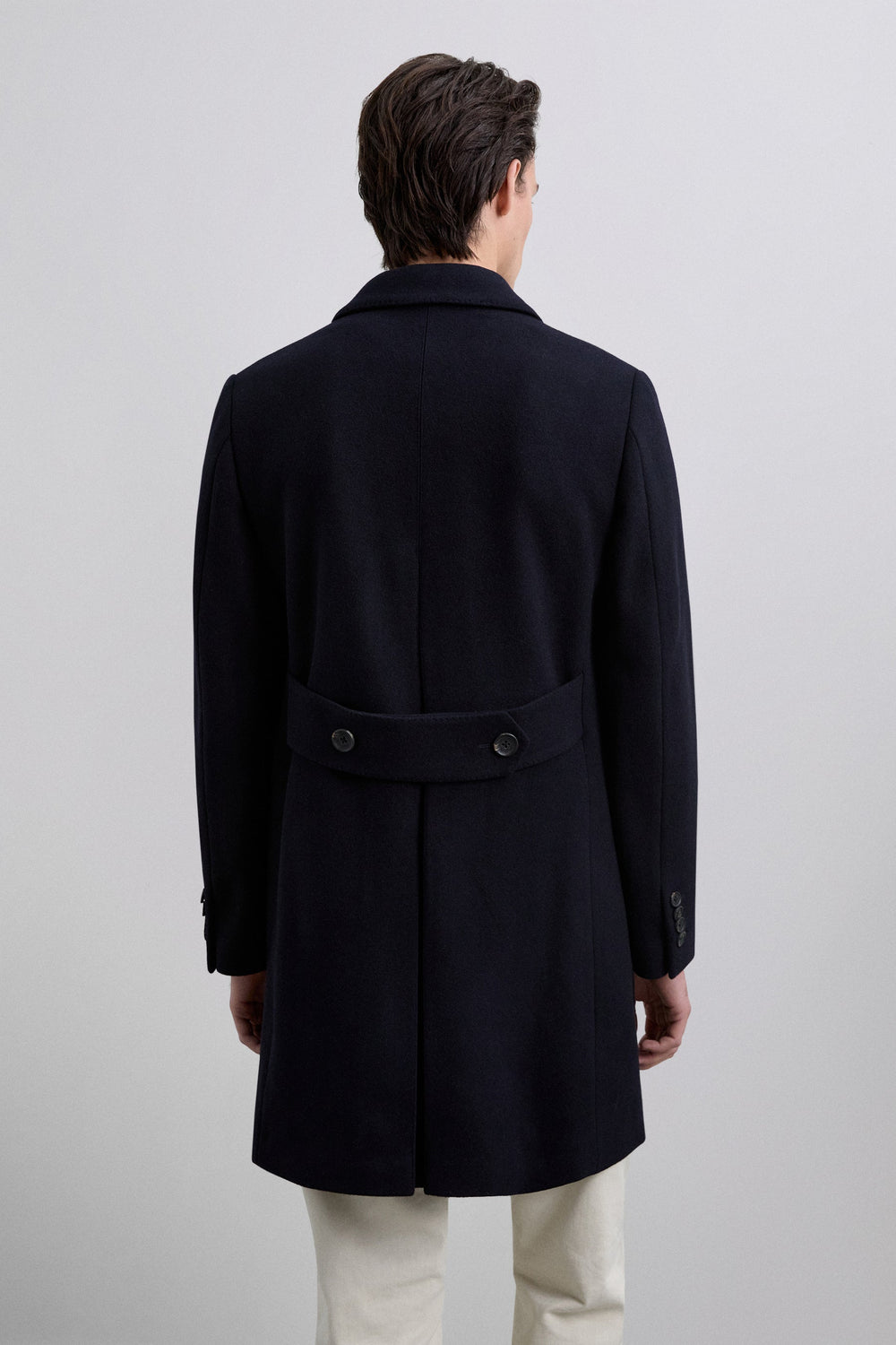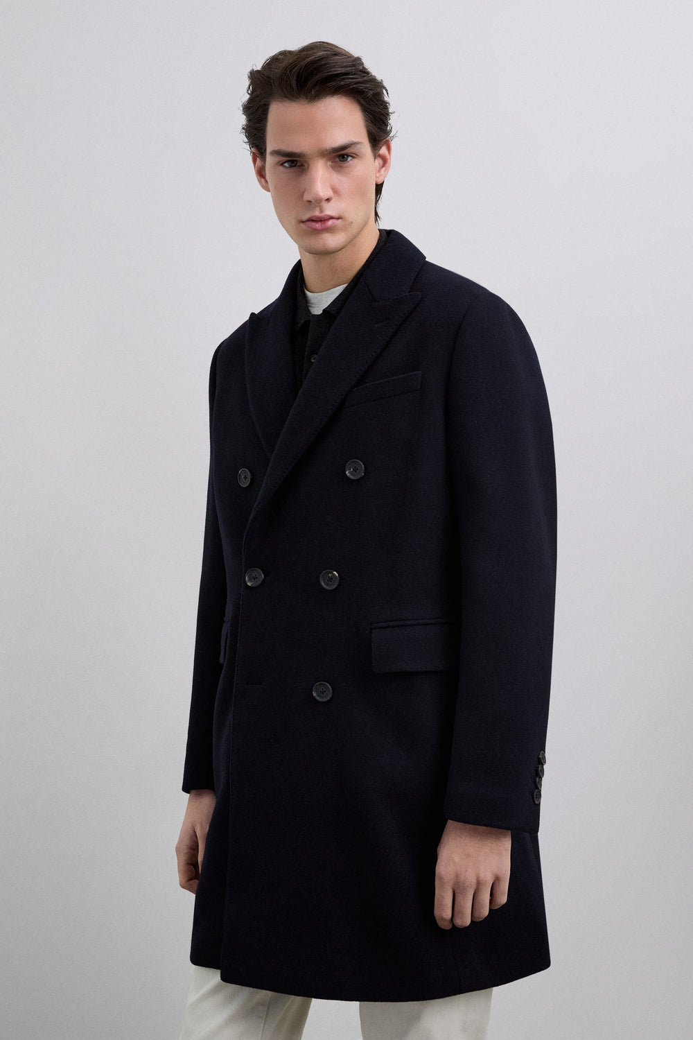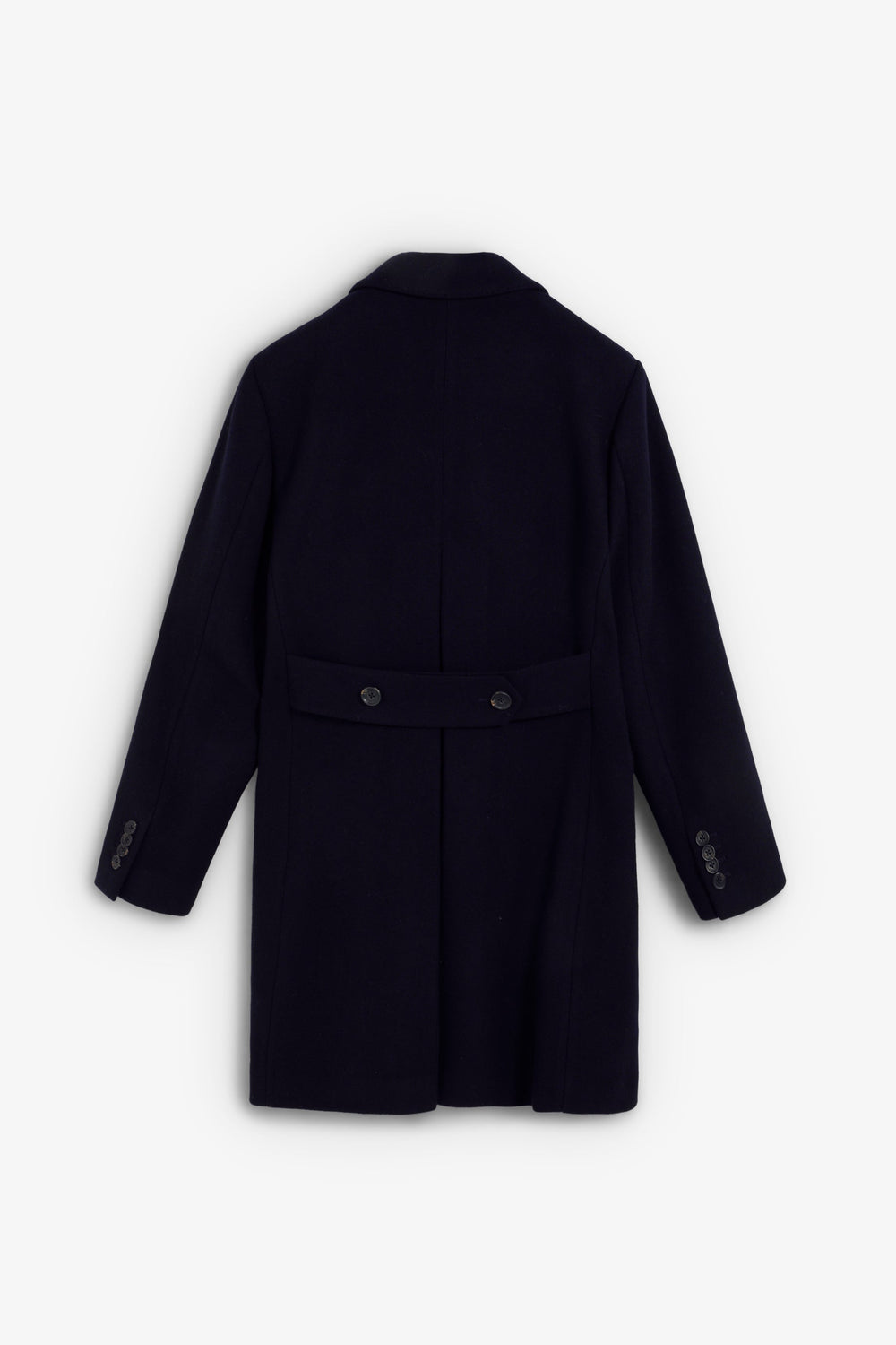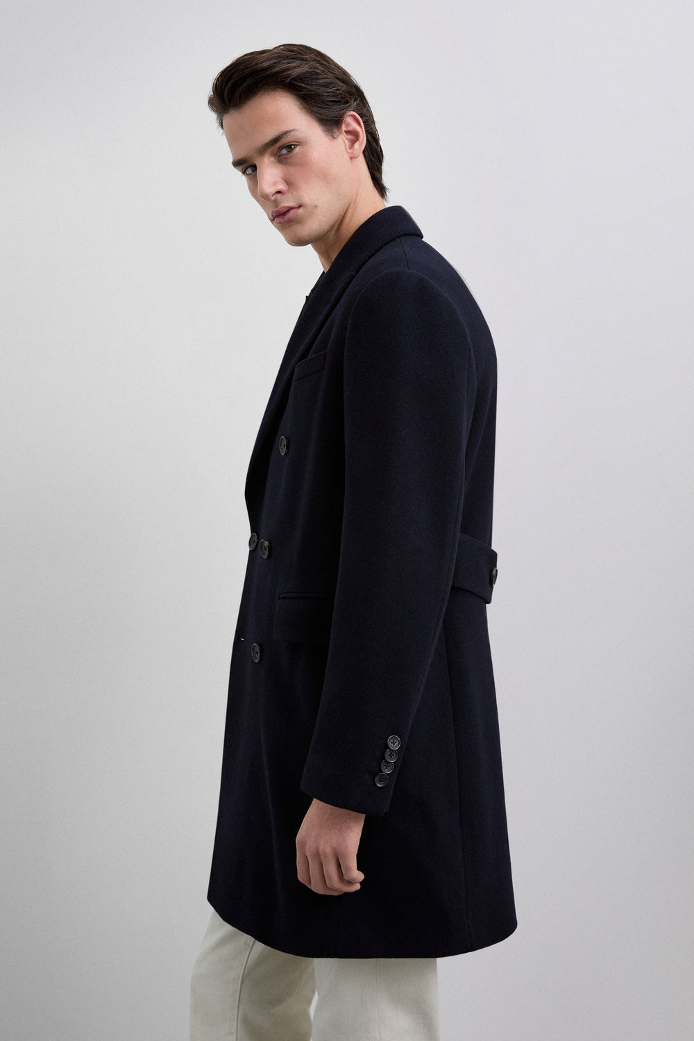 Coat made of a wool blend fabric. V-neck with peak lapels and long sleeves. Customised cuff buttons. Front buttoned flap pockets. Pleat in the centre back hem. Double-breasted button fastening.