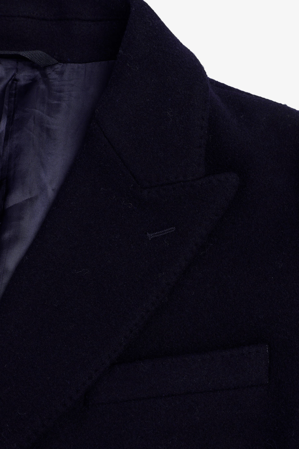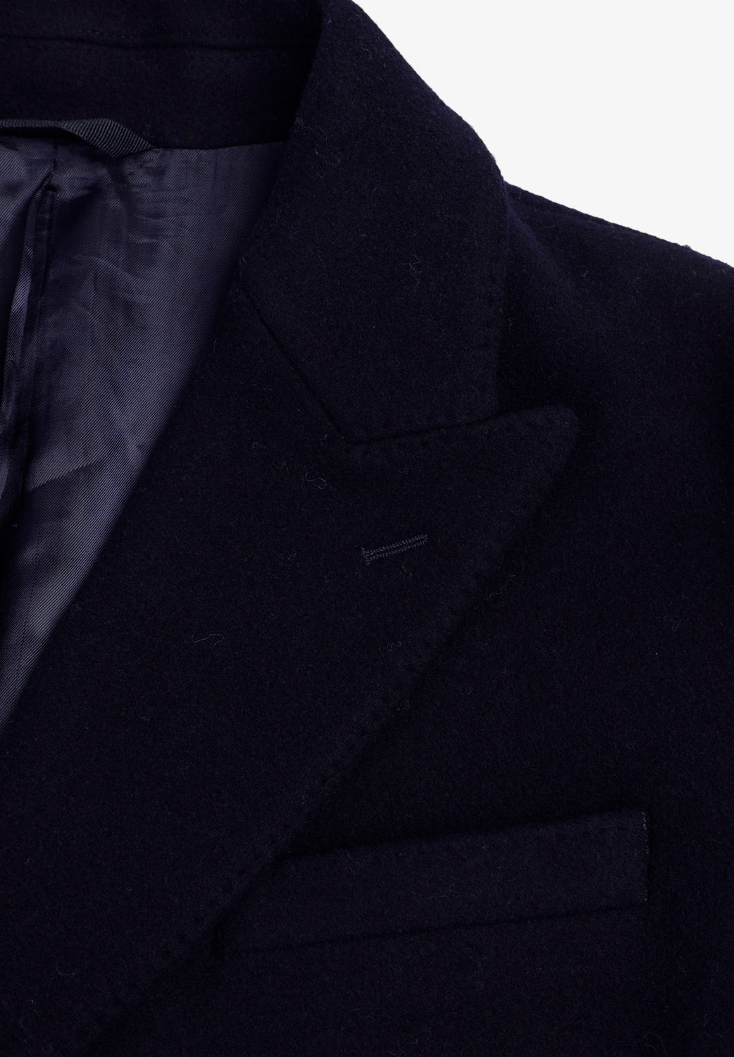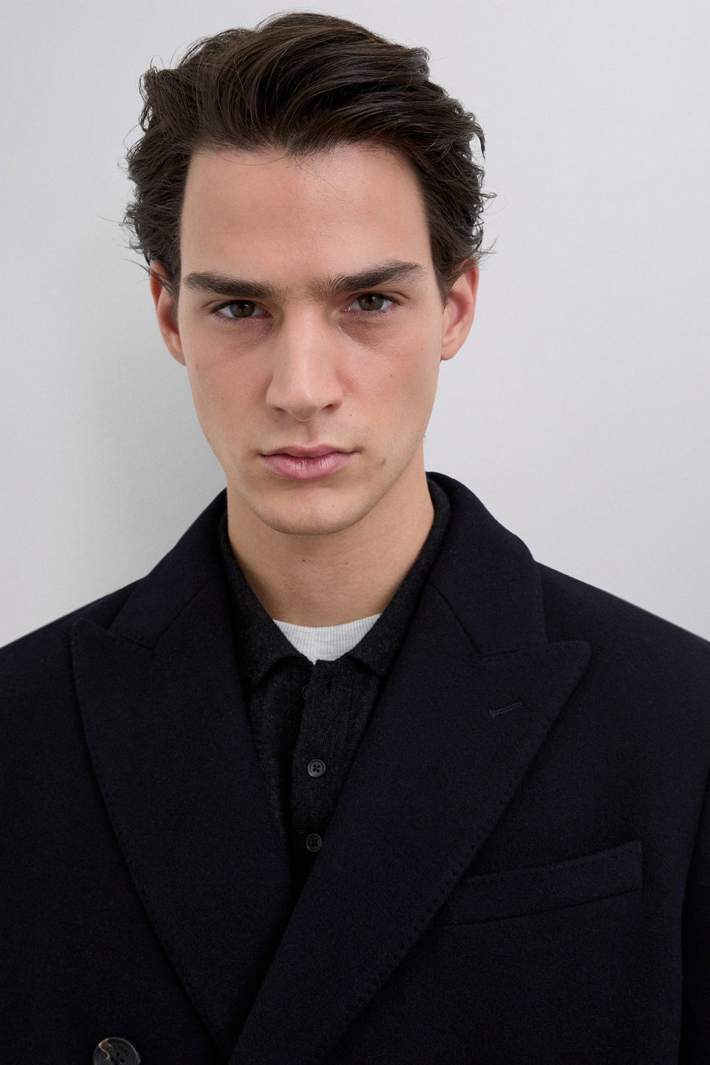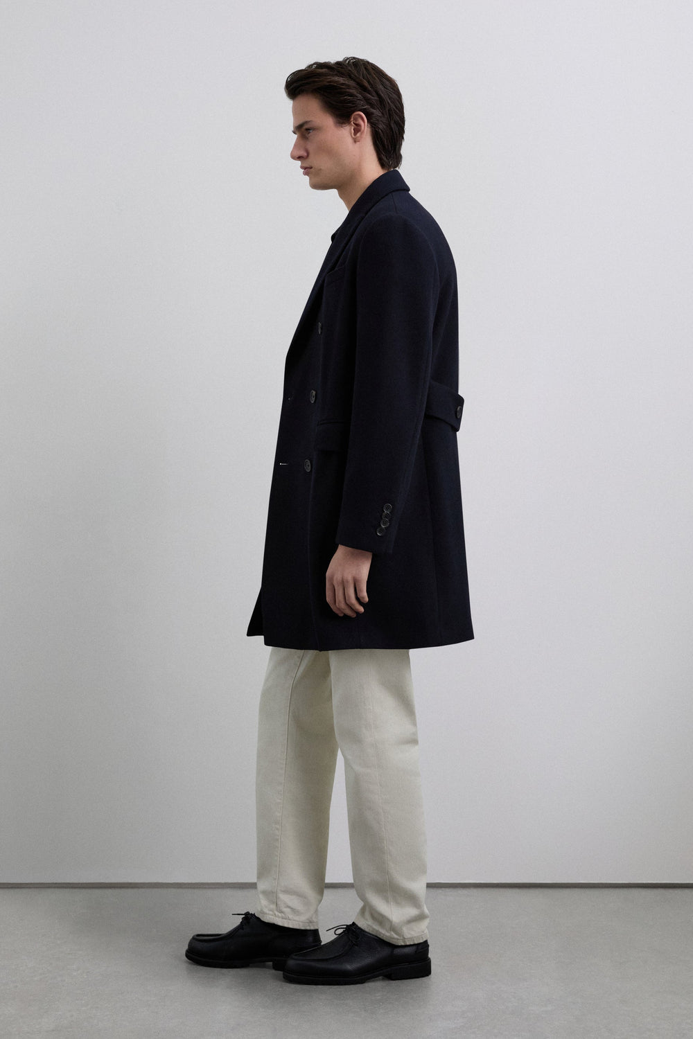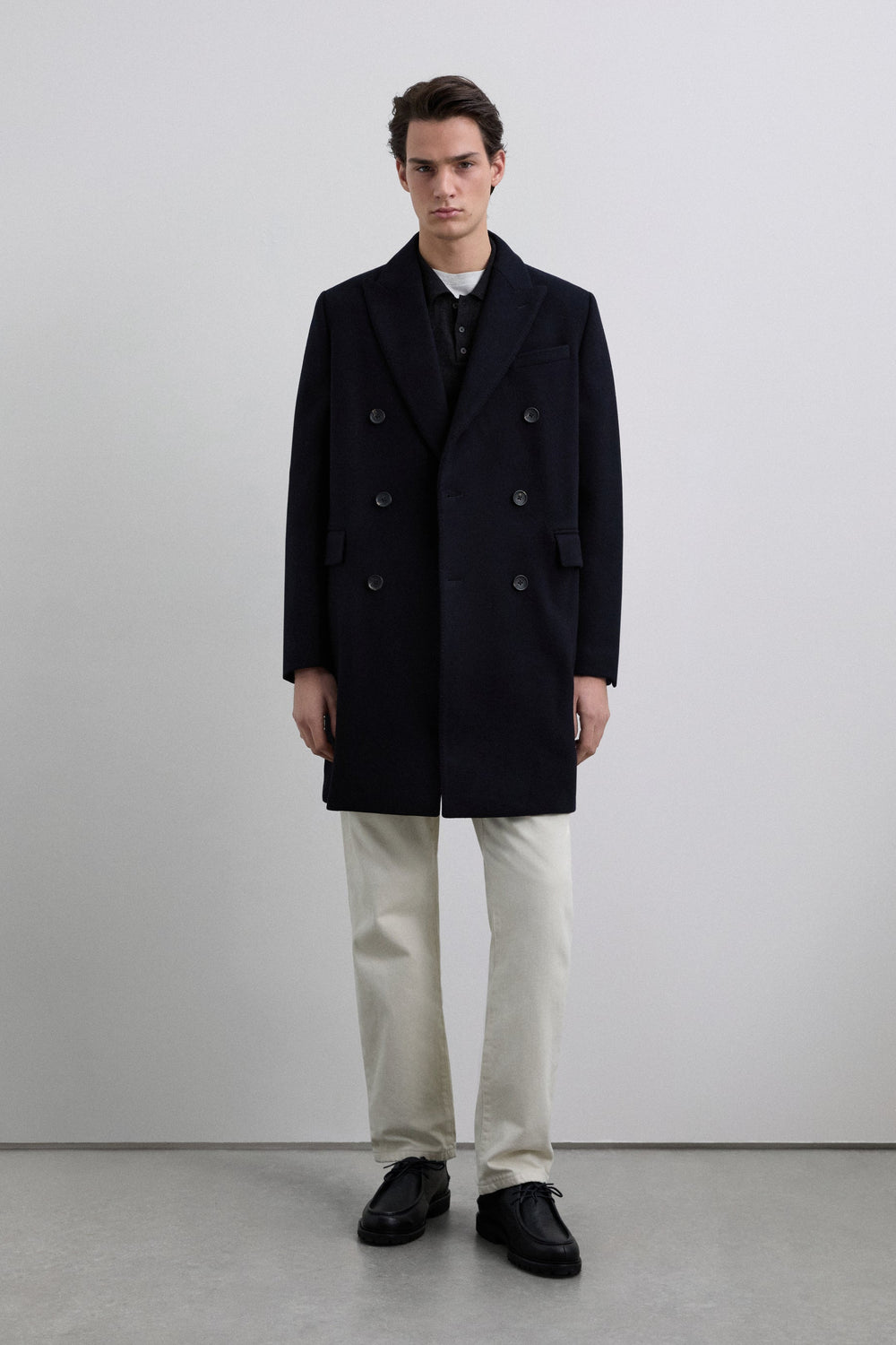Coat made of a wool blend fabric. V-neck with peak lapels and long sleeves. Customised cuff buttons. Front buttoned flap pockets. Pleat in the centre back hem. Double-breasted button fastening.