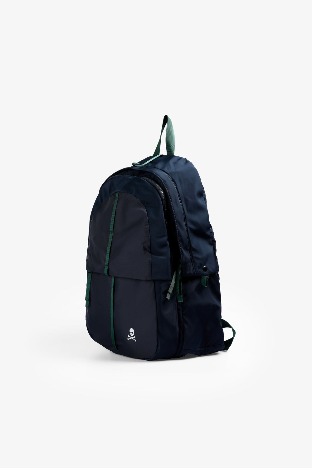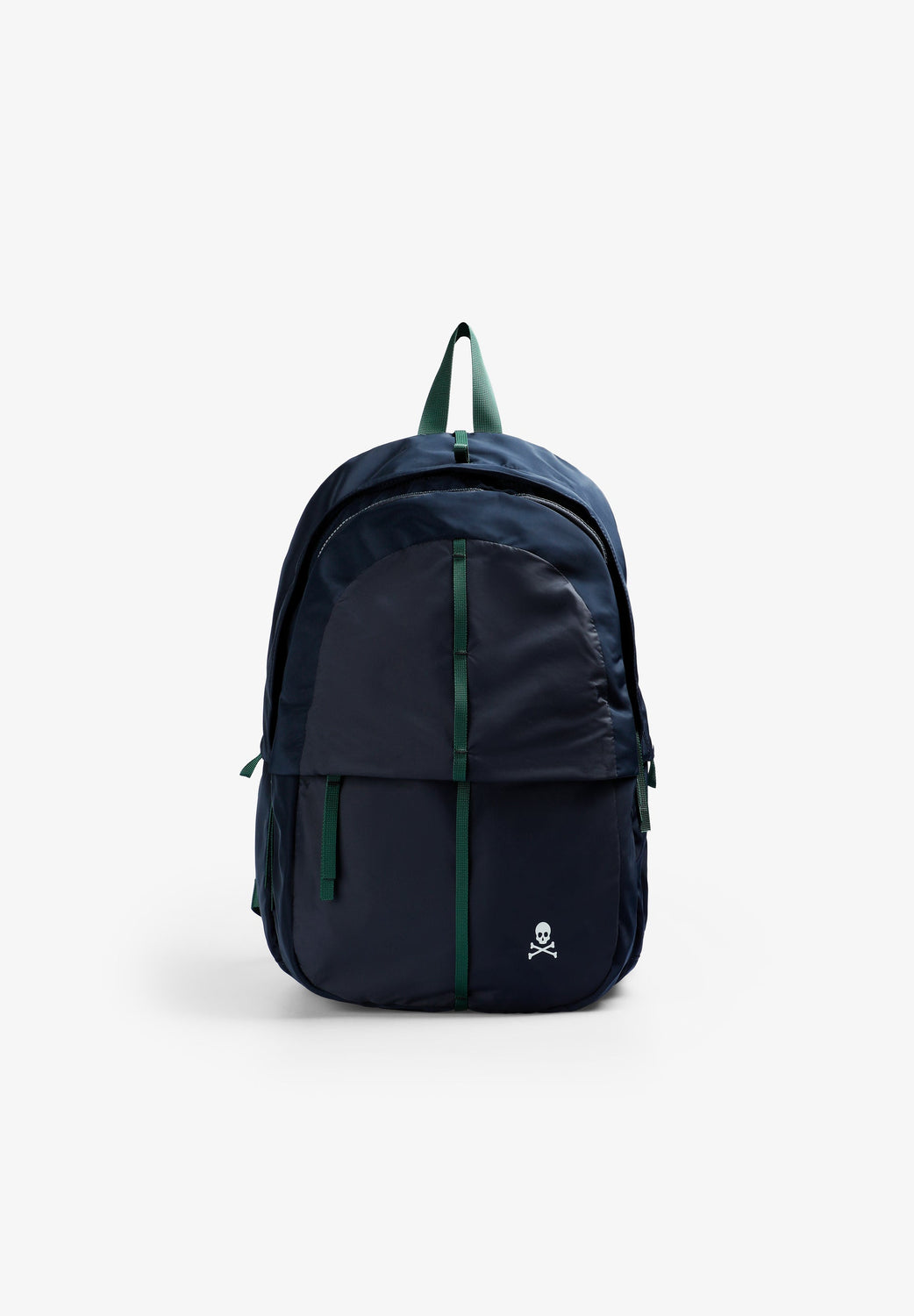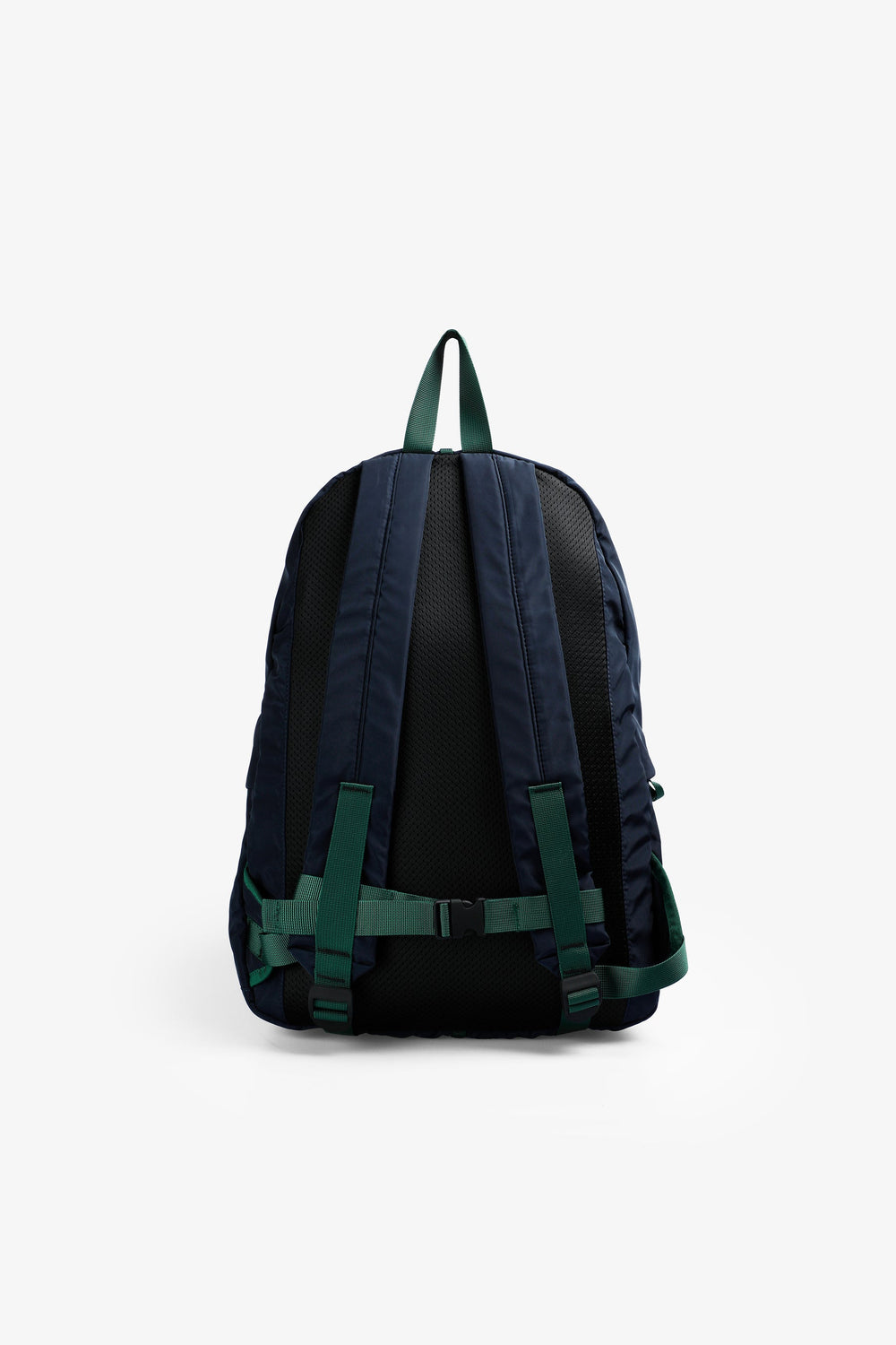 Technical backpack with zipped outer pocket, adjustable side pockets, padded mesh handles and back. Inner zipped pocket at back. Contrast logo on the front.