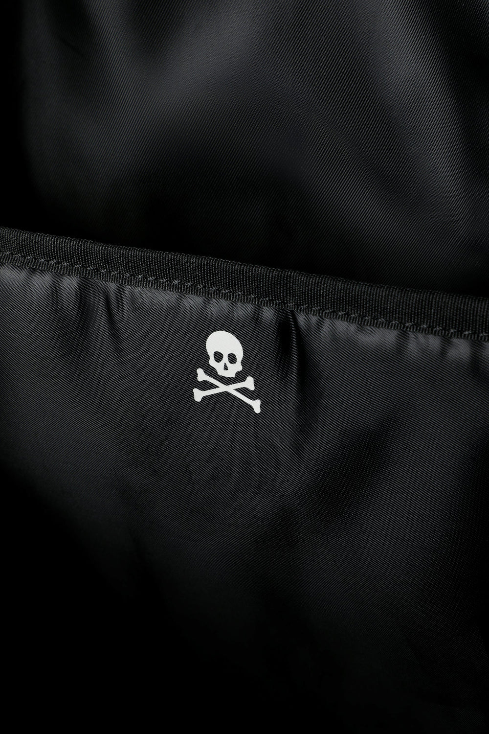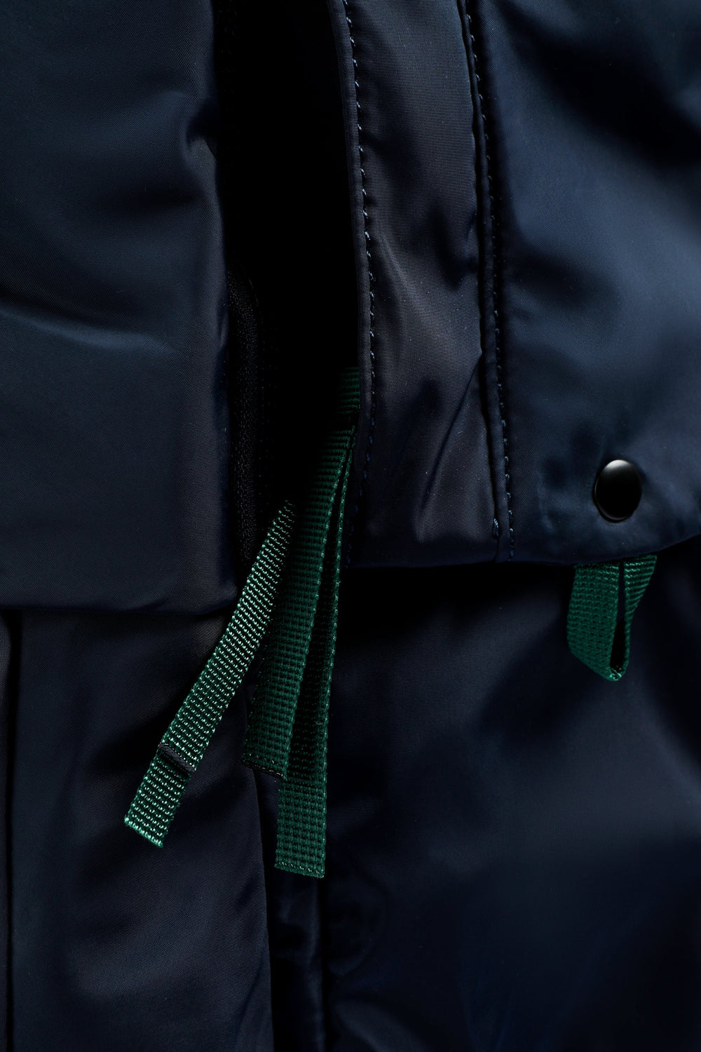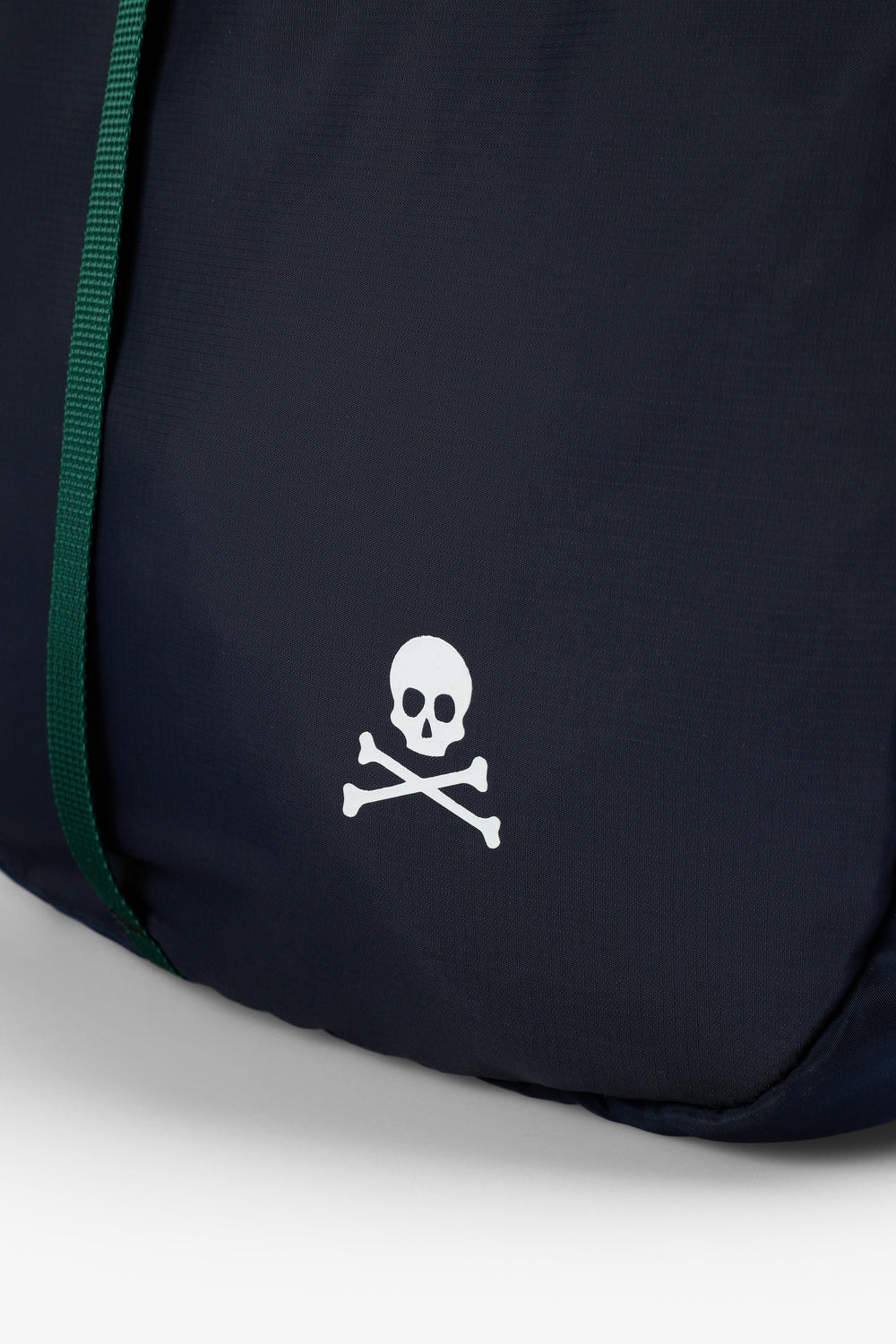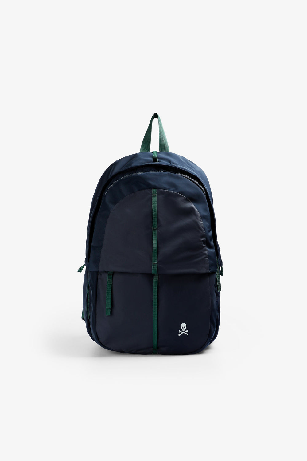 Technical backpack with zipped outer pocket, adjustable side pockets, padded mesh handles and back. Inner zipped pocket at back. Contrast logo on the front.