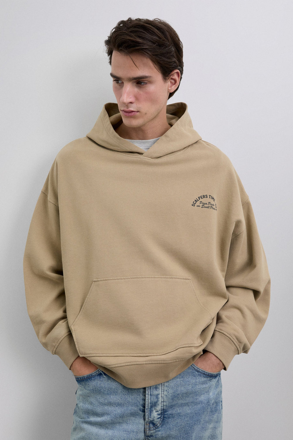 Sweatshirt with hood made of 100% BCI cotton. Print on the chest and logo on the back. Long sleeves. Ribbed trim on waist and cuffs. Pouch pocket on the front.