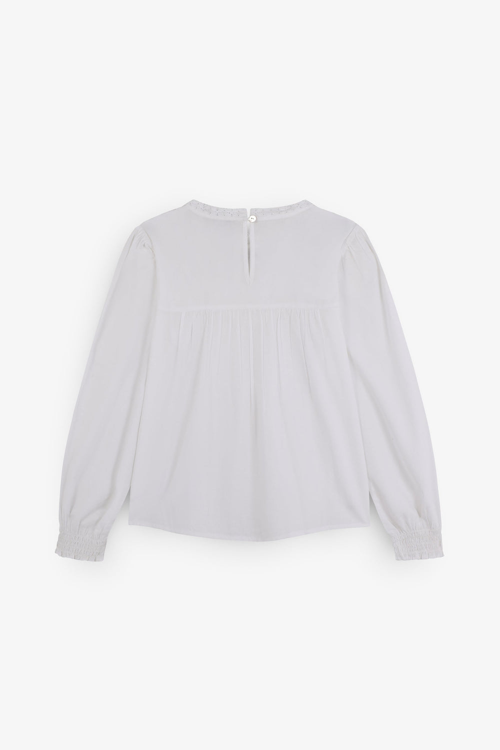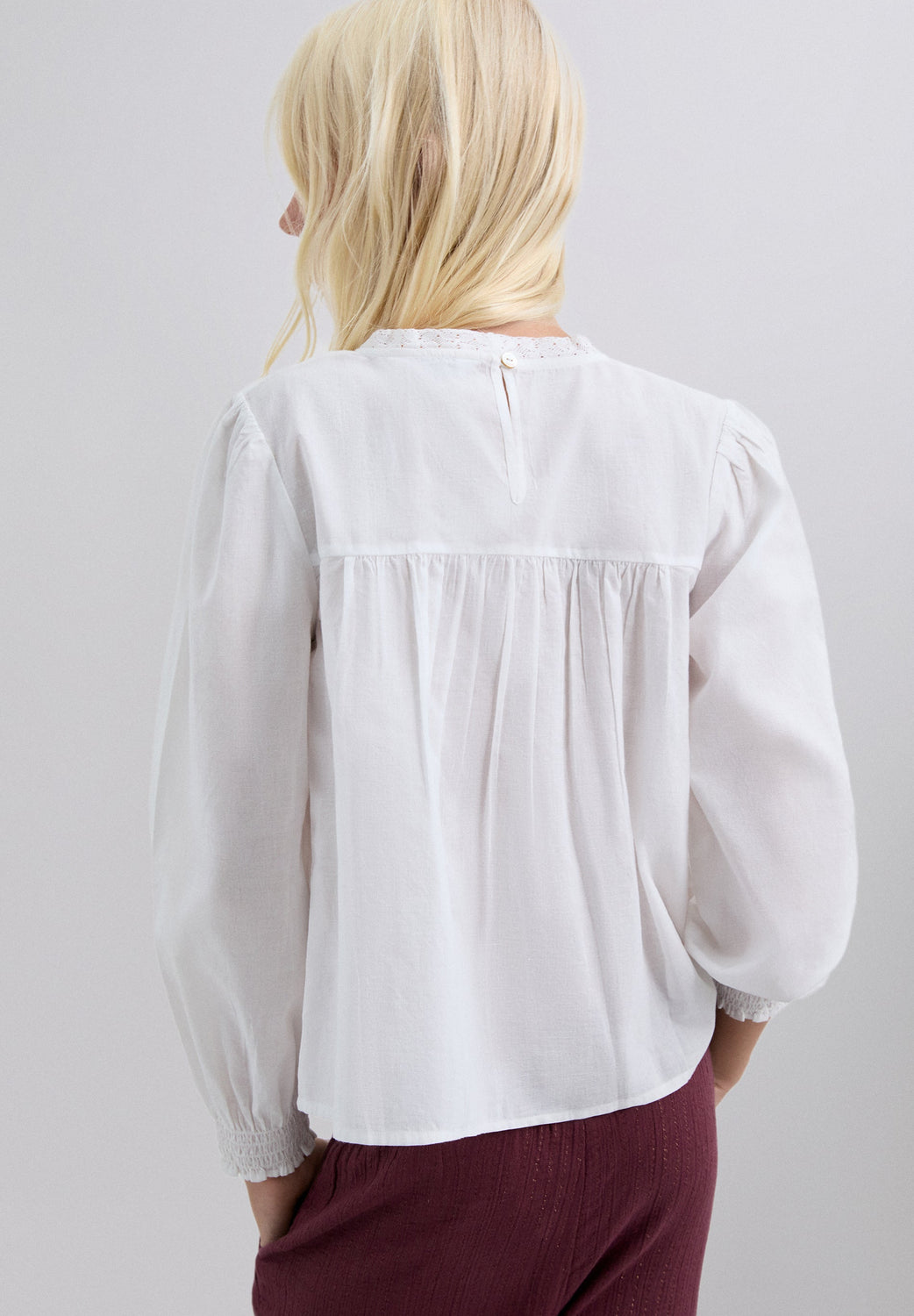Blouse made of 100% BCI cotton. Regular fit. Round neck. Long puff sleeves with elastic trim. Metallic logo detail on waistband. Embroidered details on collar and front. Back button fastening.