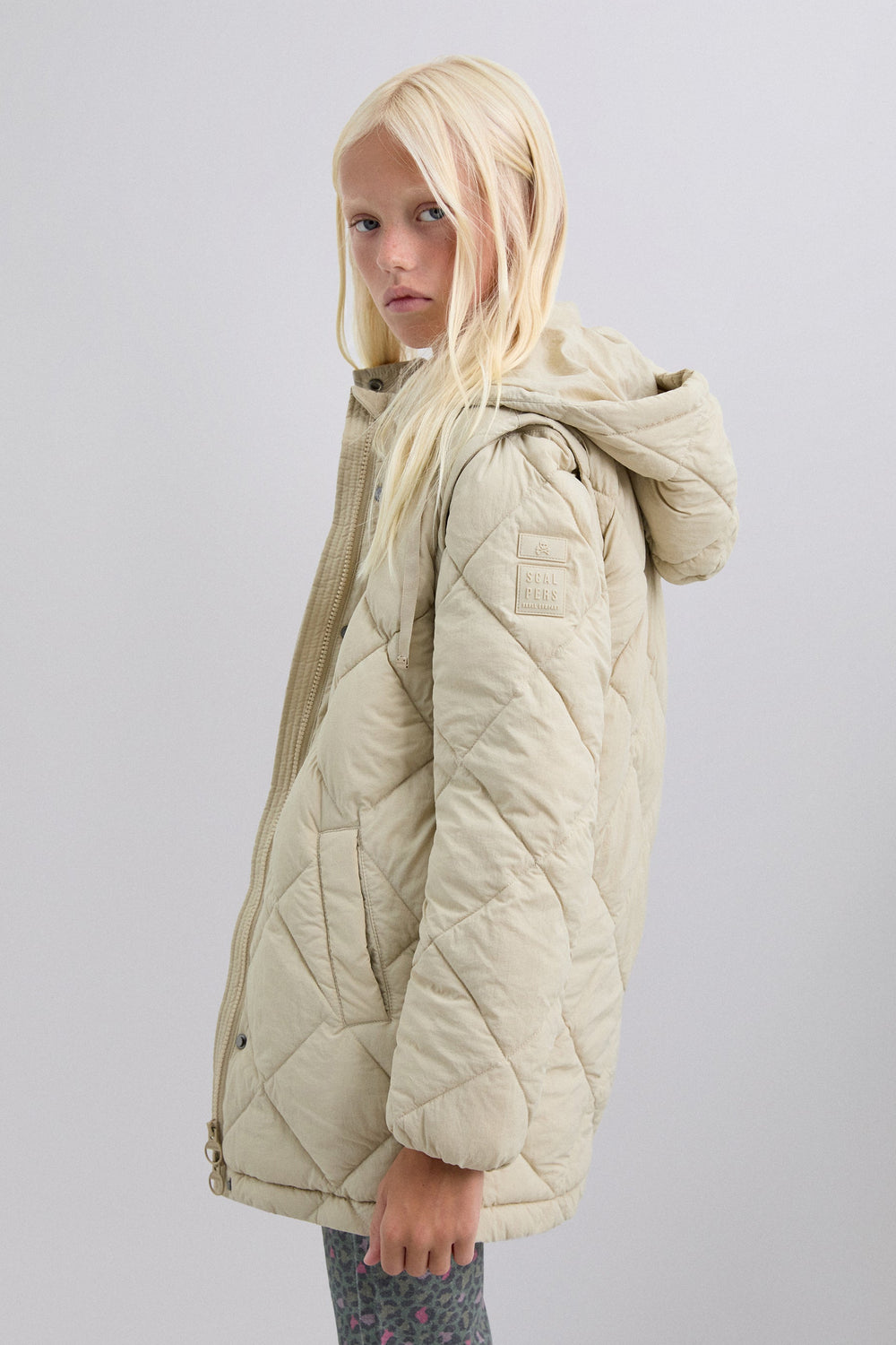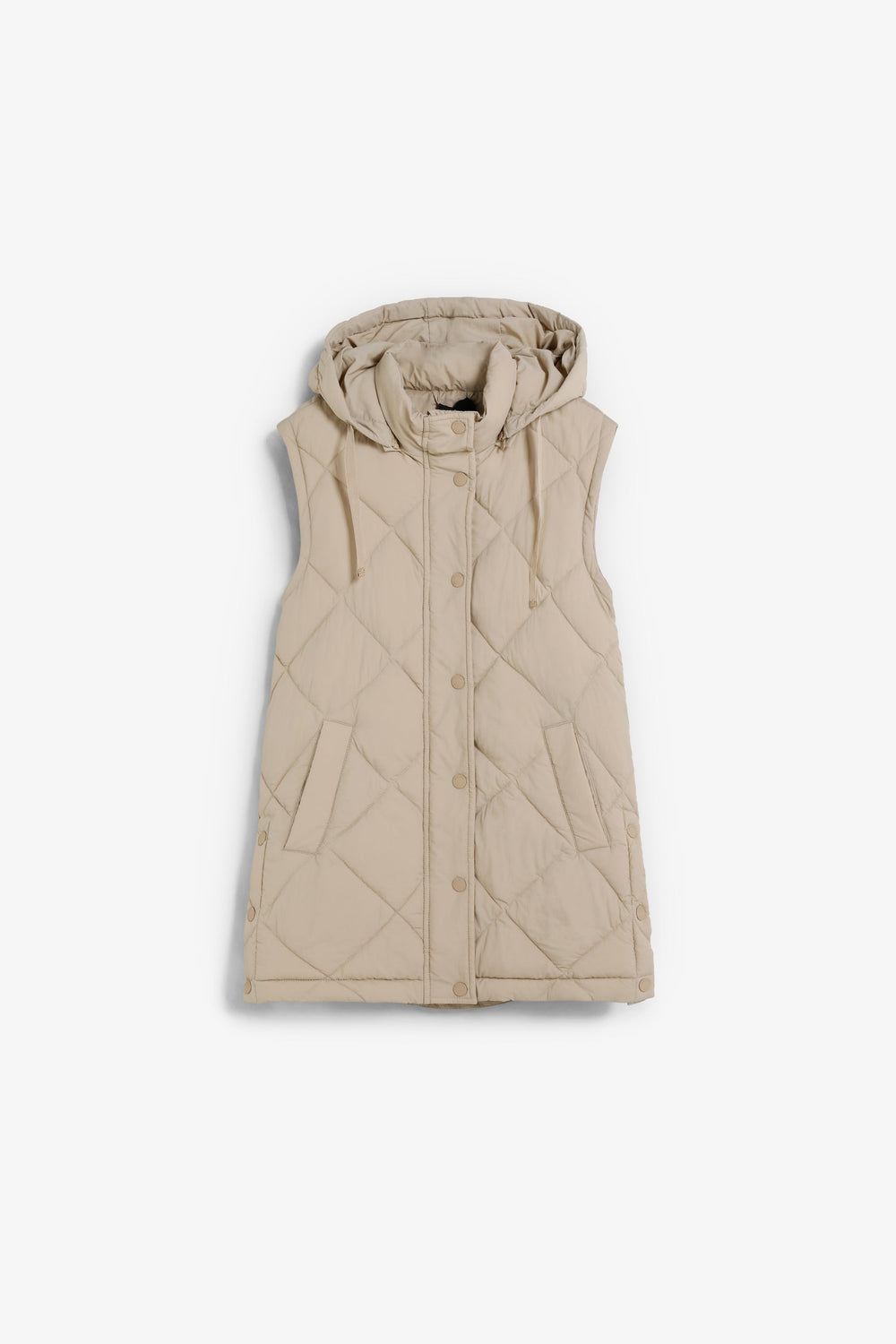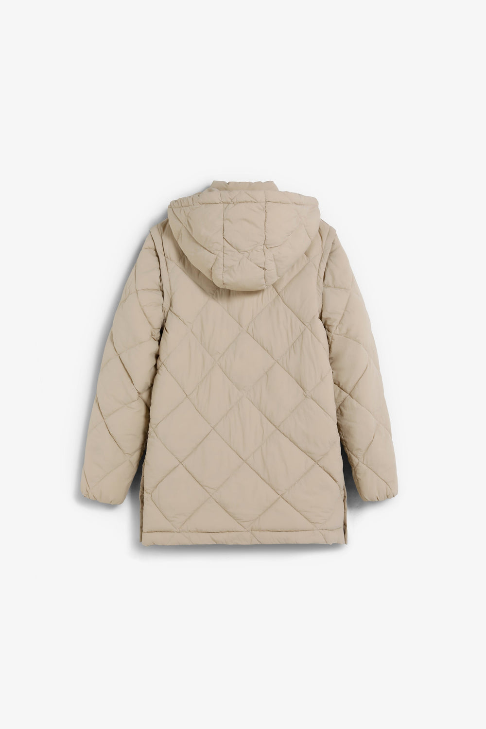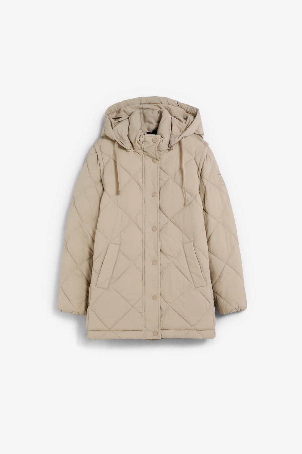 Padded coat. Detachable hood and sleeves. Front zip fastening concealed by placket with press stud fastening. Side pockets. Recycled fleece lining. Logo detail on the back.