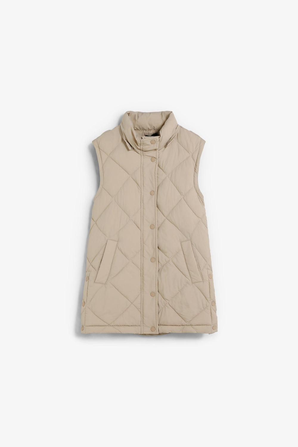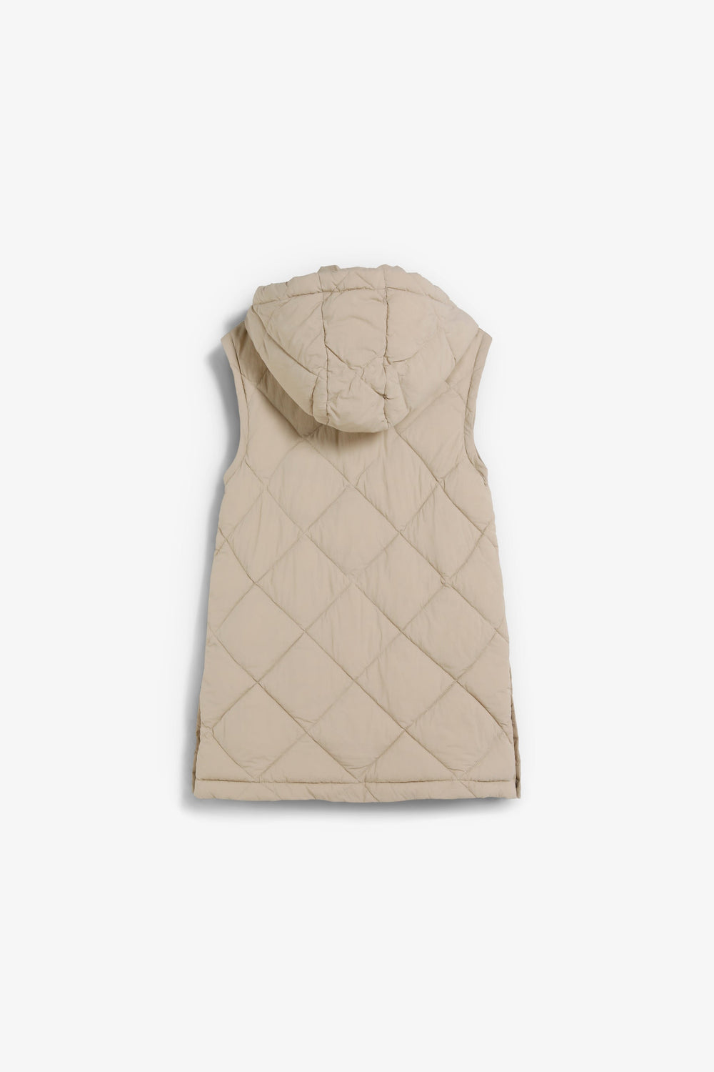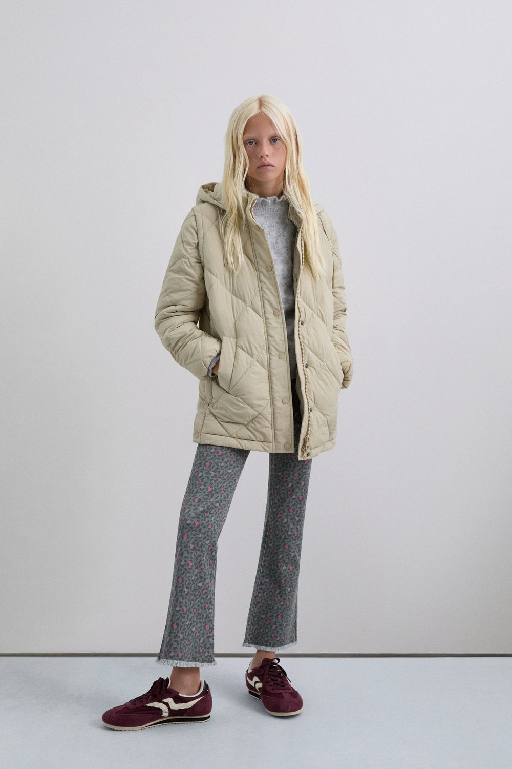 Padded coat. Detachable hood and sleeves. Front zip fastening concealed by placket with press stud fastening. Side pockets. Recycled fleece lining. Logo detail on the back.