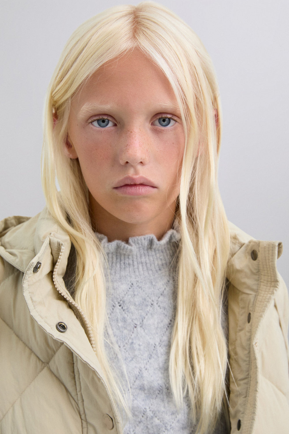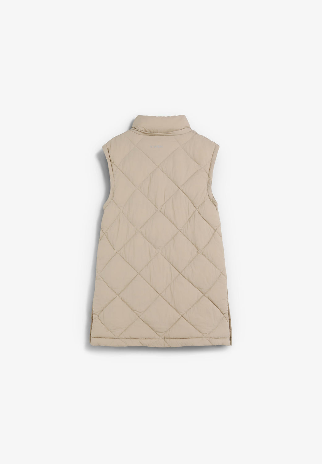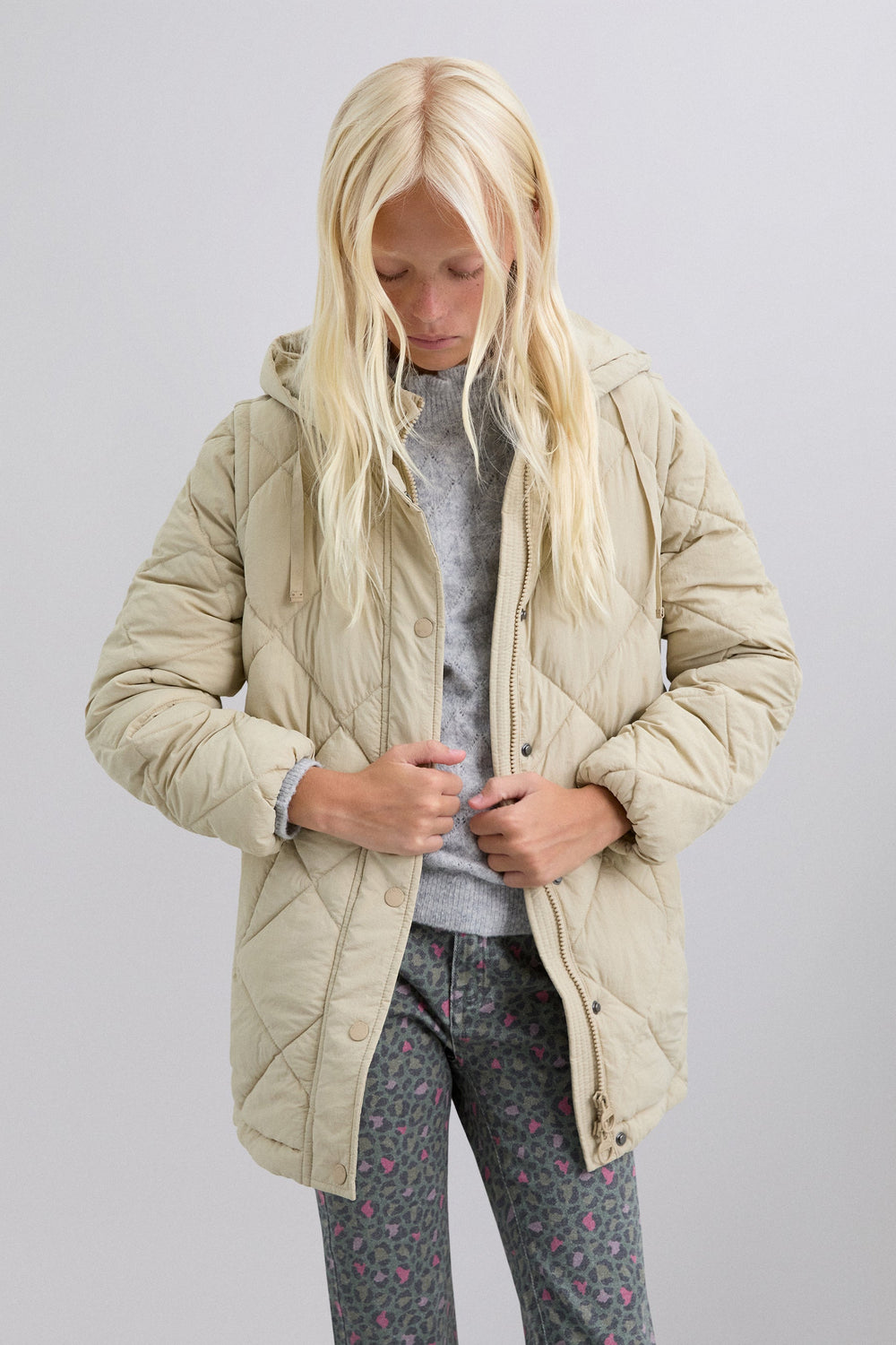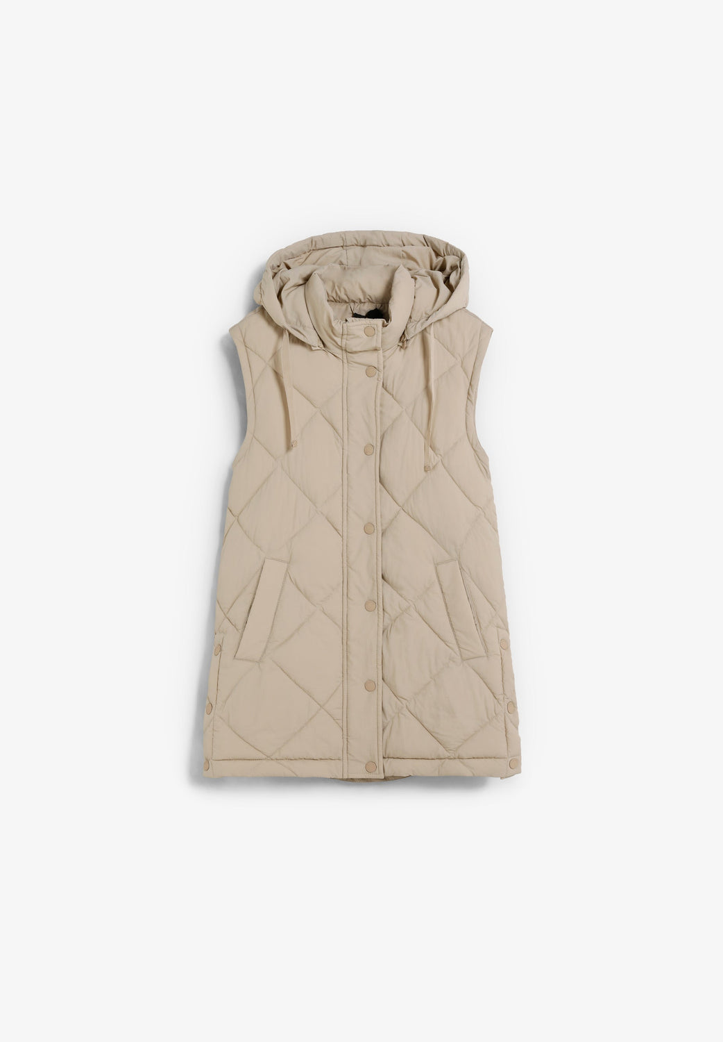 Padded coat. Detachable hood and sleeves. Front zip fastening concealed by placket with press stud fastening. Side pockets. Recycled fleece lining. Logo detail on the back.