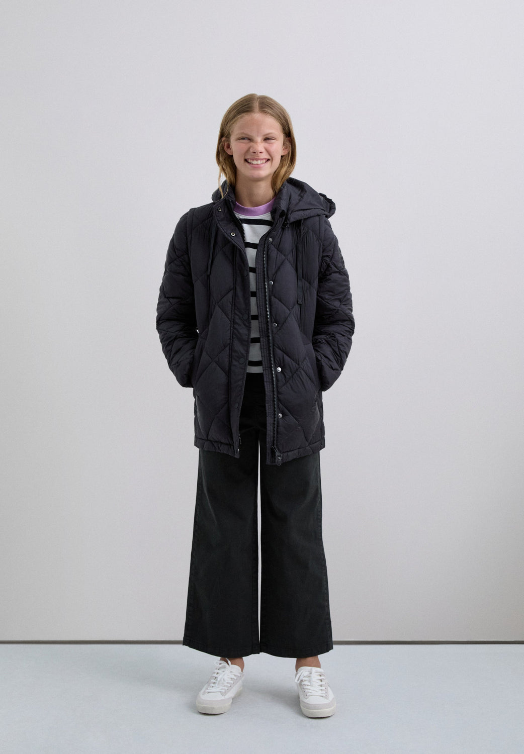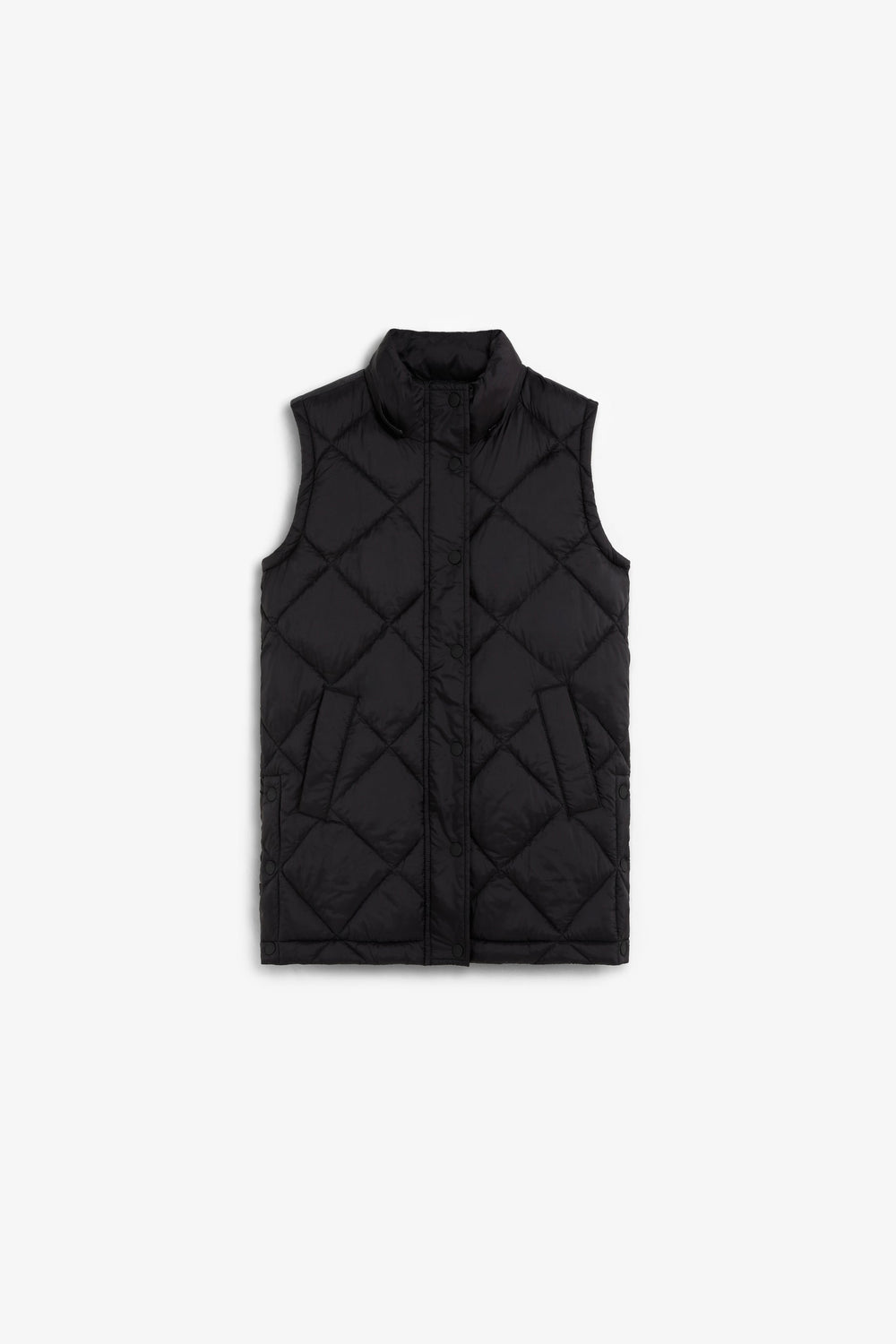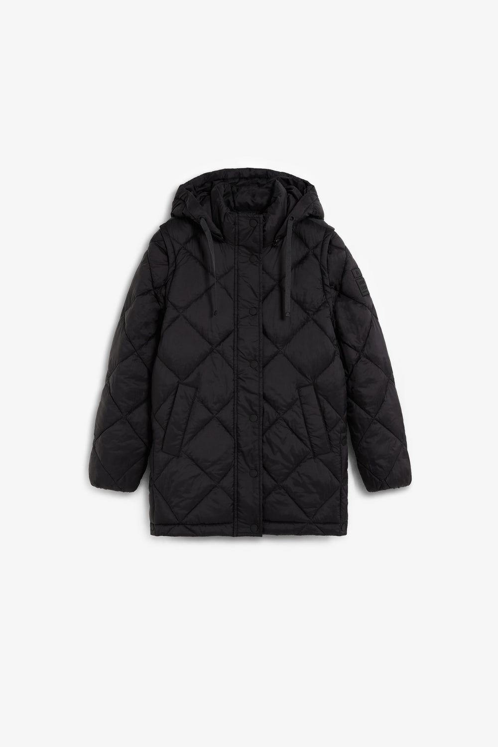 Padded coat. Detachable hood and sleeves. Front zip fastening concealed by placket with press stud fastening. Side pockets. Recycled fleece lining. Logo detail on the back.