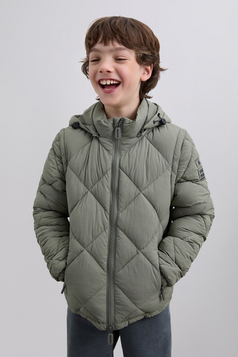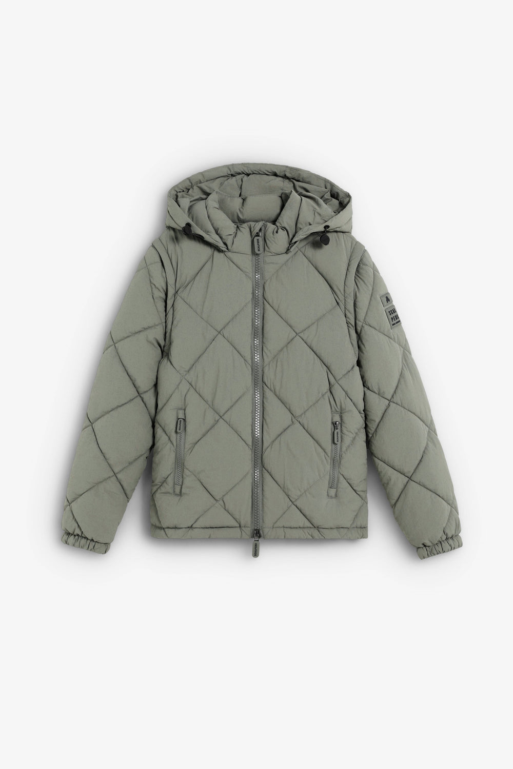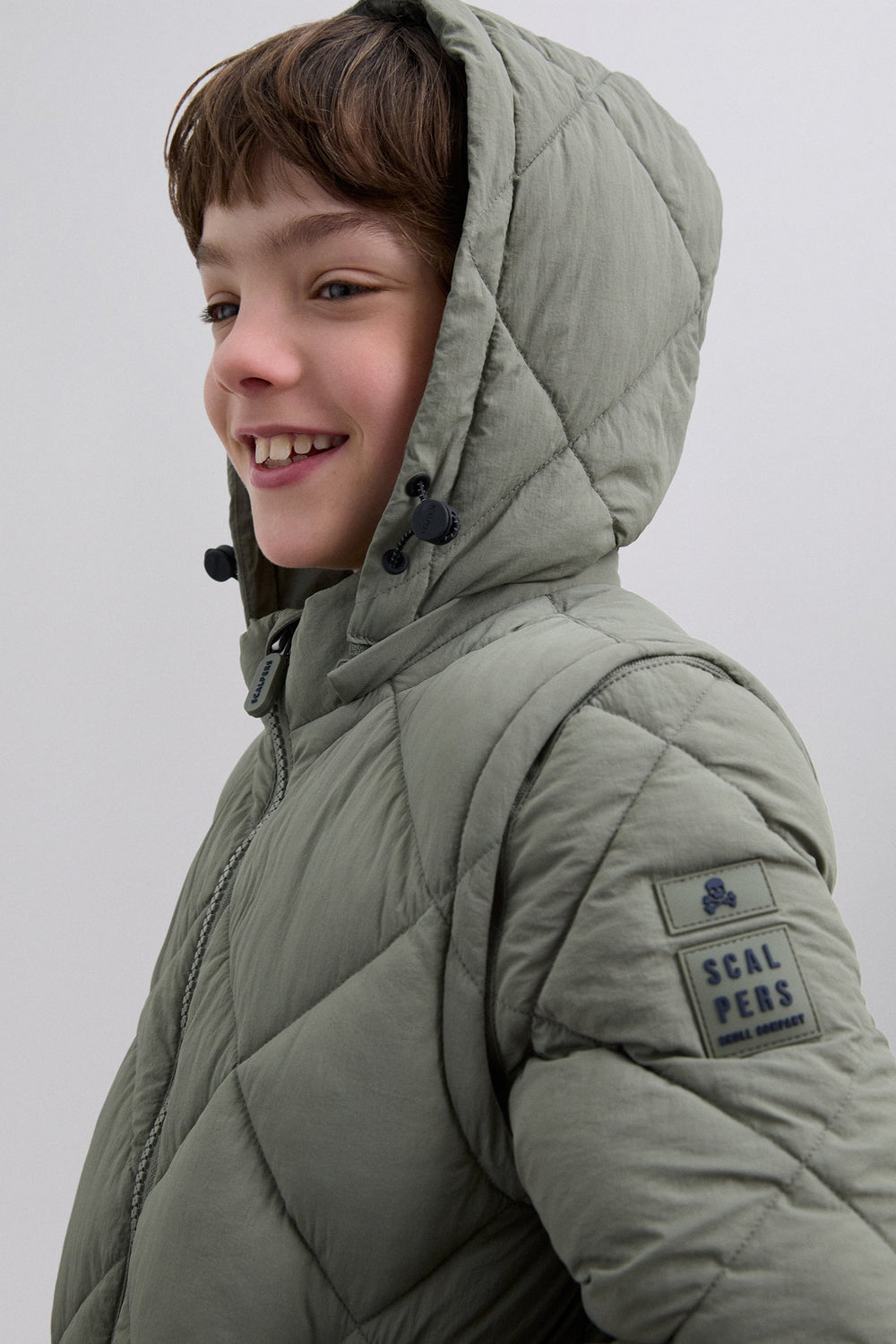 Jacket with hood and detachable long sleeves. Zip closure. Rubberised logo on sleeve. Front pocket. Logo detail at the neck.