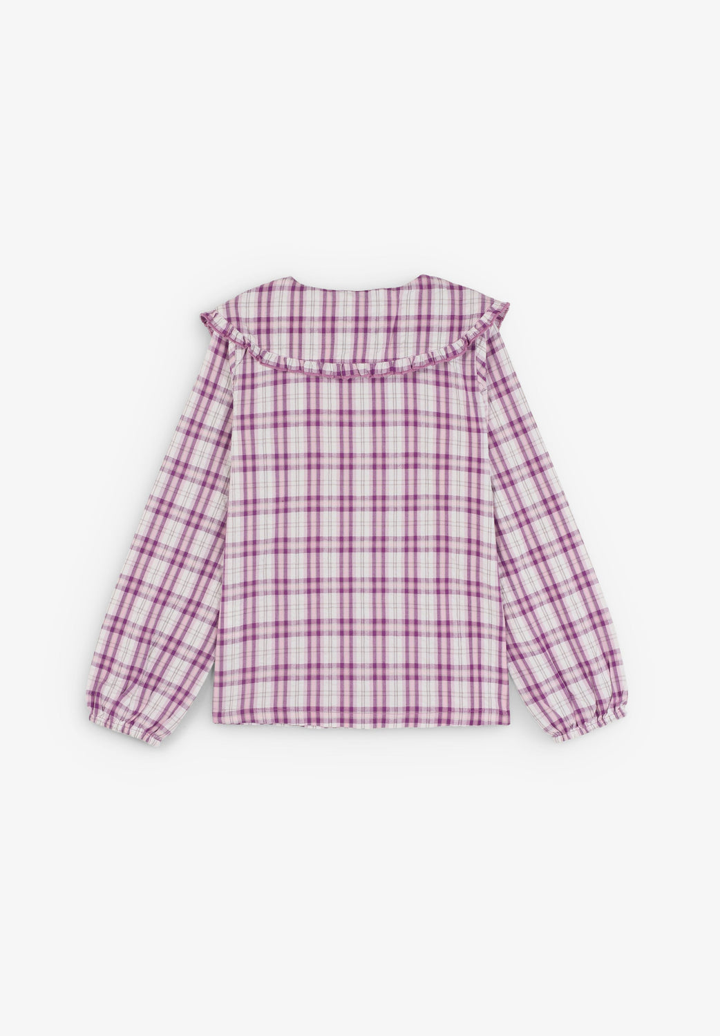 Shirt made of 100% BCI cotton. Ruffle collar with tie detail. Front button fastening. Check print.