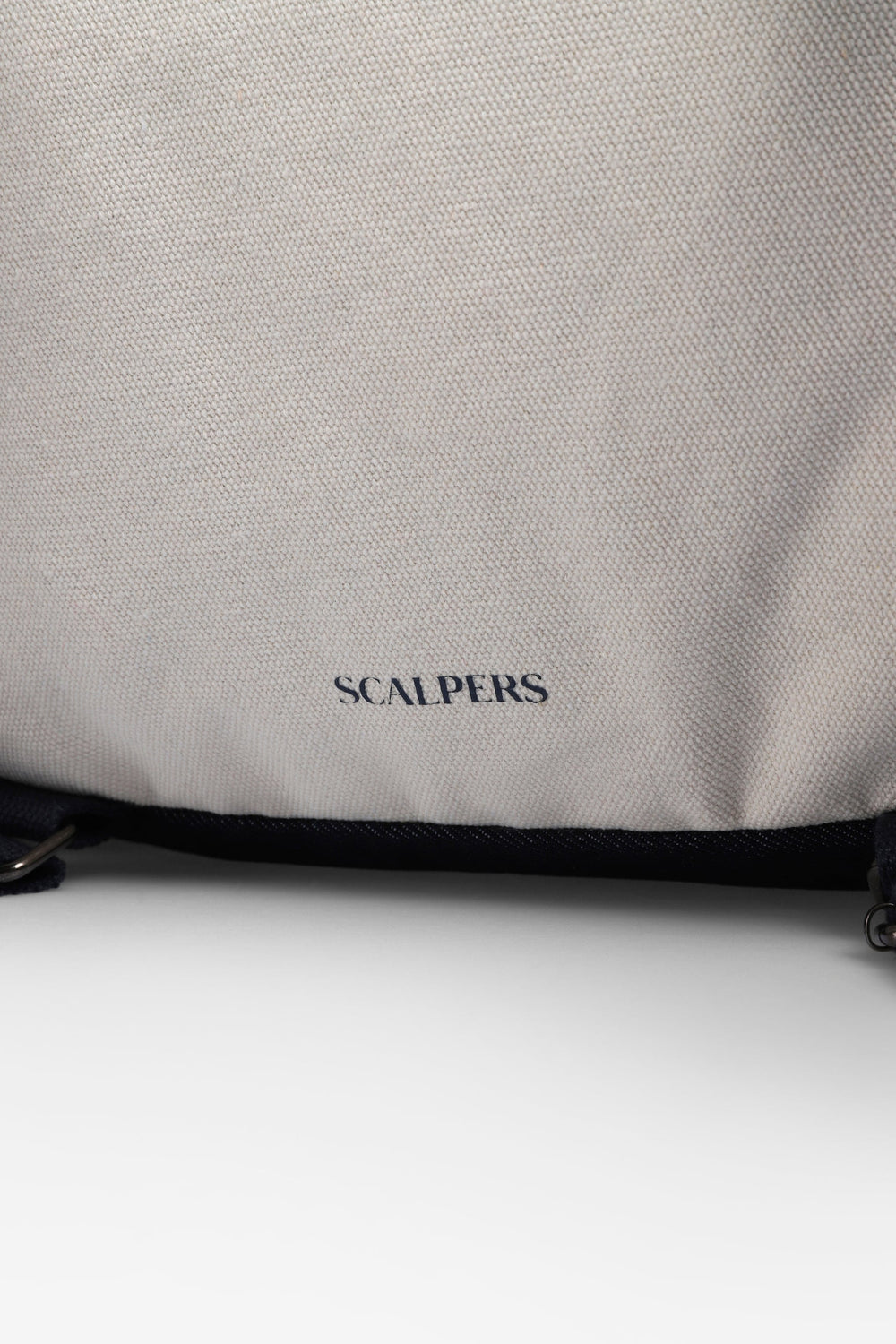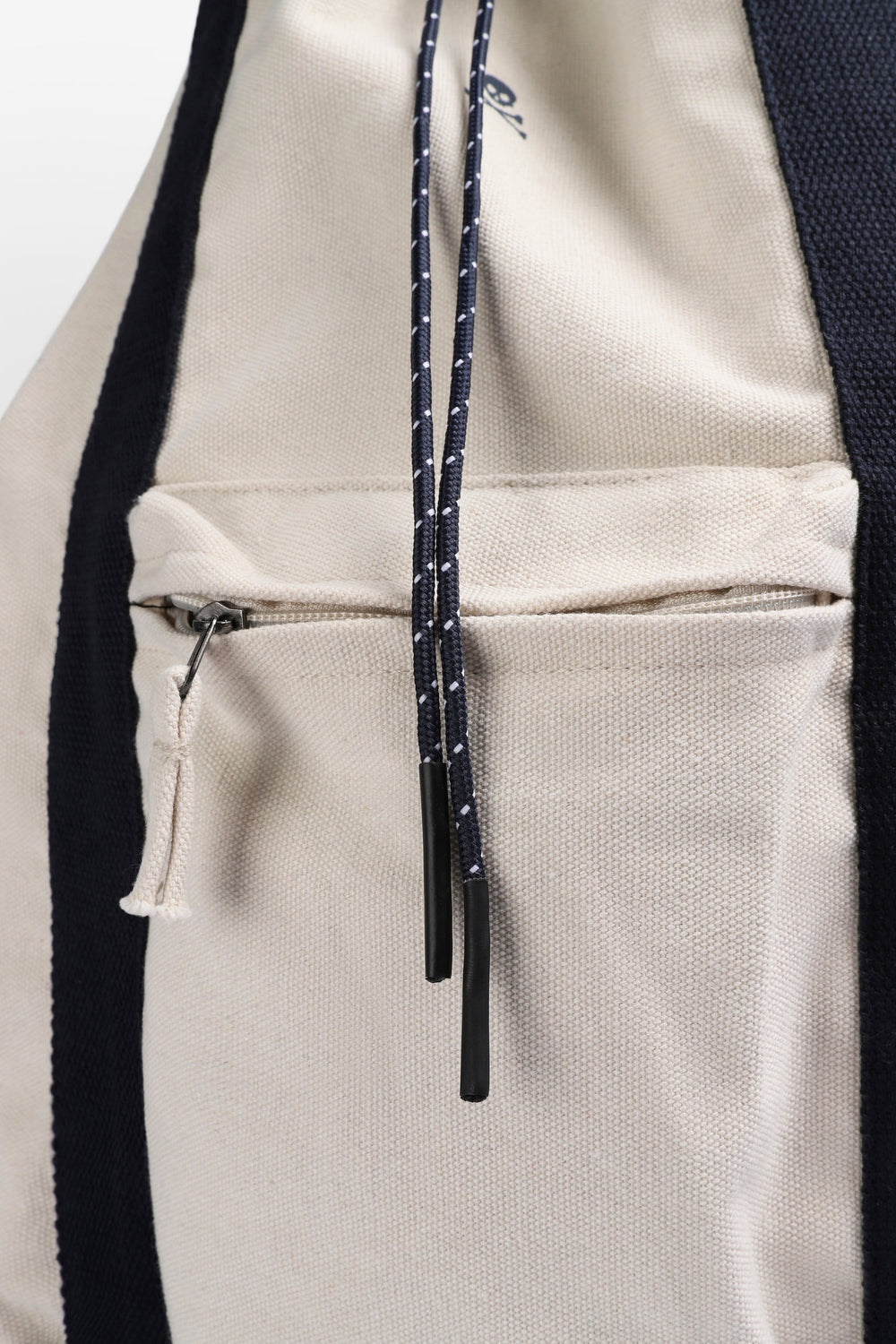 Backpack made of 100% cotton. Lined. Front pocket with zip fastening. Two side compartments. Shoulder straps. Embroidered logo detail on the front. Main fastening with adjustable cords.