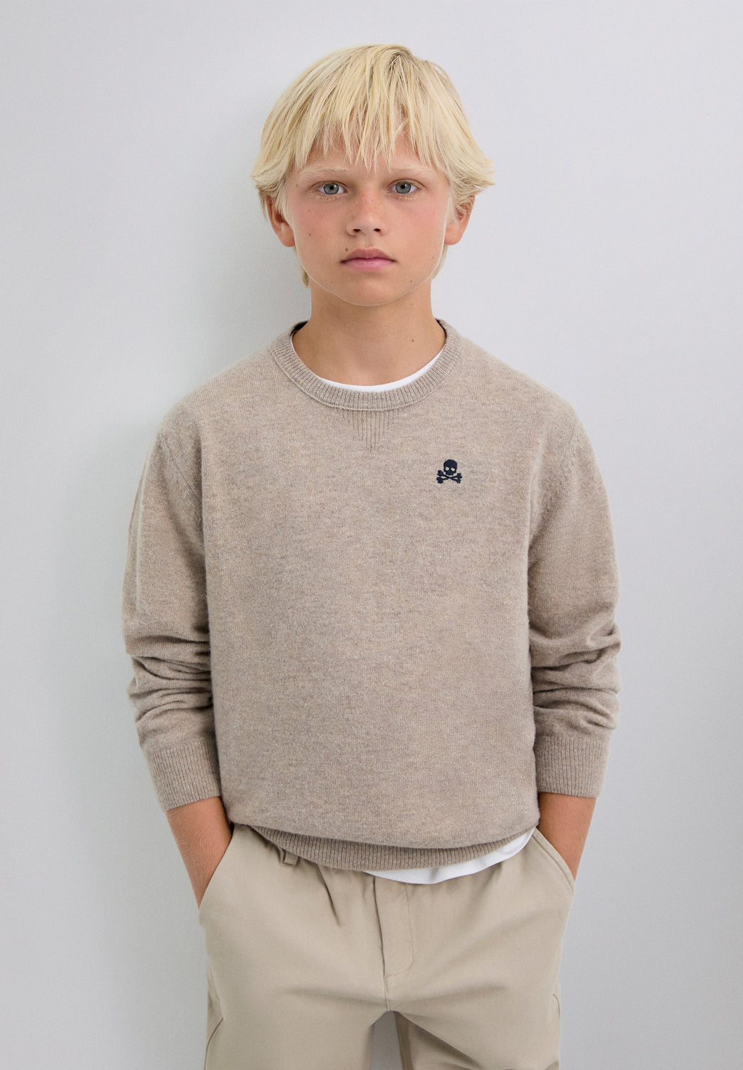 Sweater made of wool and polyamide blend. Regular fit. Round neck. Long sleeves. Contrast embroidered skull detail. Ribbed trim. Skull patch detail on the elbow pads.