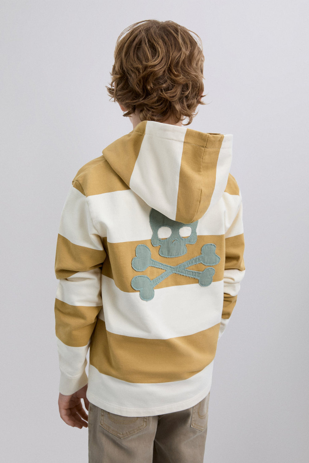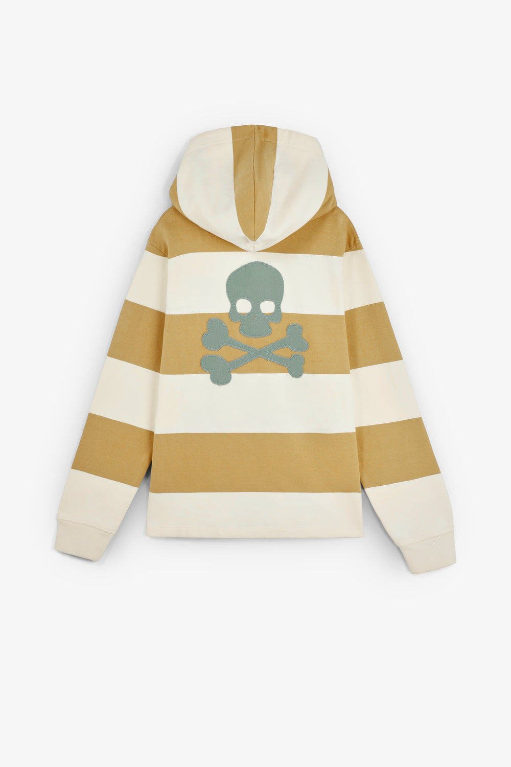 Sweatshirt with adjustable drawstring hood, made of 100% BCI cotton. Stripe print. Embroidered motif on chest and skull on back. Half neck with front button.