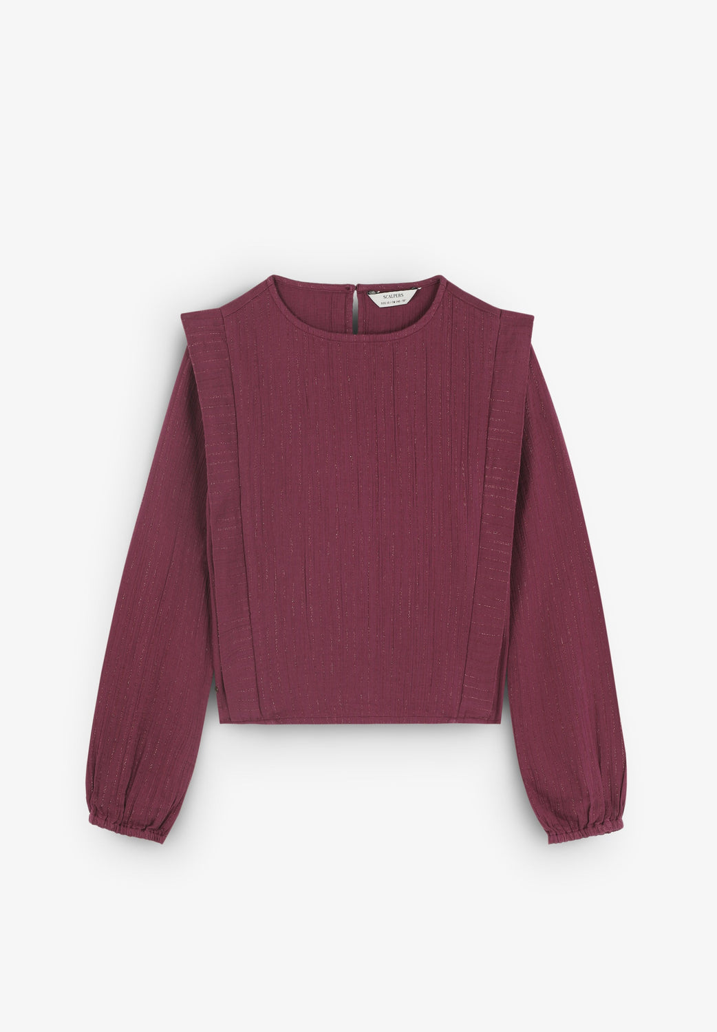 Blouse made of BCI cotton. Round neck. Front pleats. Ribbed details. Long sleeves. Elasticated cuffs. Back button fastening.