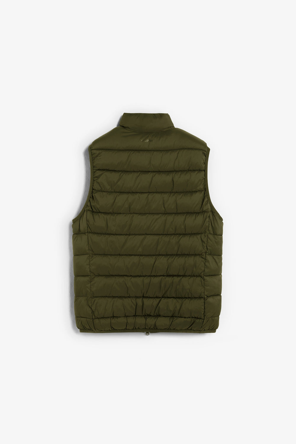 Puffer vest made of cotton and recycled polyester fabric. Slim fit. High collar. Double slider zip fastening. Zip pockets and an inner pocket. Logo detail on the chest