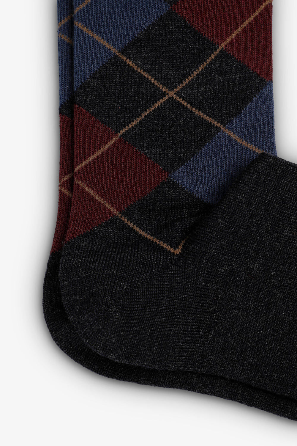 Over-the-calf socks in a wool blend. Diamond pattern. Embroidered skull detail at the top.