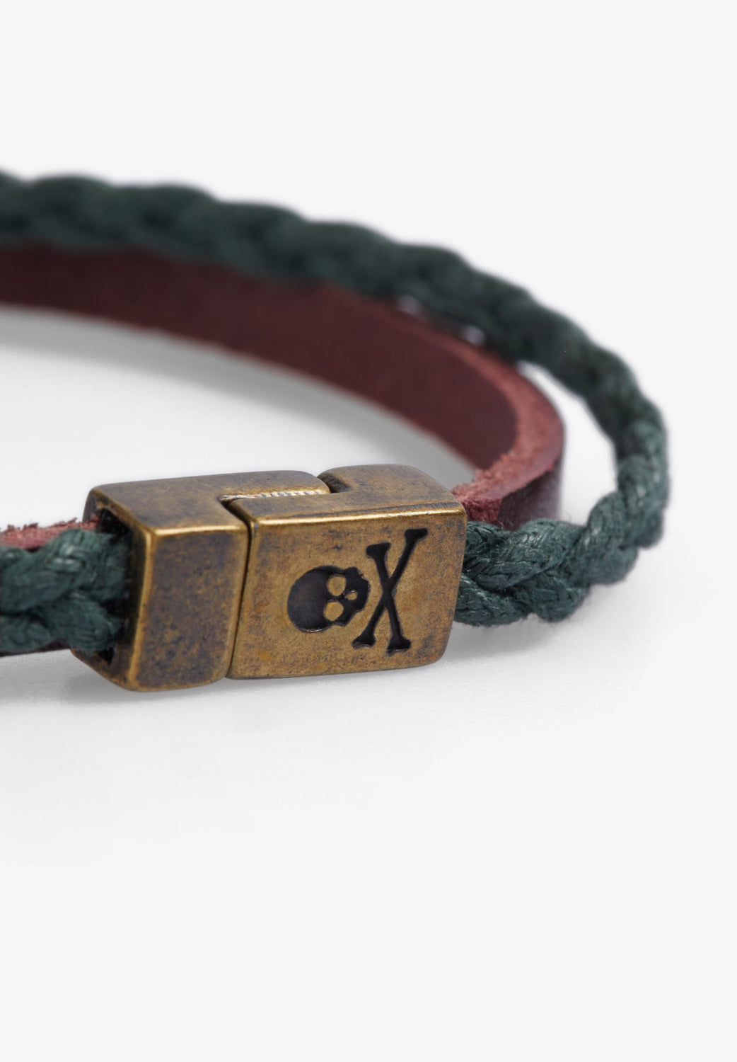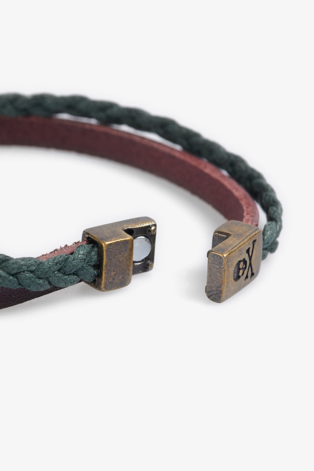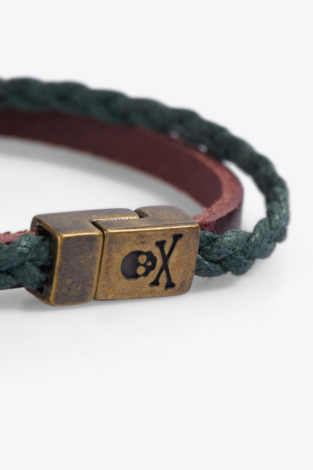 Leather bracelet made of 100% leather and cotton. Metal detail, engraved skull and snap closure.