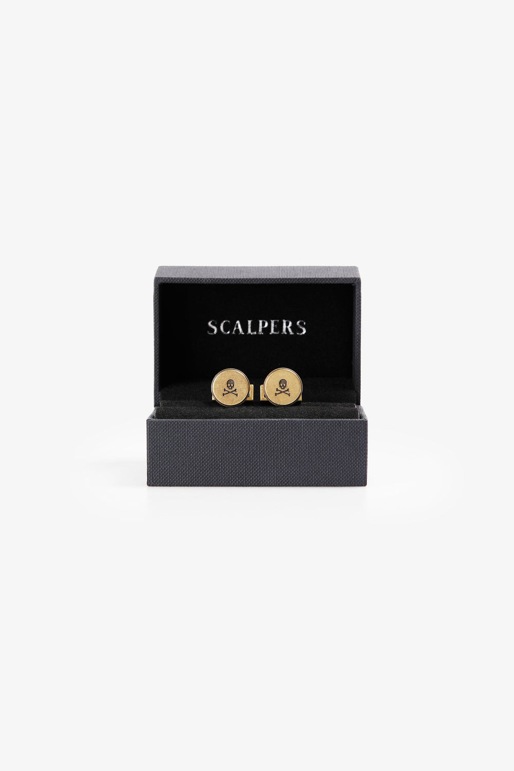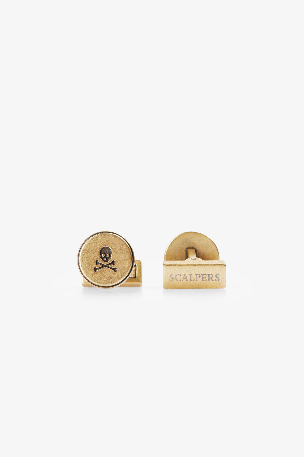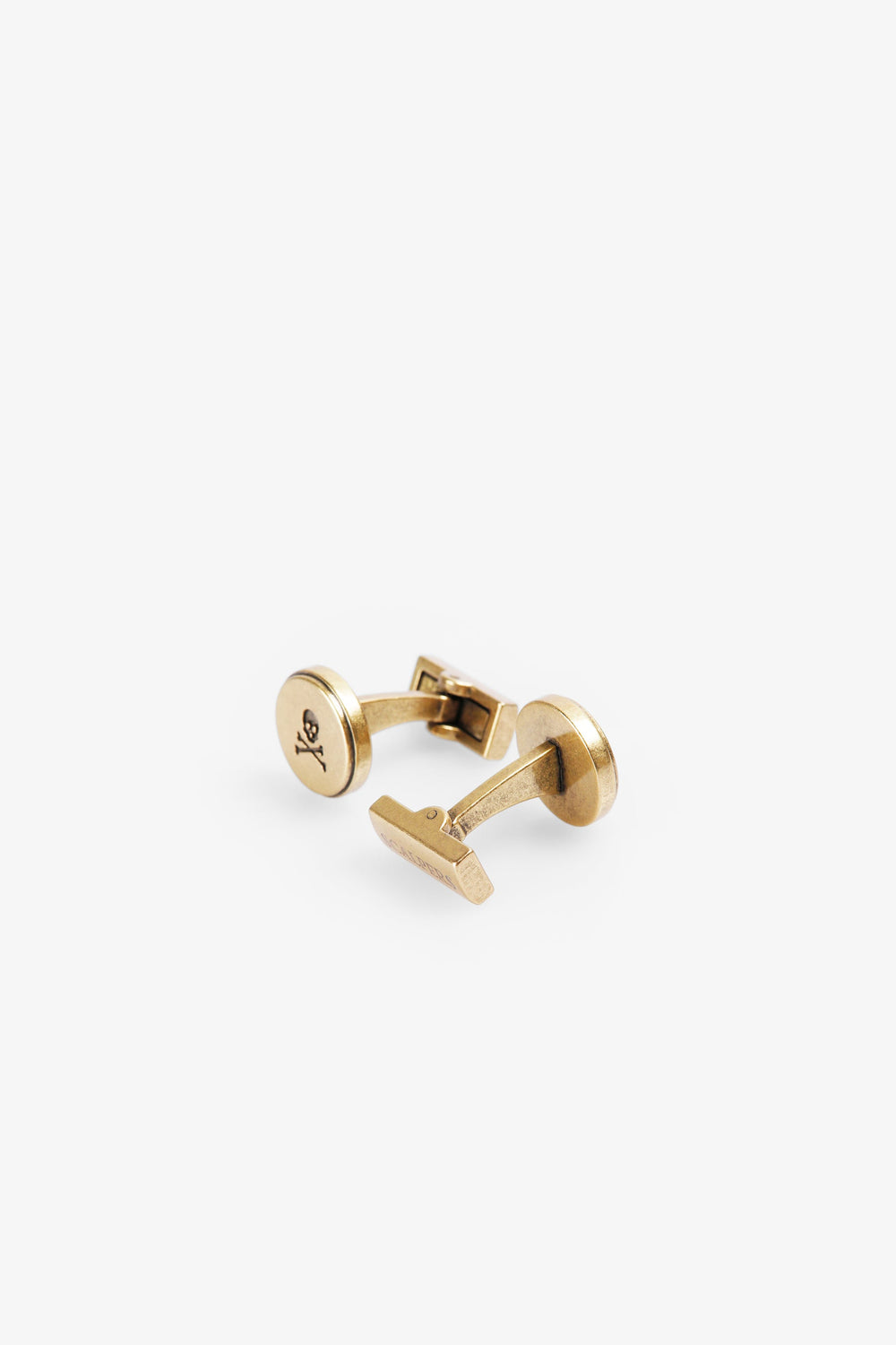 Brass cufflinks with engraved skull. Logo detail on the back.