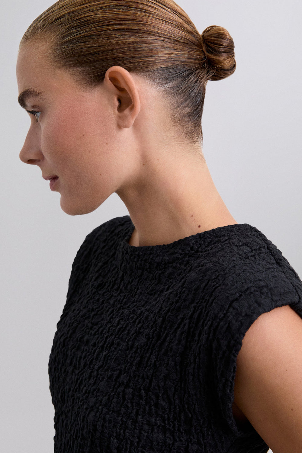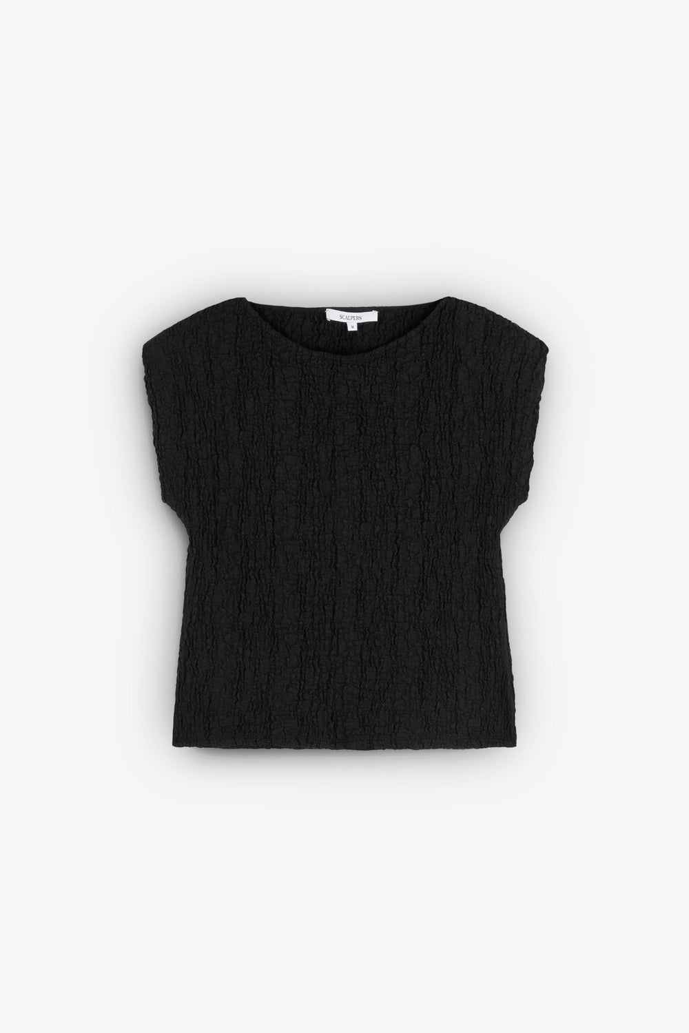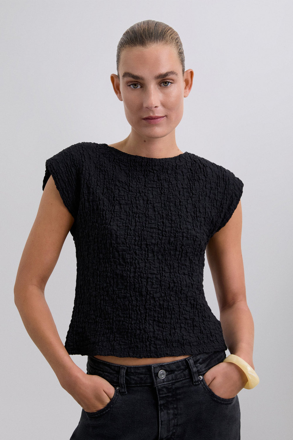 T-shirt made of slightly stretchy cotton blend fabric with crinkle texture. Slim fit, round neck, short sleeves with slightly padded shoulders.