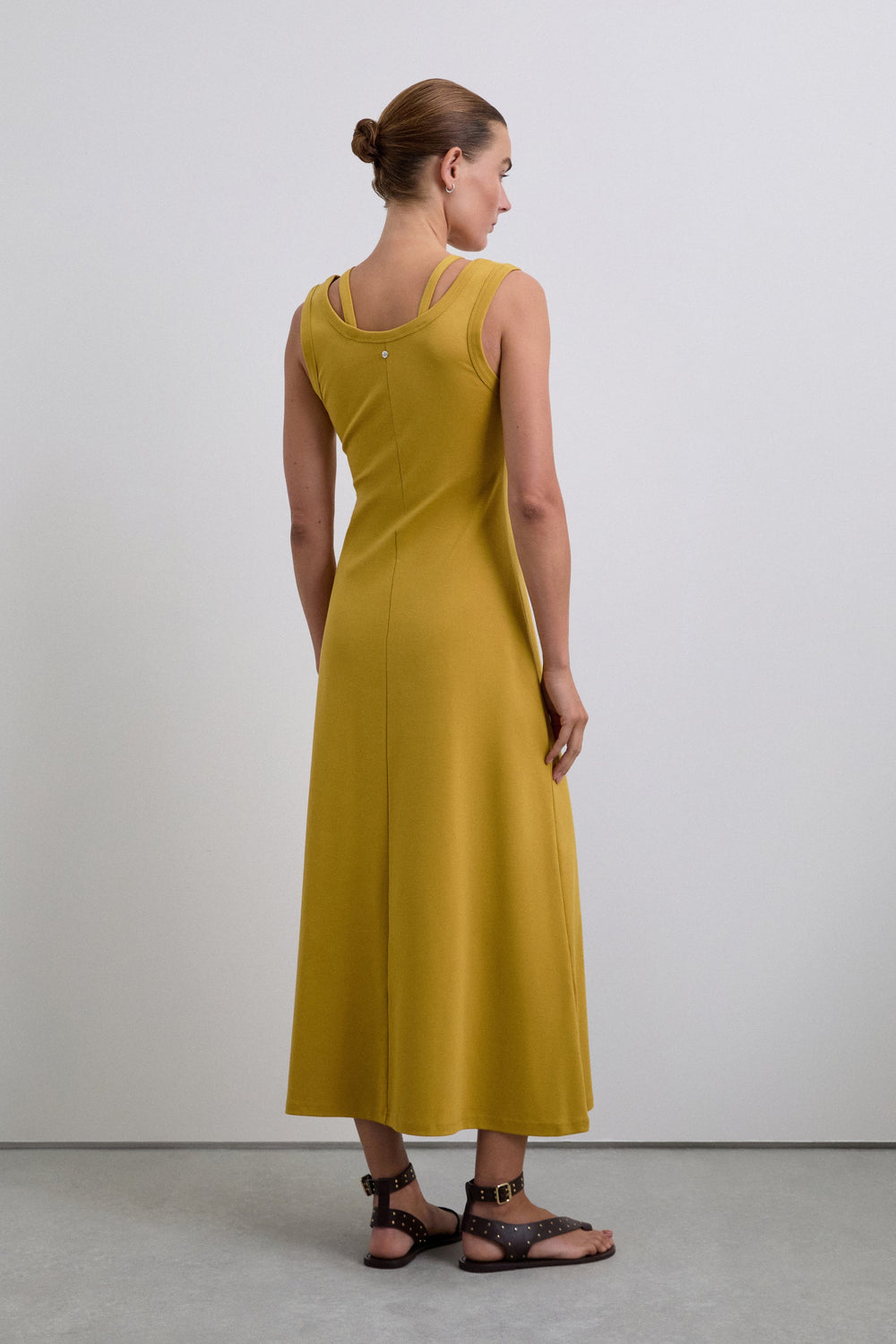 Midi dress made of 100% organic BCI cotton. Sleeveless. Cut out on straps. V-neck. Metal appliqué detail on the back.