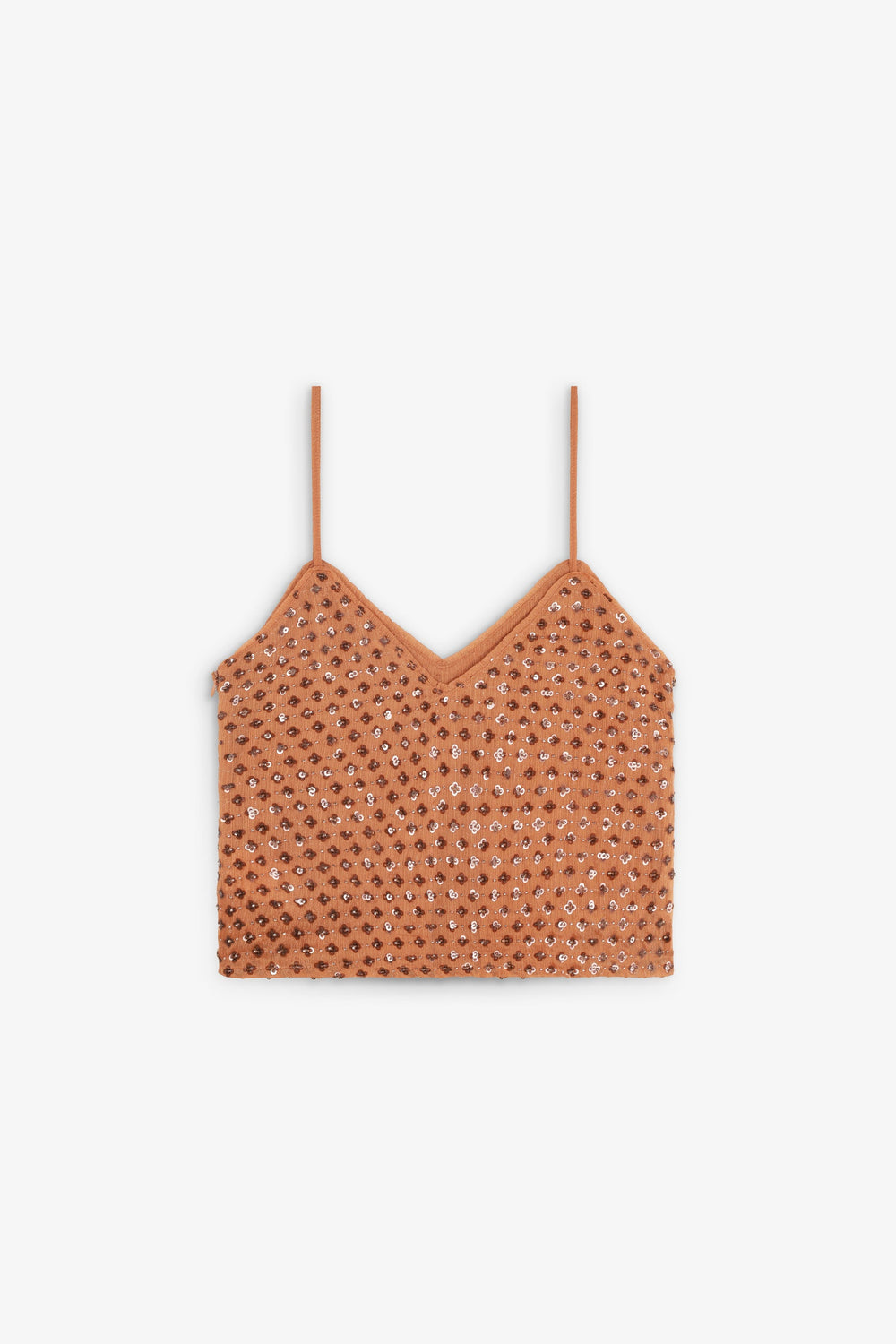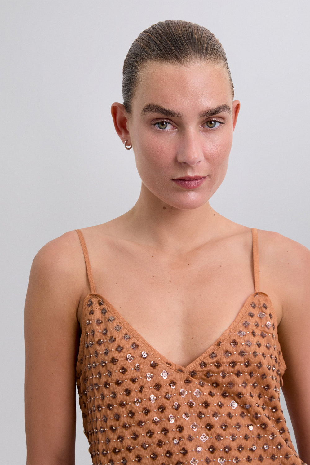 V-neck top with thin straps. Sequinned appliqué detail. Side zip fastening.