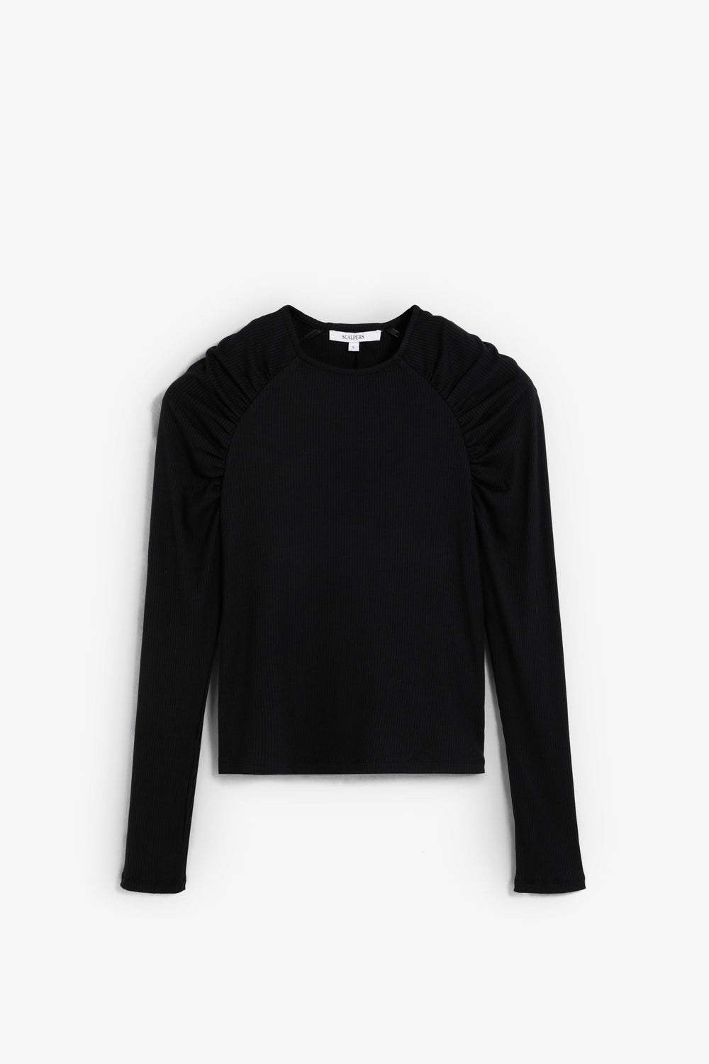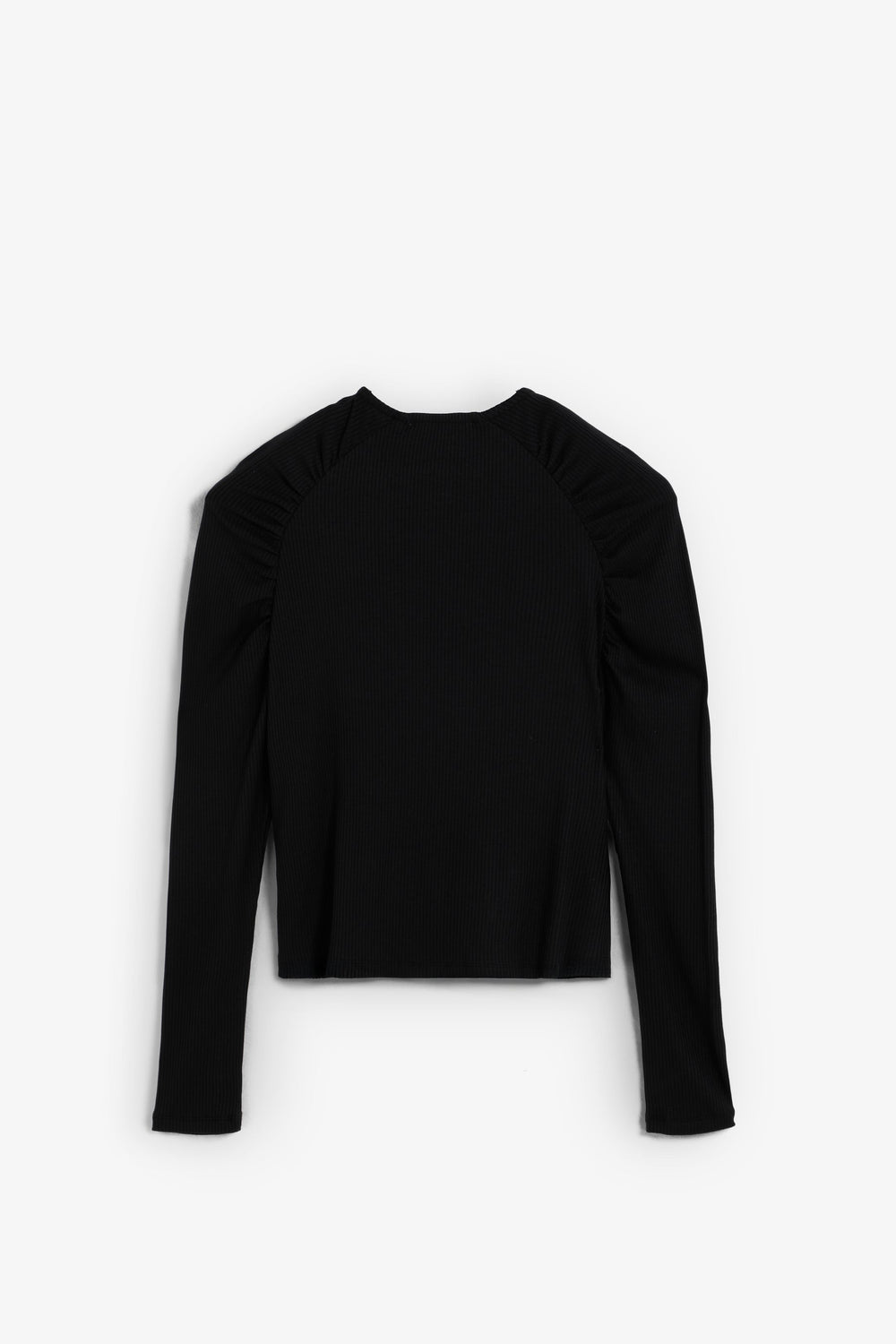 Long sleeve ribbed T-shirt. Gathered detail on the shoulders. Stretch fabric and round neck.