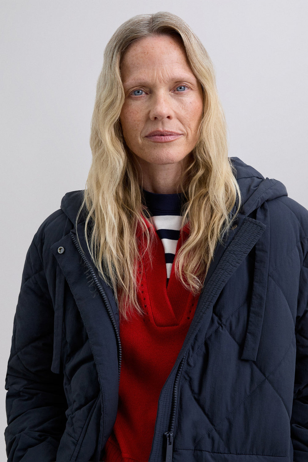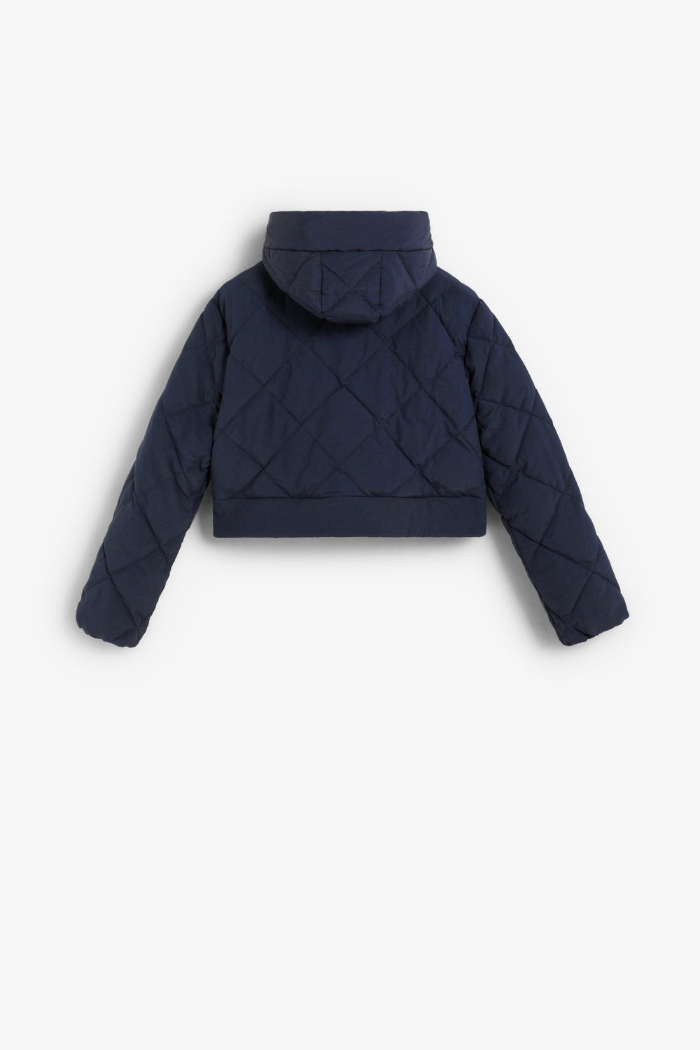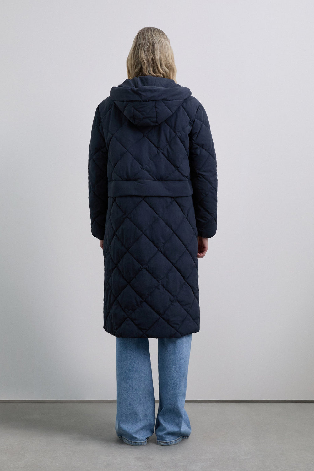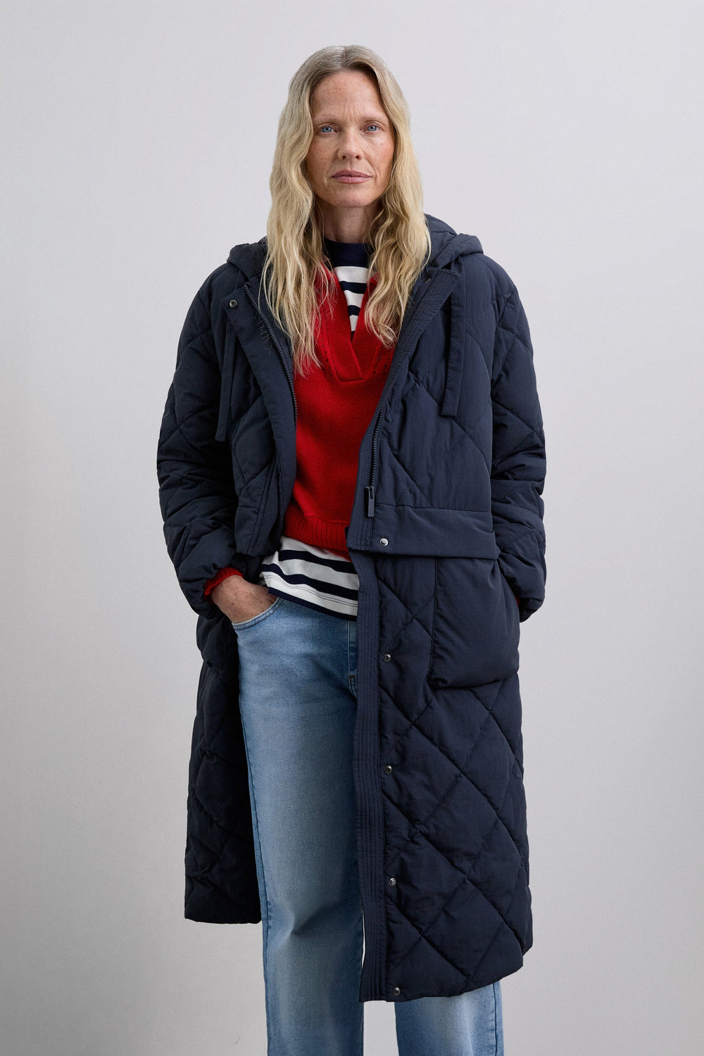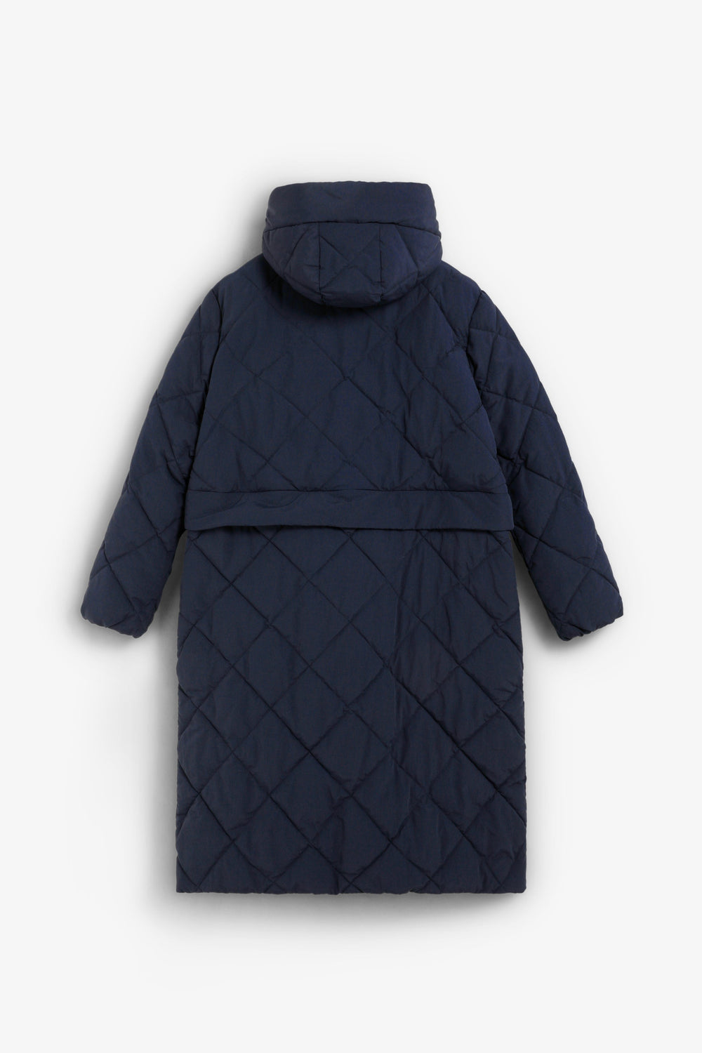 Detachable waterproof nylon padded long coat. The long coat can be converted into a short jacket. Front concealed zip fastening. Hood.