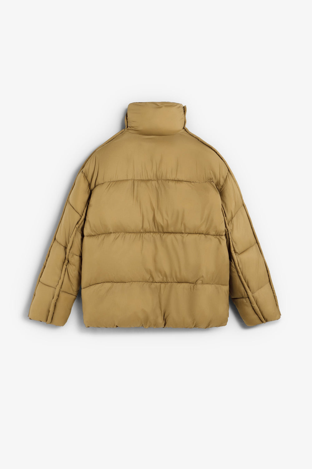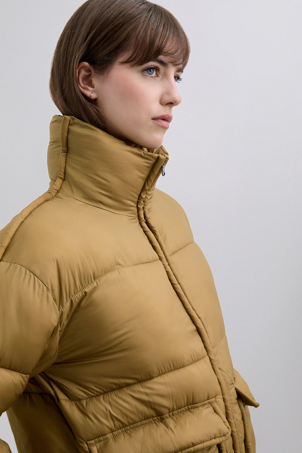 Puffer jacket with front pockets. Front zip fastening. High neck and long sleeves.