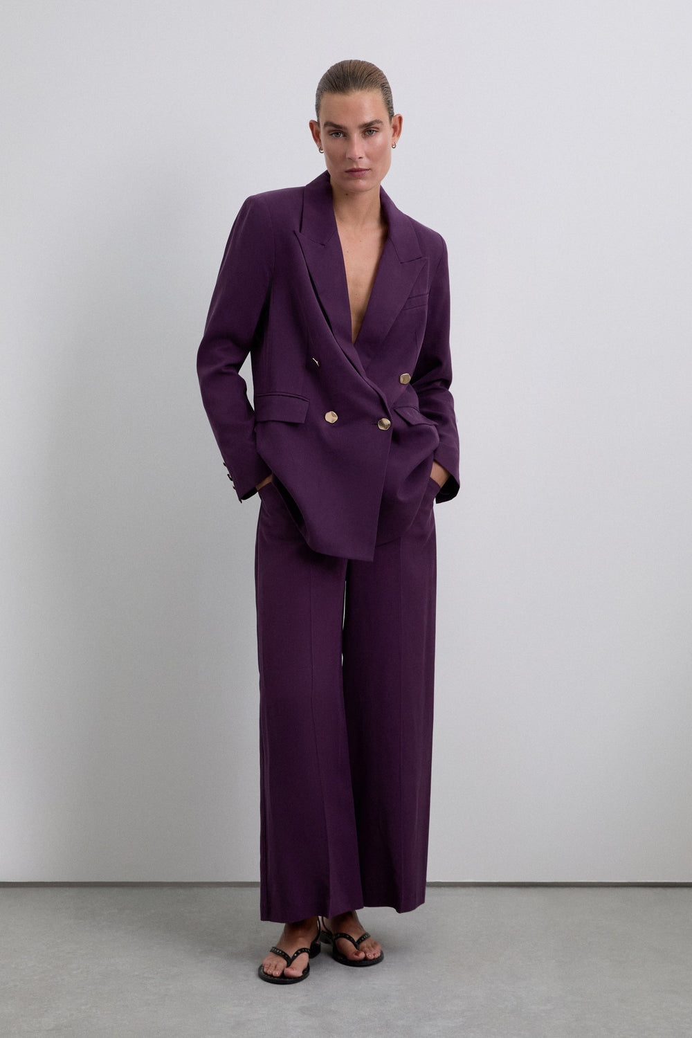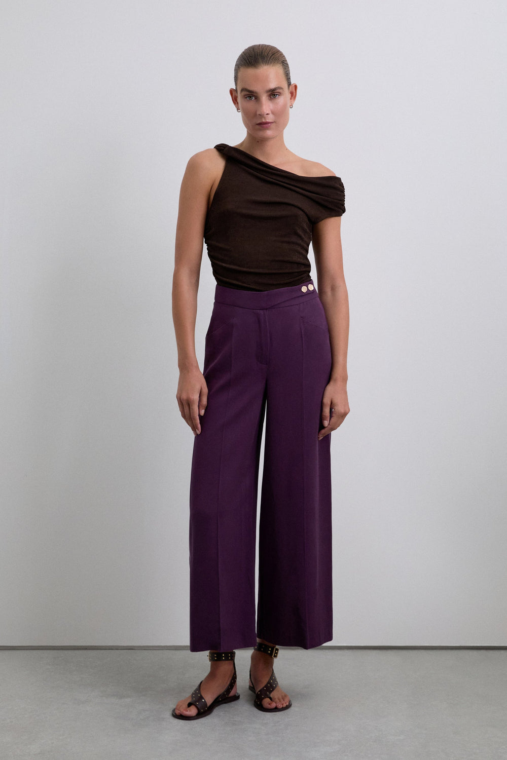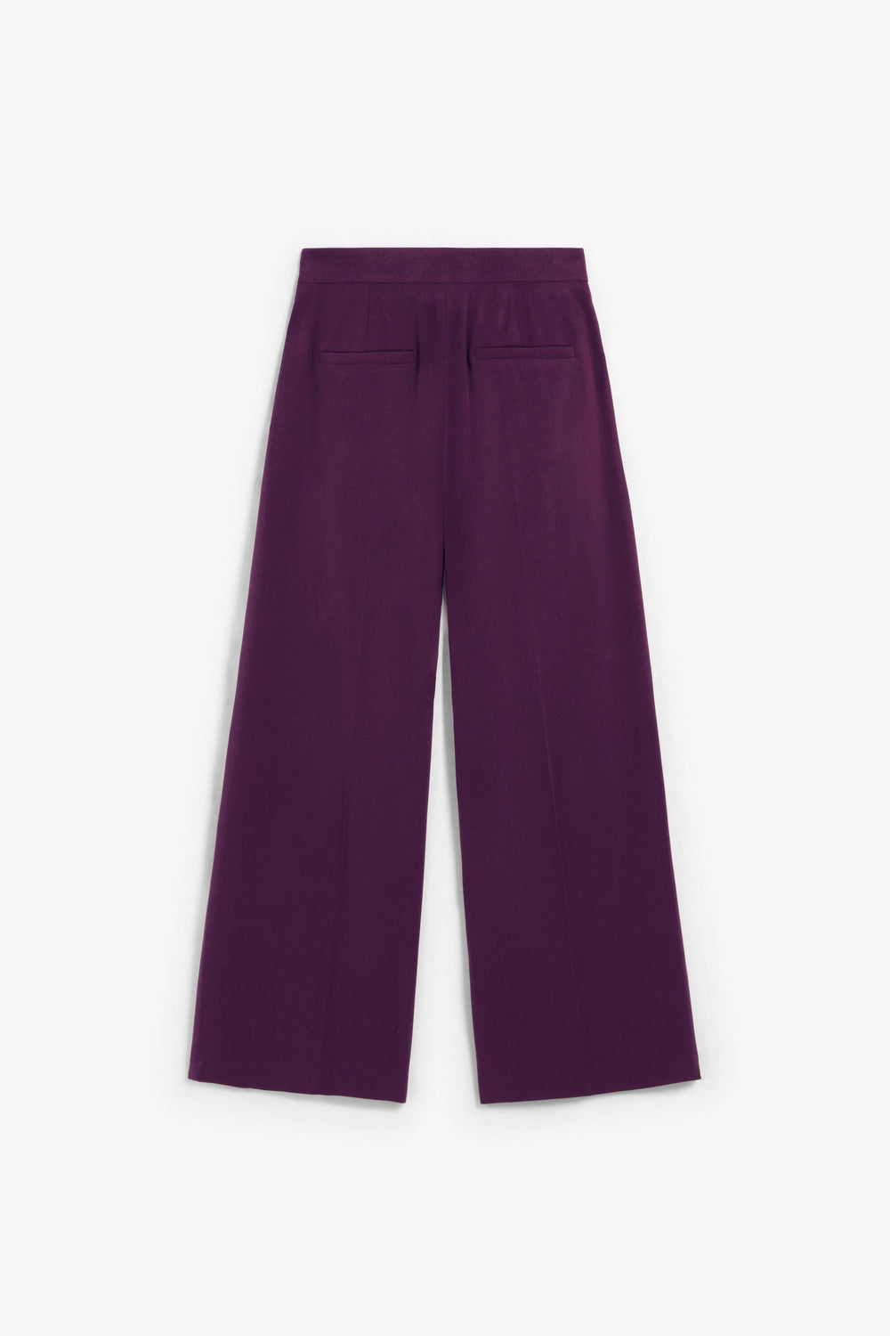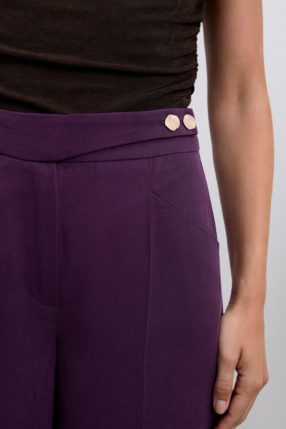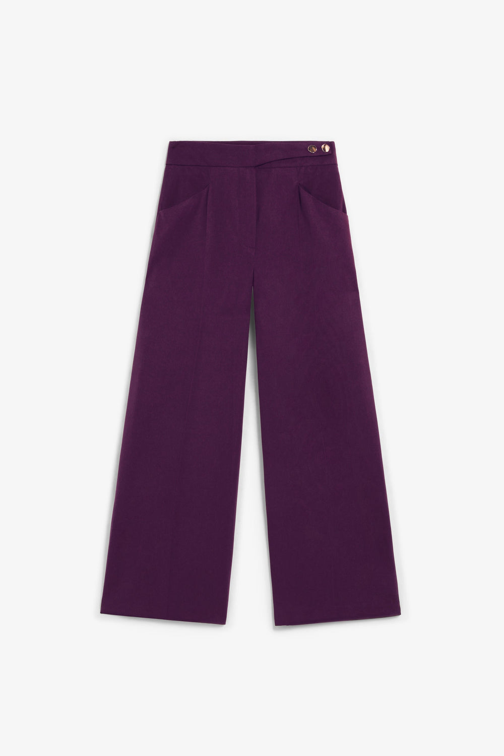 Trousers made of a viscose blend fabric with darts. Regular fit, high waist culotte style with front zip and button fastening with extended waistband. Front slant pockets and back piped seam pockets