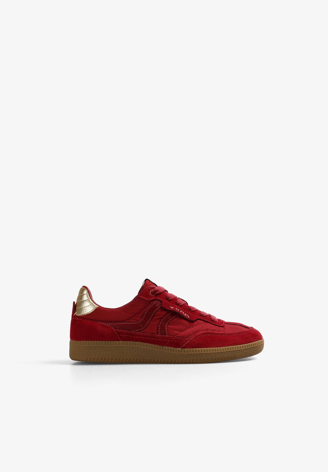 Sneakers made of a suede blend. Round toe. Logo on the side and tongue. Printed skull on the heel. Contrast metallic heel Lace-up fastening.