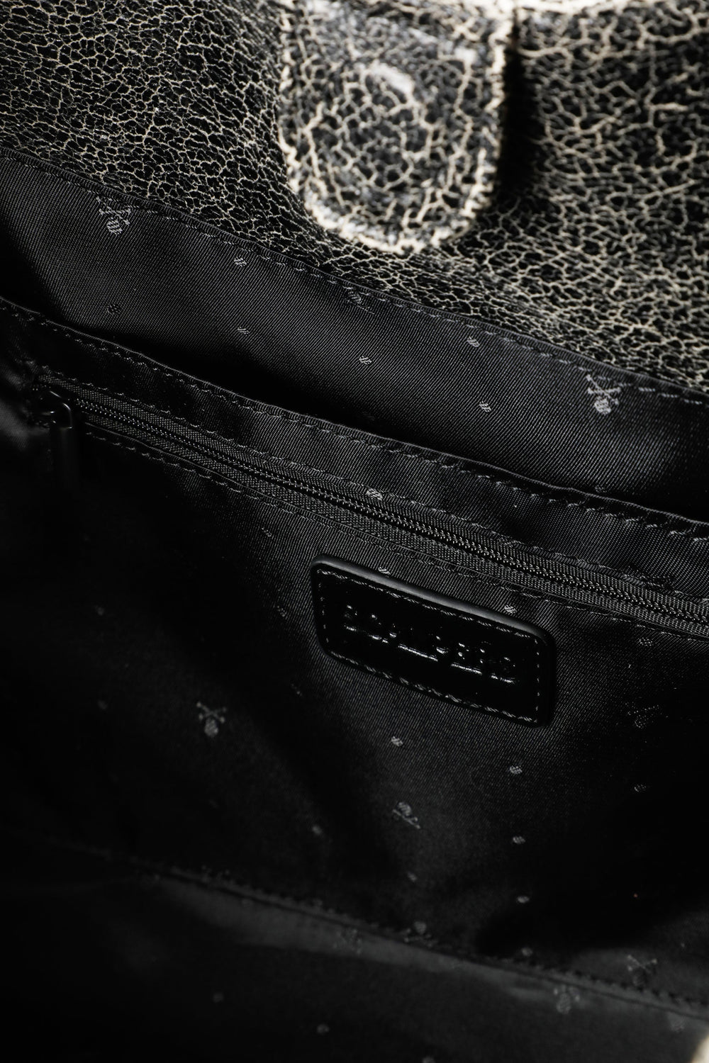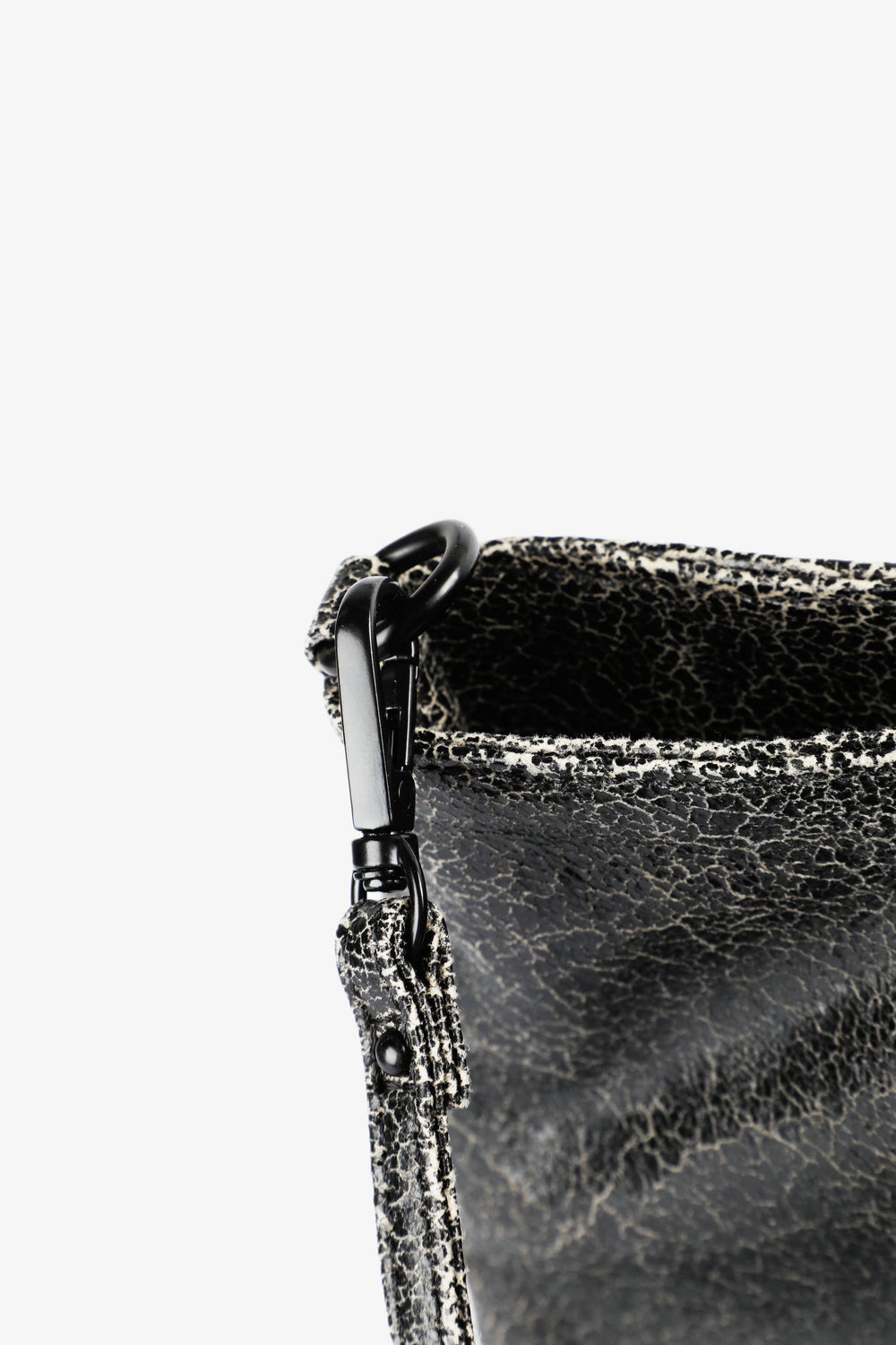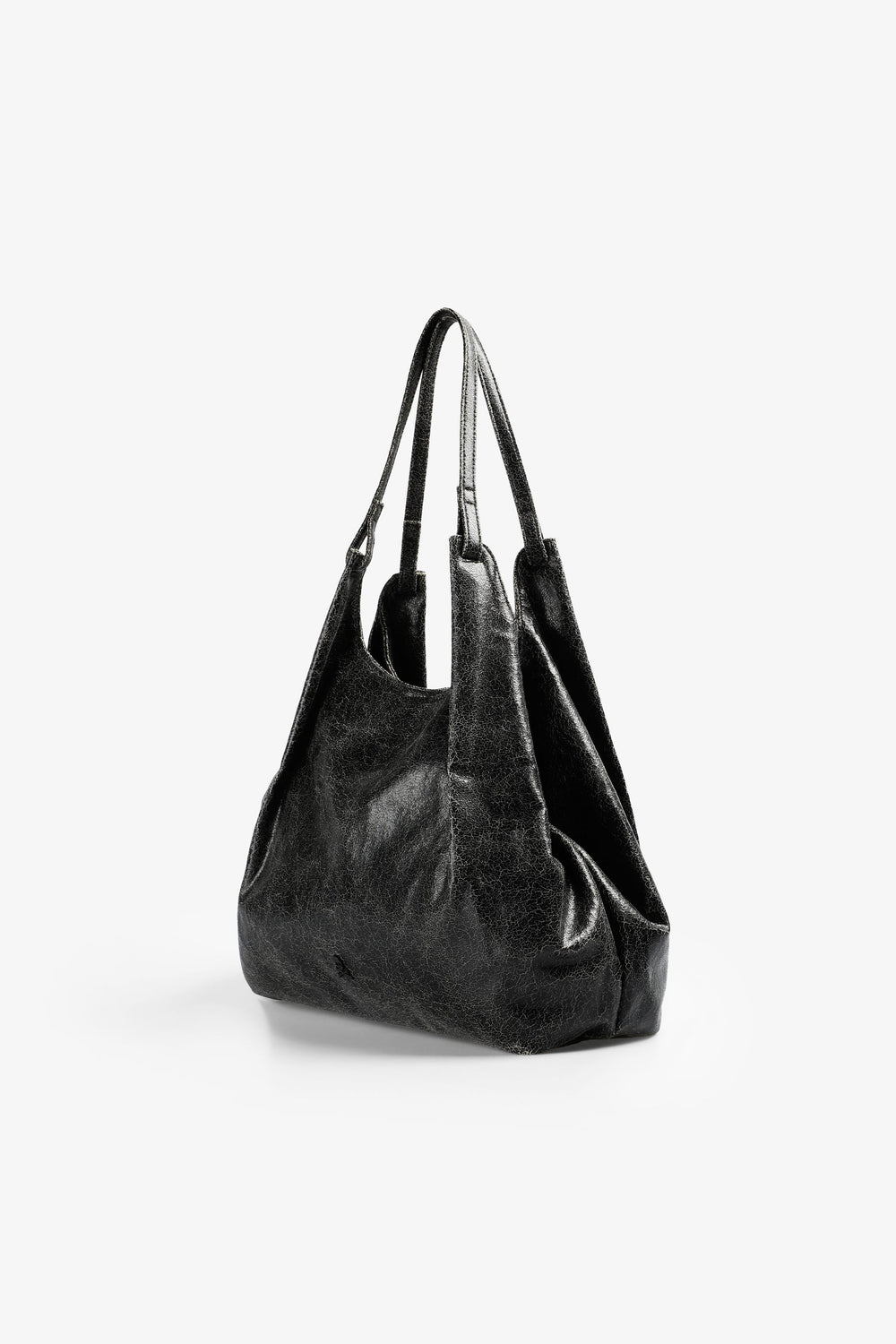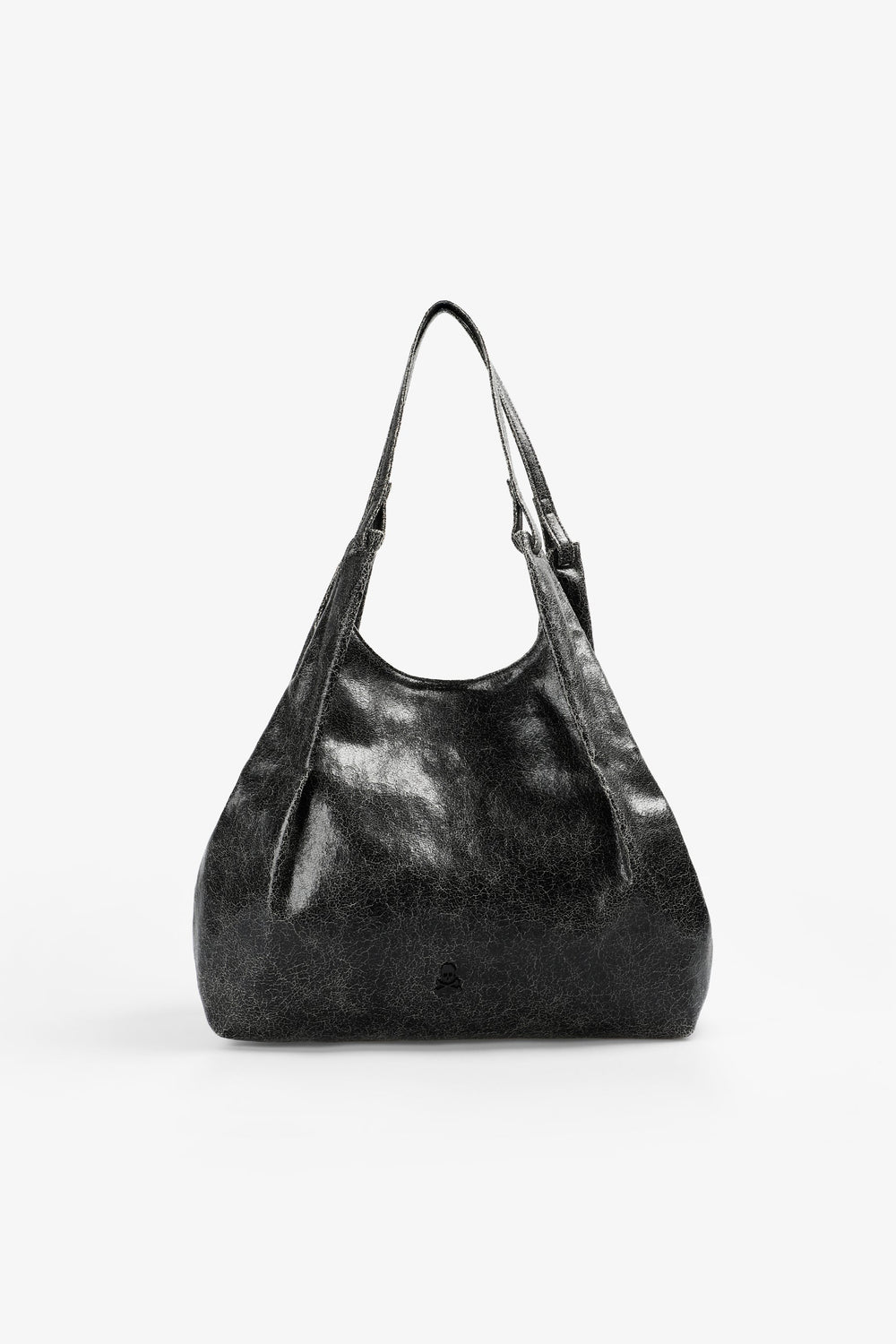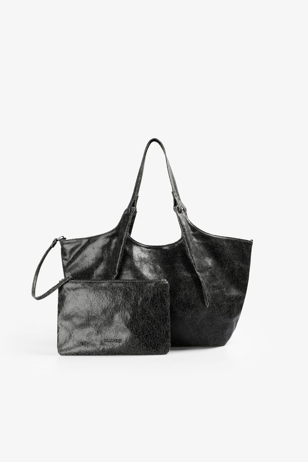 Metallic shopper bag made in PU with worn effect. Inner lining with zipped pocket. Removable matching clutch. Magnetic button fastening. Front logo detail.