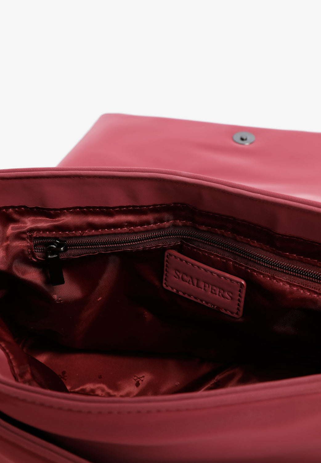 Bag made of polyurethane. Magnetic button fastening. Short braided handle with metallic details and long adjustable strap. Metallic patch with skull on front. Inner lining and pocket with zip closure and logo detail.