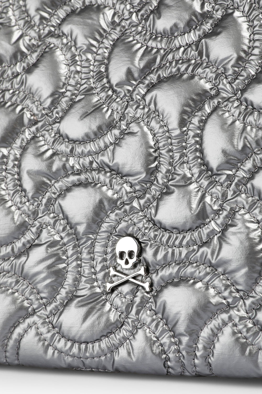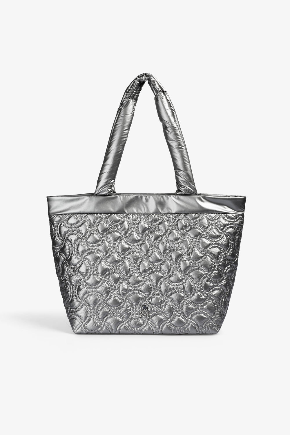 Quilted tote bag. Double strap. Magnetic button closure. Lining and inside pocket with zip closure. Logo detail on pocket and metallic skull patch on front.